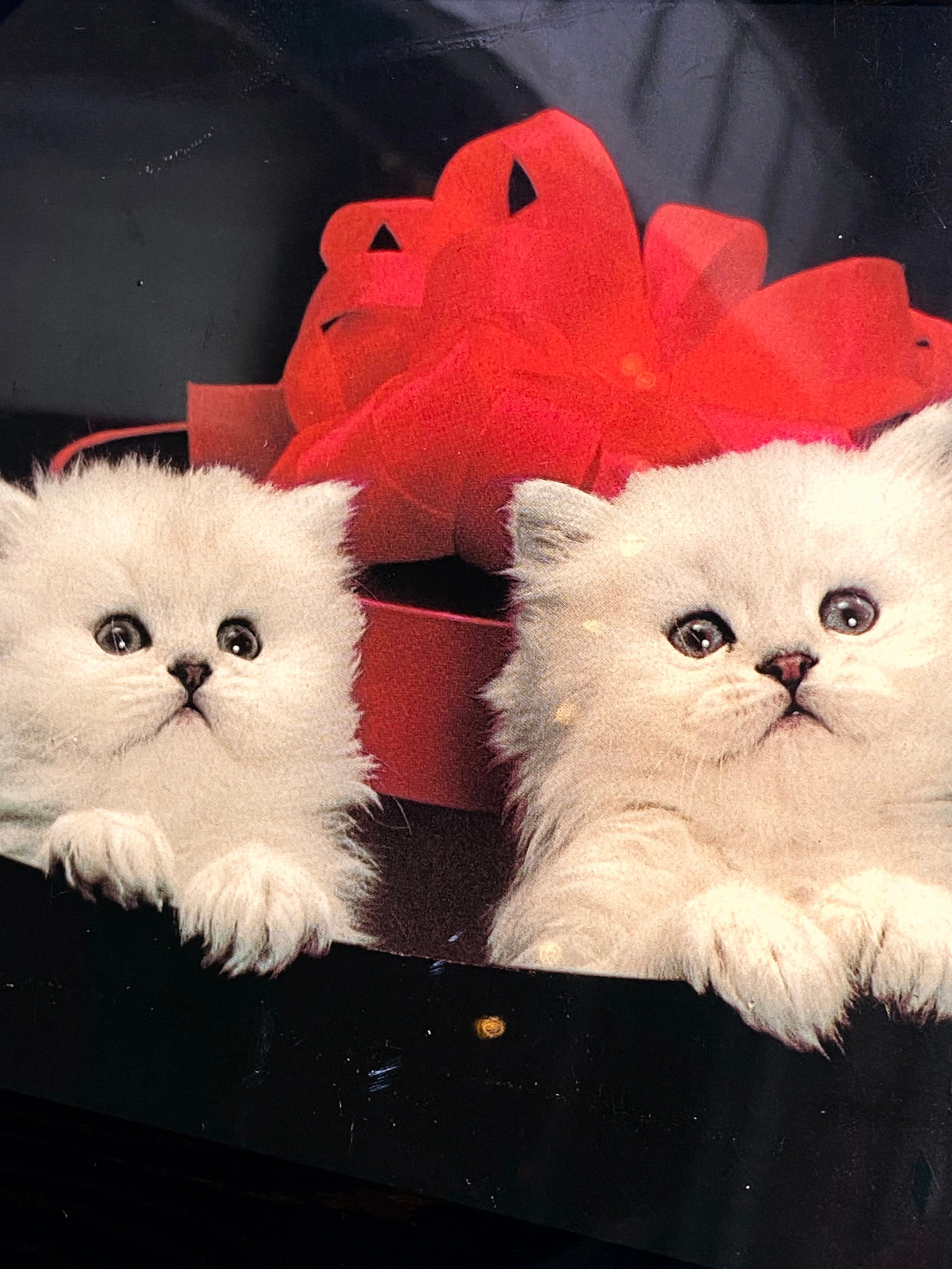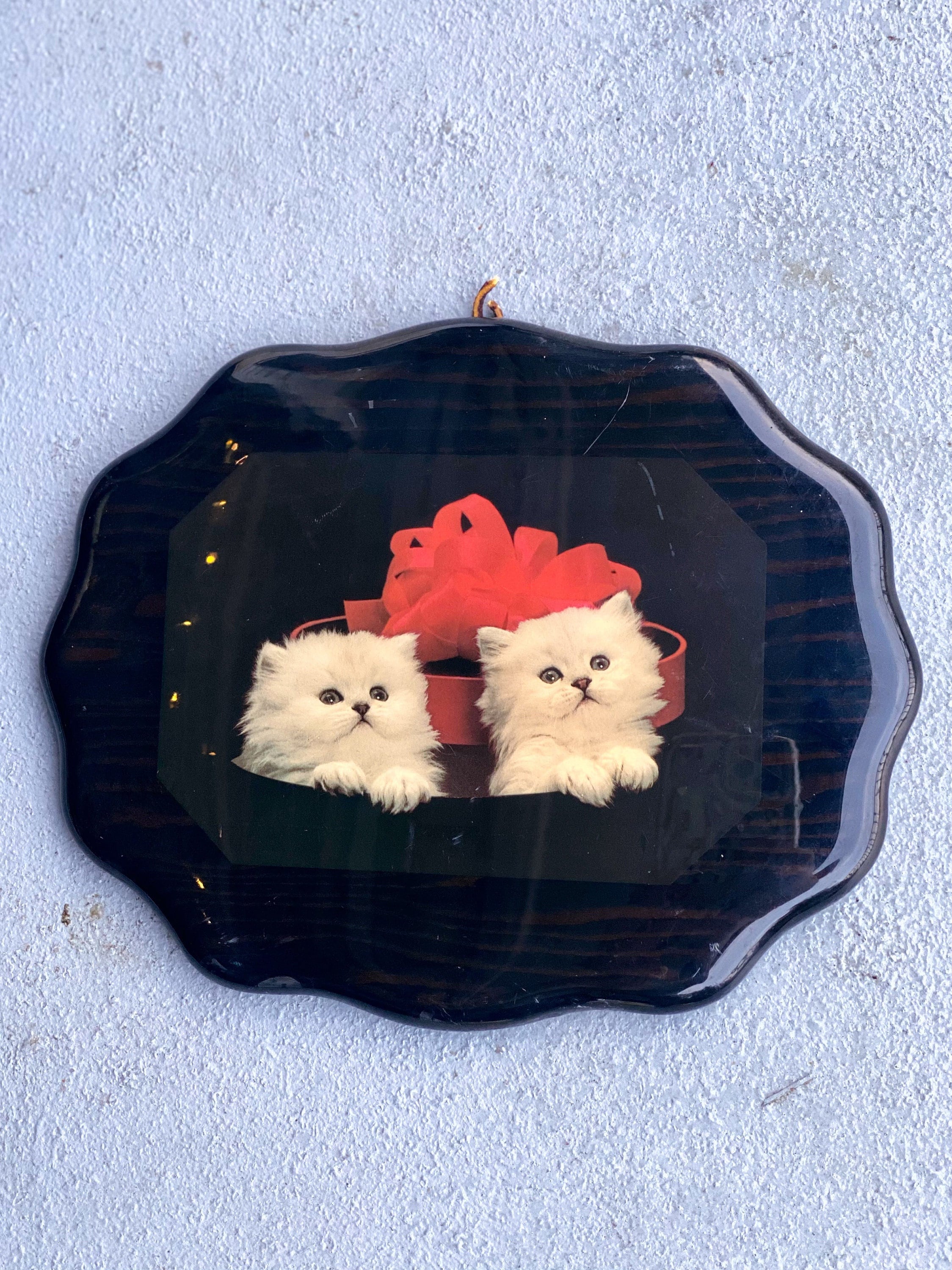 Vintage Dencraft kitten wall plaque. Resin print on wood with rippled edge. So 70's tacky-cute!