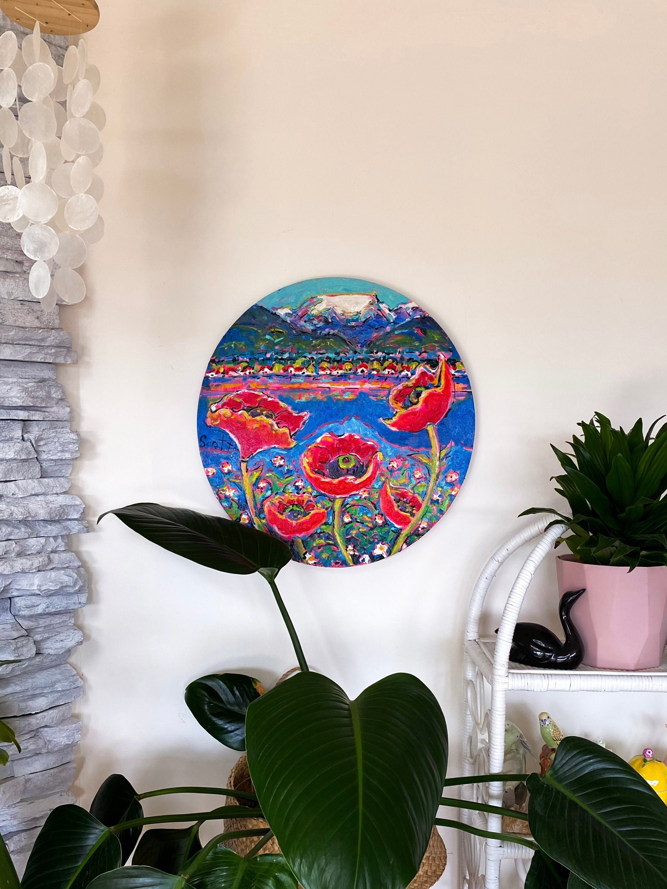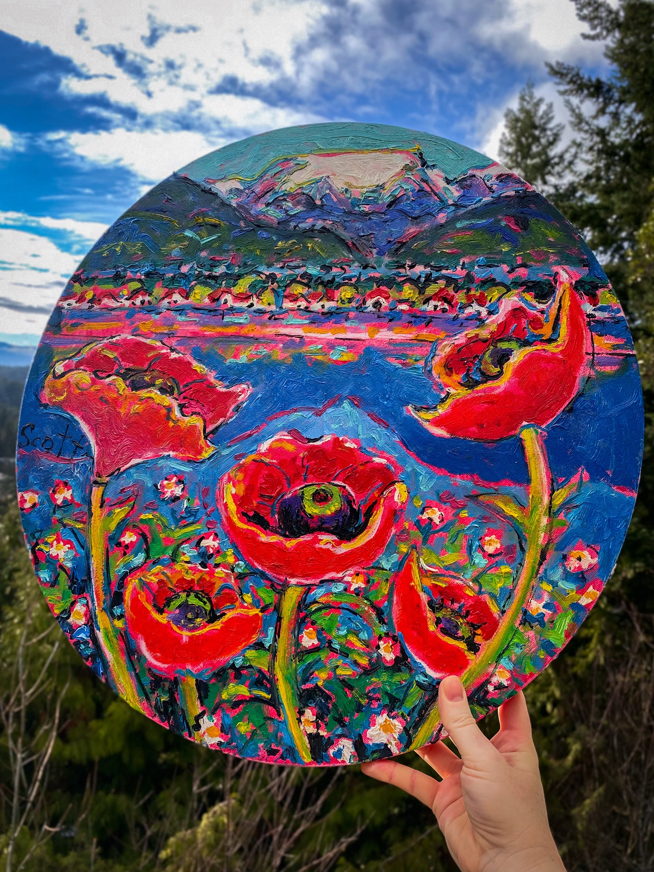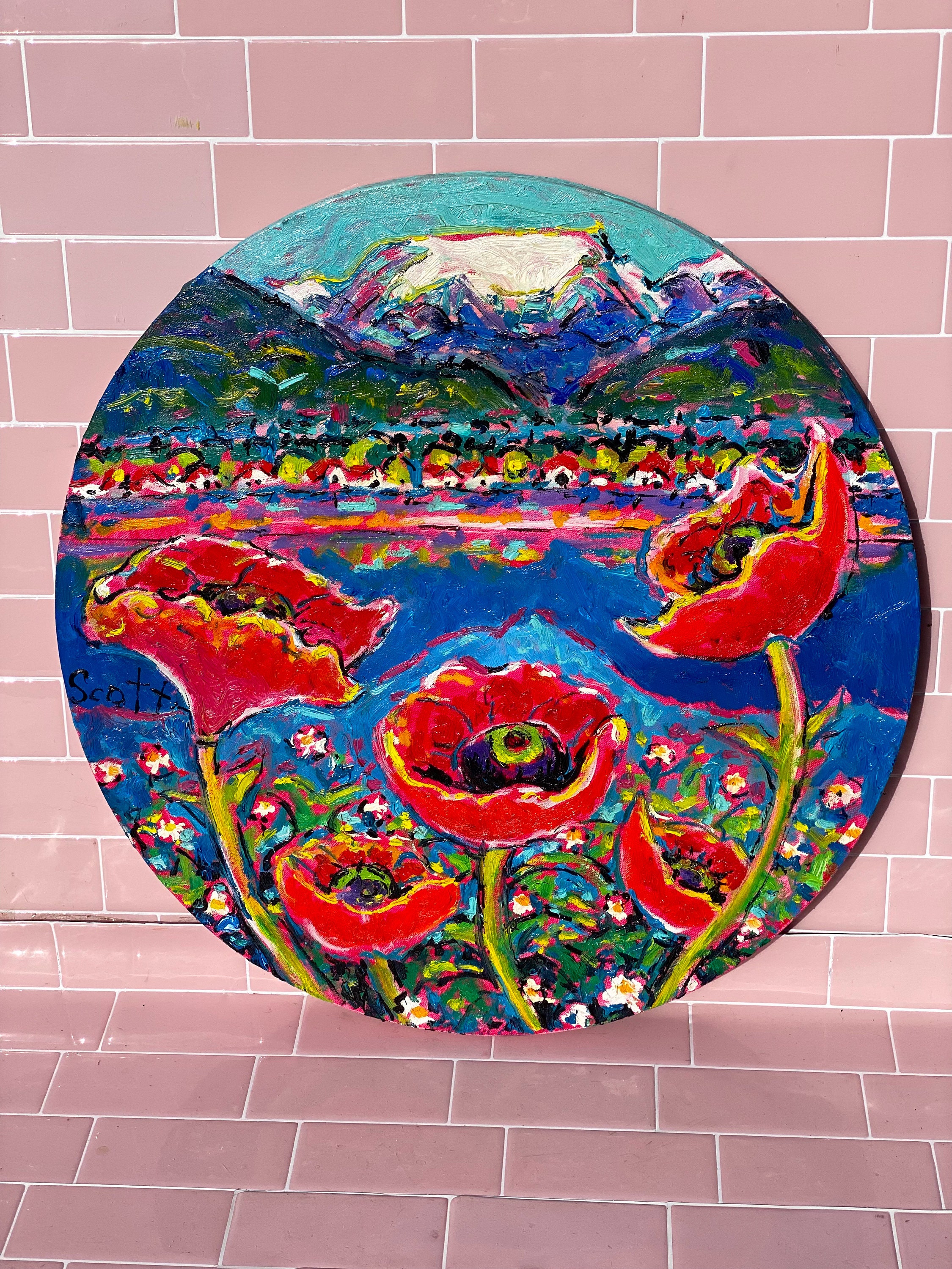 Large original Comox Glacier in Comox Valley, BC painting by local artist Brian Scott. Lots of texture, looks like oils but most likely acrylic. Large round stretched canvas with a wire, ready to hang. These retail for ~$2000!