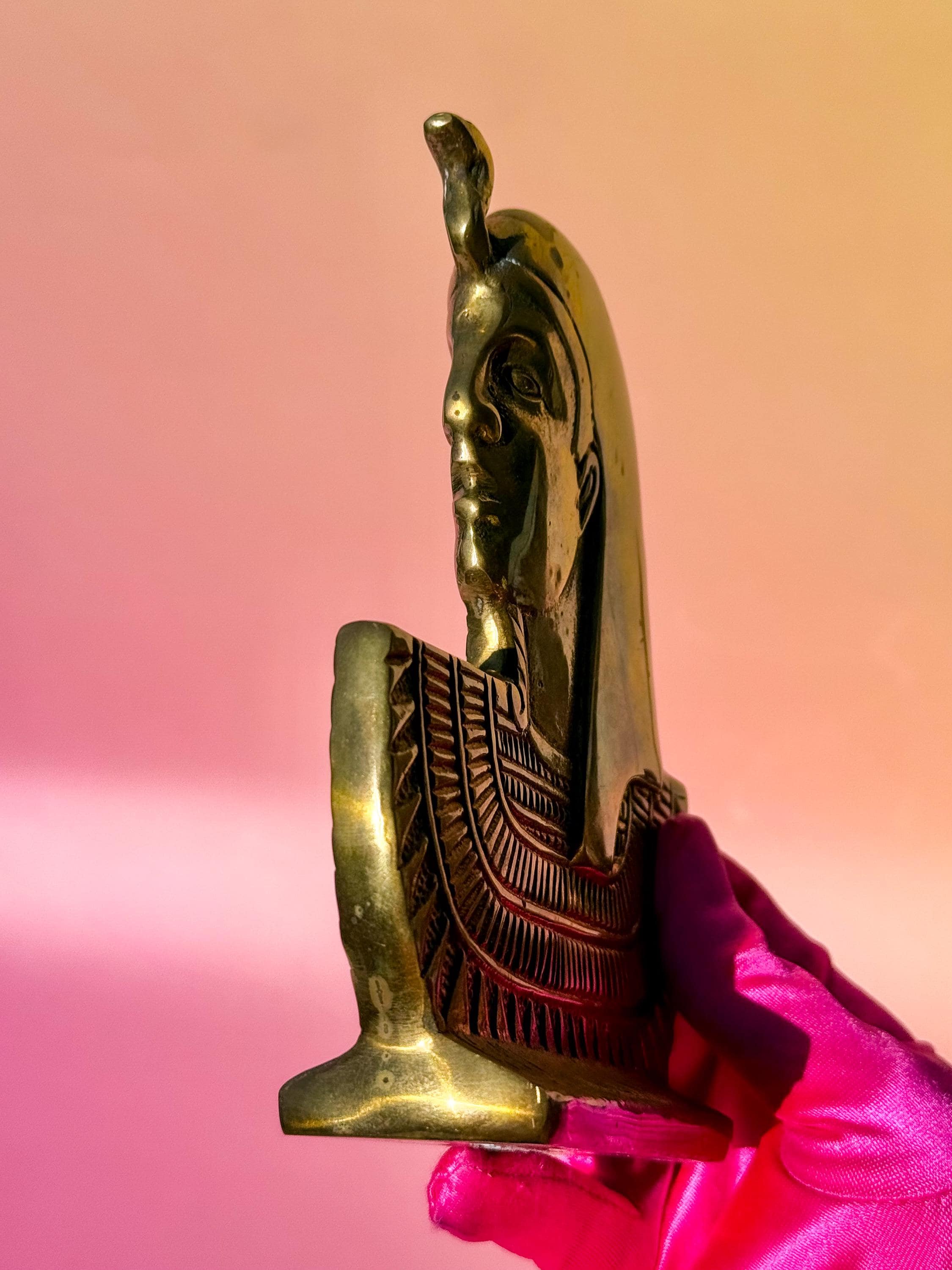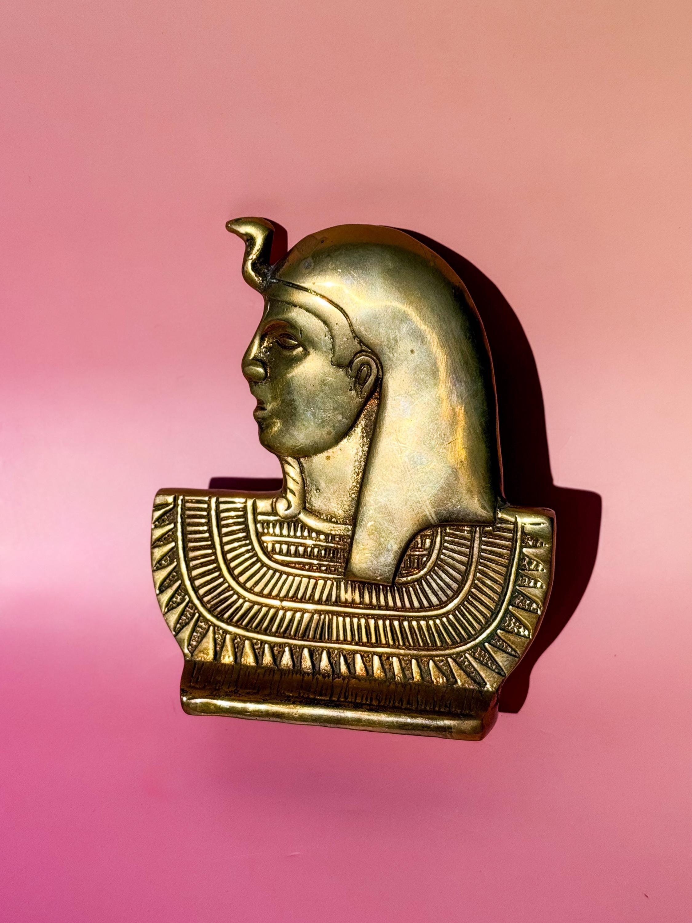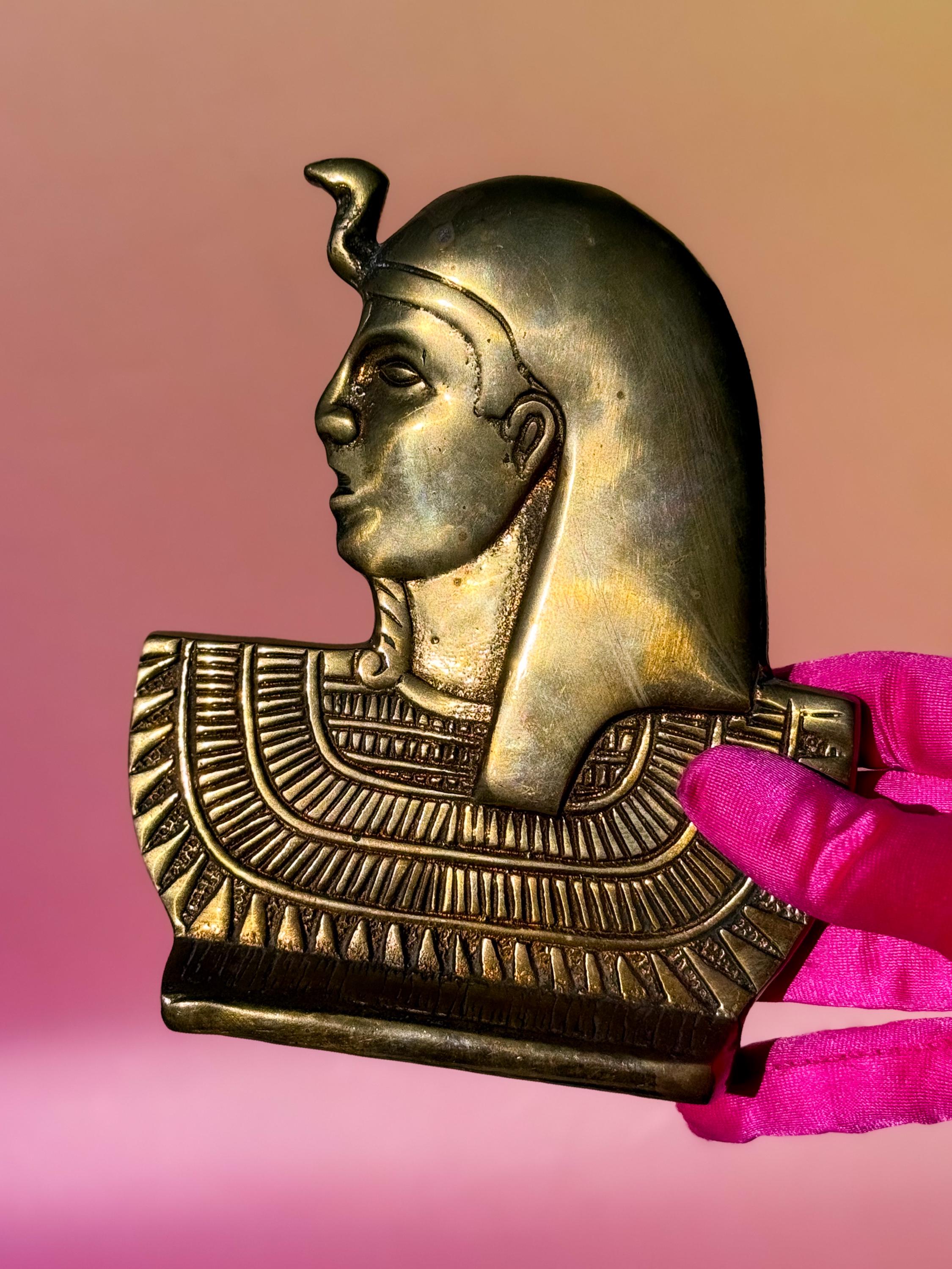 Mid century solid brass Egyptian bust. This fabulous flat bust is the Egyptian snake Goddess Wadjet- protector and goddess of heat & fire. It has awesome detail & a nice light patina.