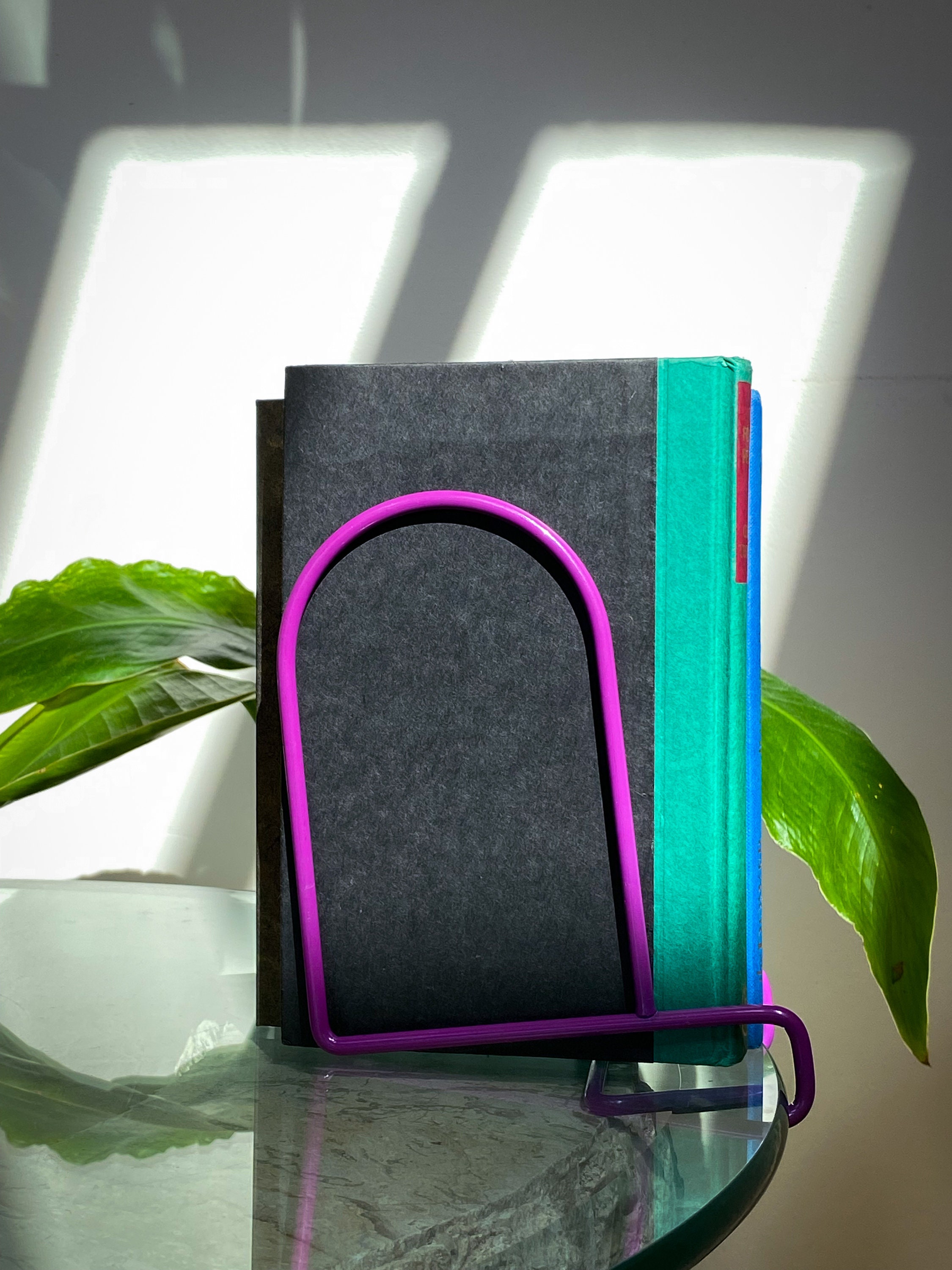 1960’s Kajsa & Nils Strinning “Nisse” bookends, made in Denmark. A fabulous vintage find, and highly sought after. Coated metal, they clip onto the edge of a shelf/table to hold your books up or to separate a shelf. They clip on very sturdy and work great, could hold up a lot of weight, or be used as shelf dividers. Please note that I (weirdly) have no normal shelves/tables in my house, I have almost exclusively round glass shelves and tables- but the glass is thinner & they sit slightly askew, they would be straight on a standard shelf (as shown in the last photo.) These sell for $80+ elsewhere. Dimensions: arch 3.75 x 6 inches