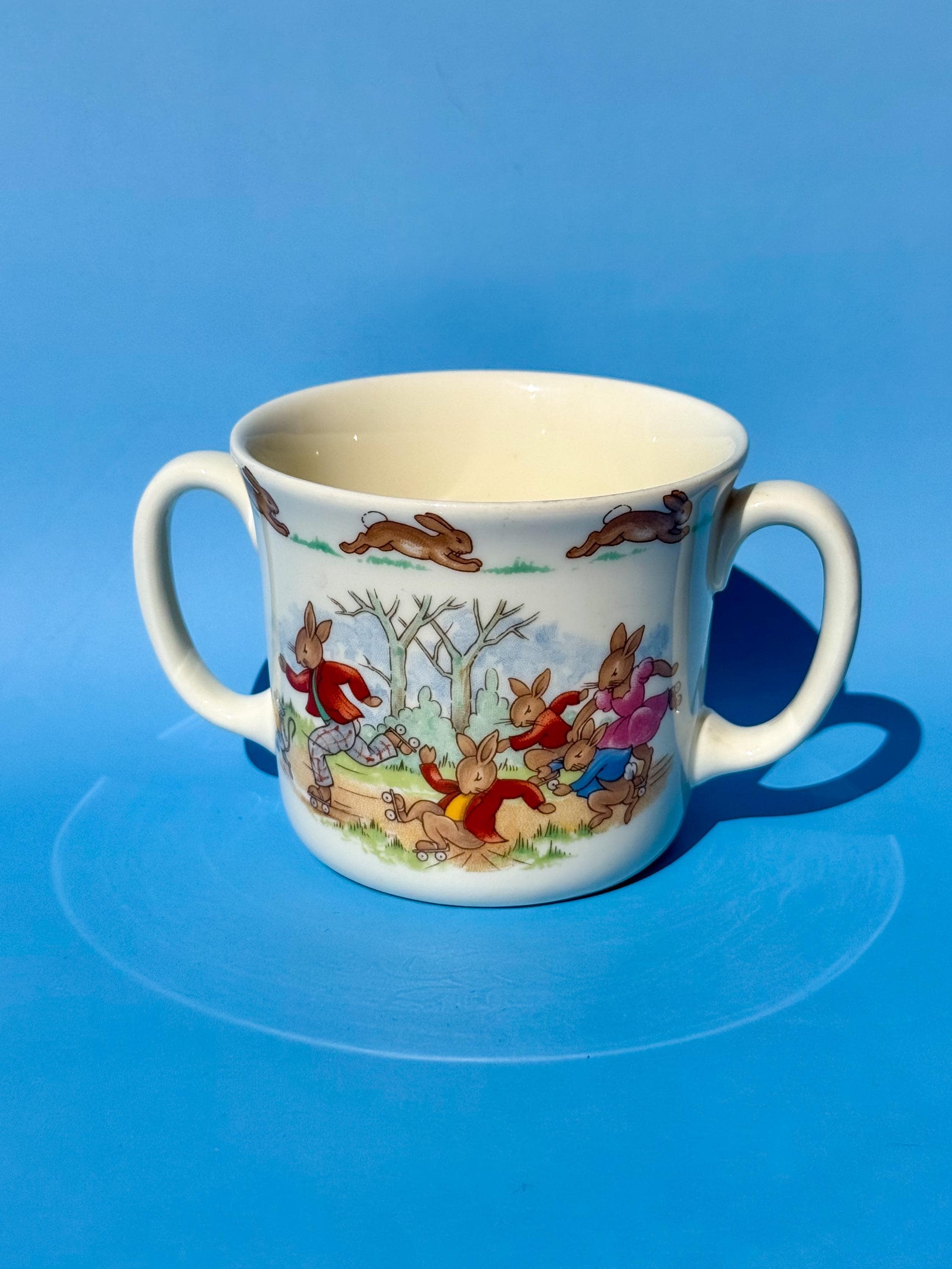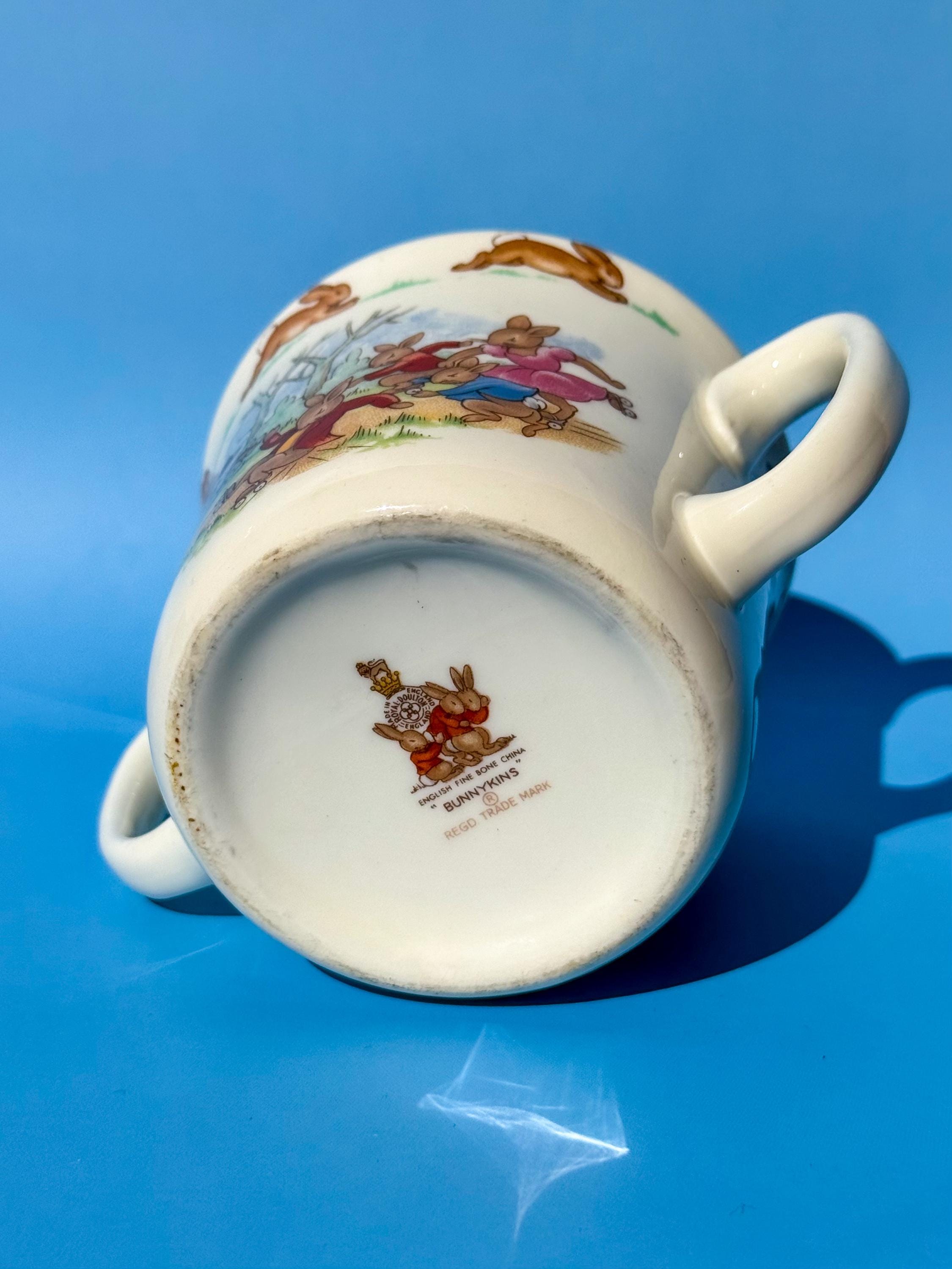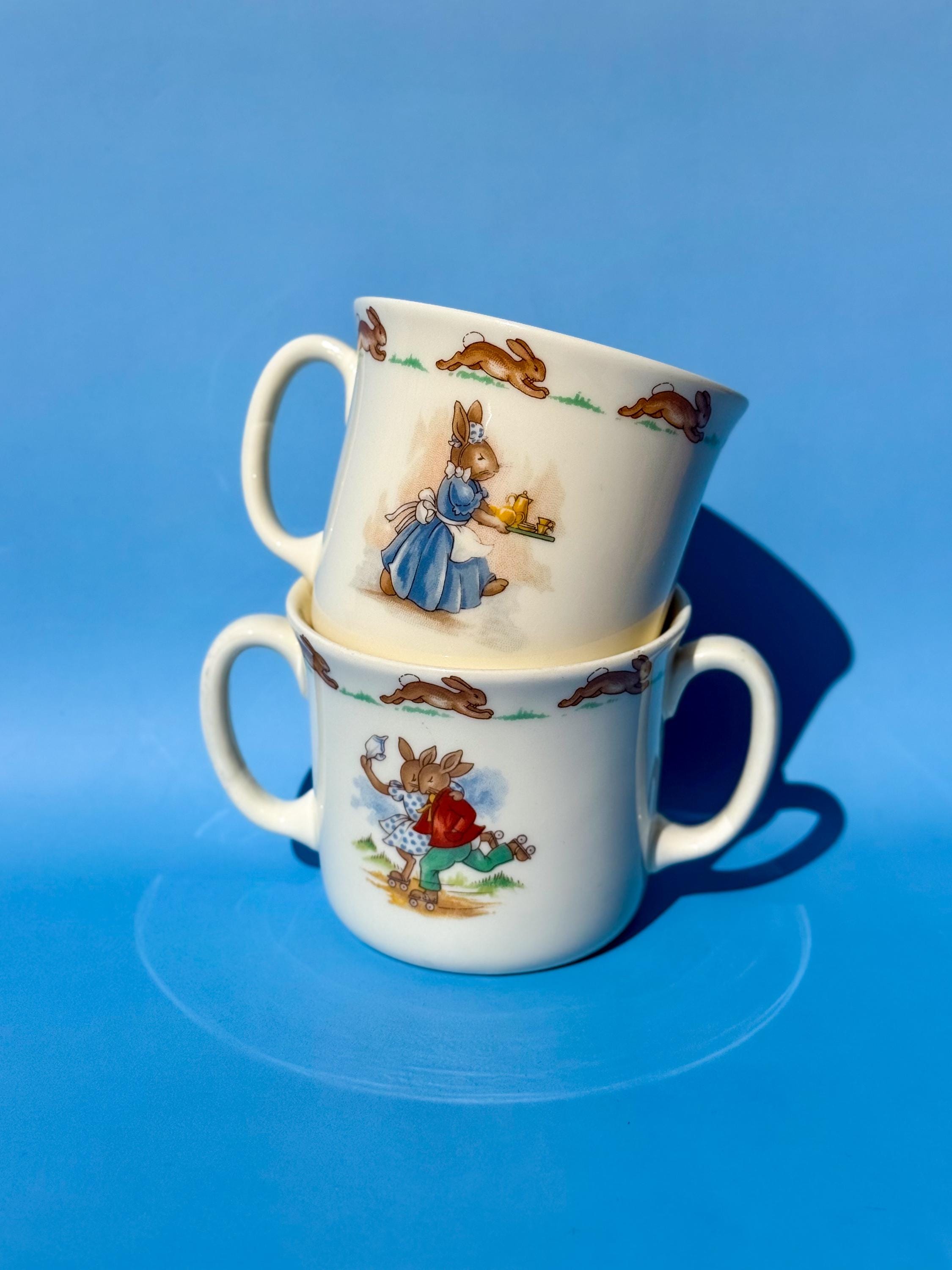 Two vintage Bunnykins mugs. English fine bone china, made by Royal Doulton. One has a standard handle, the other is sippy-cup style with two handles. No chips or cracks. Sold as a pair.