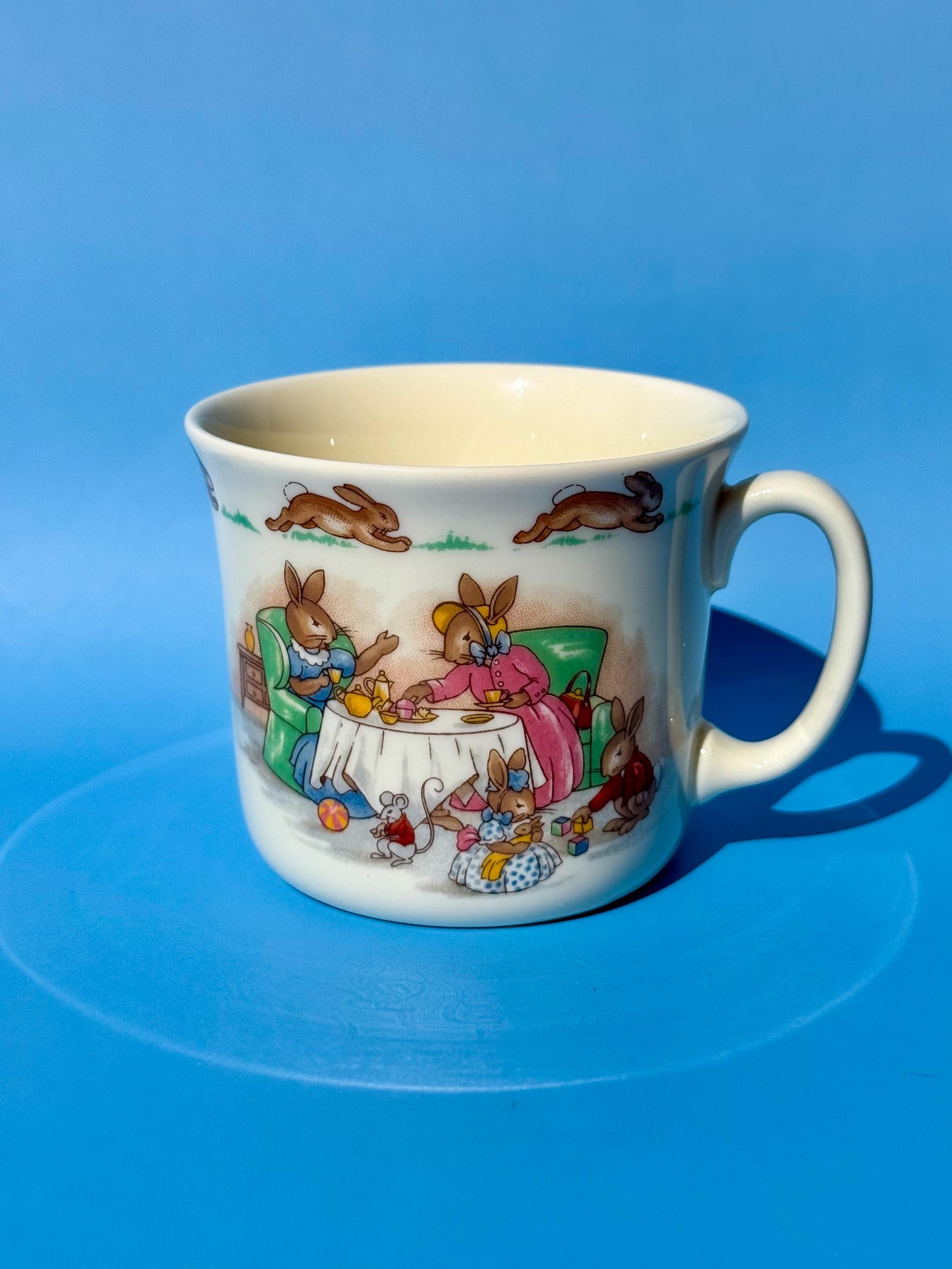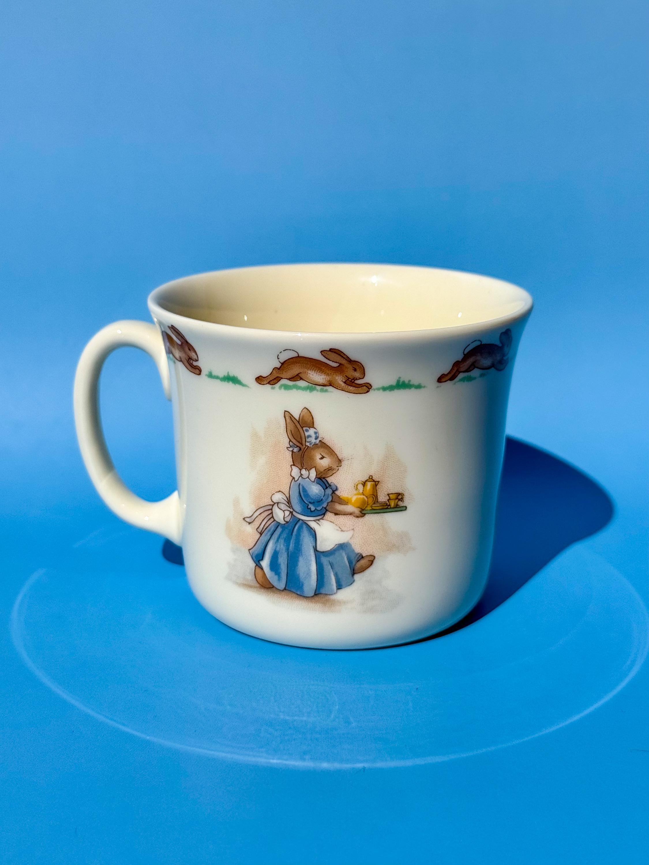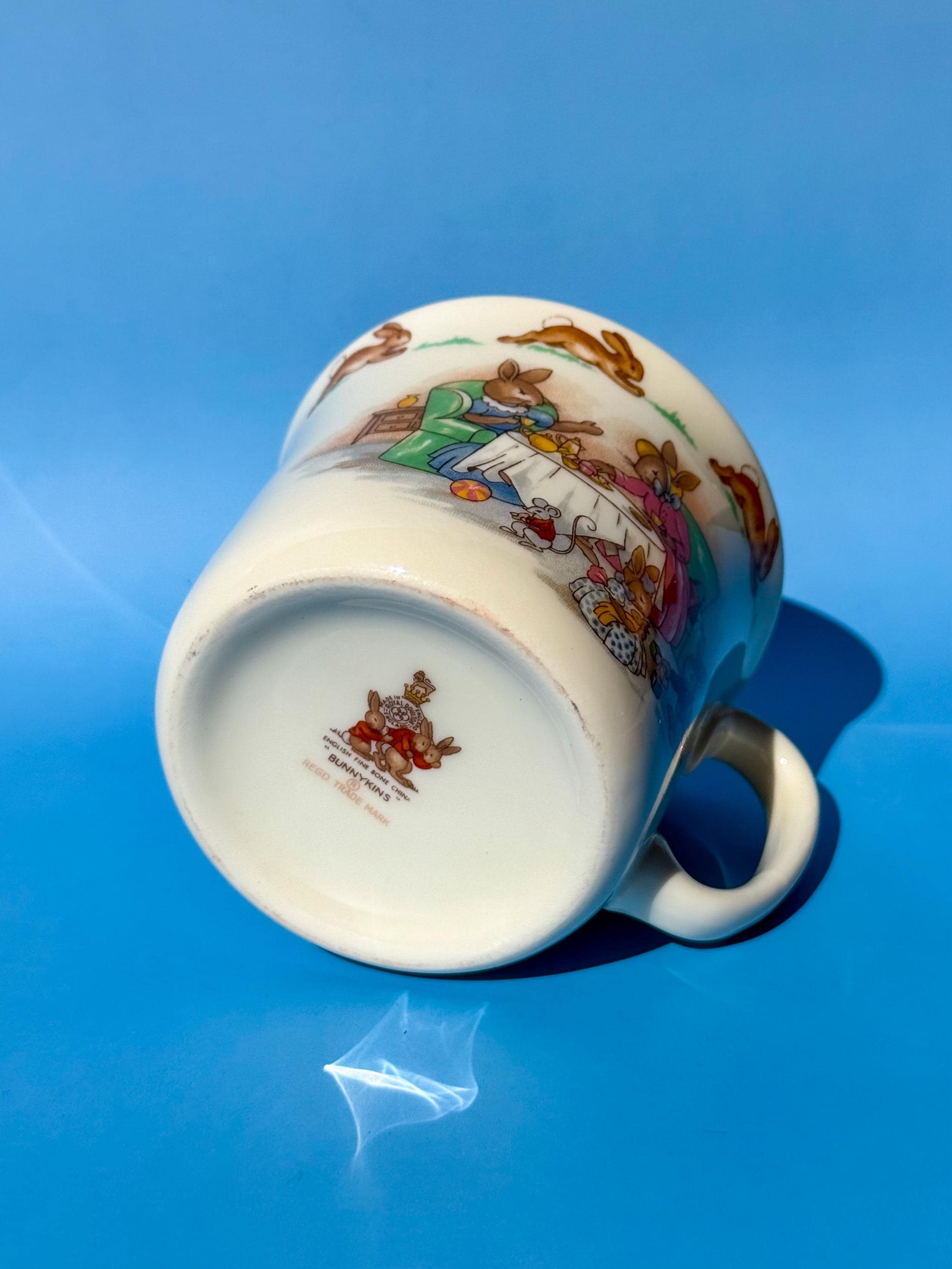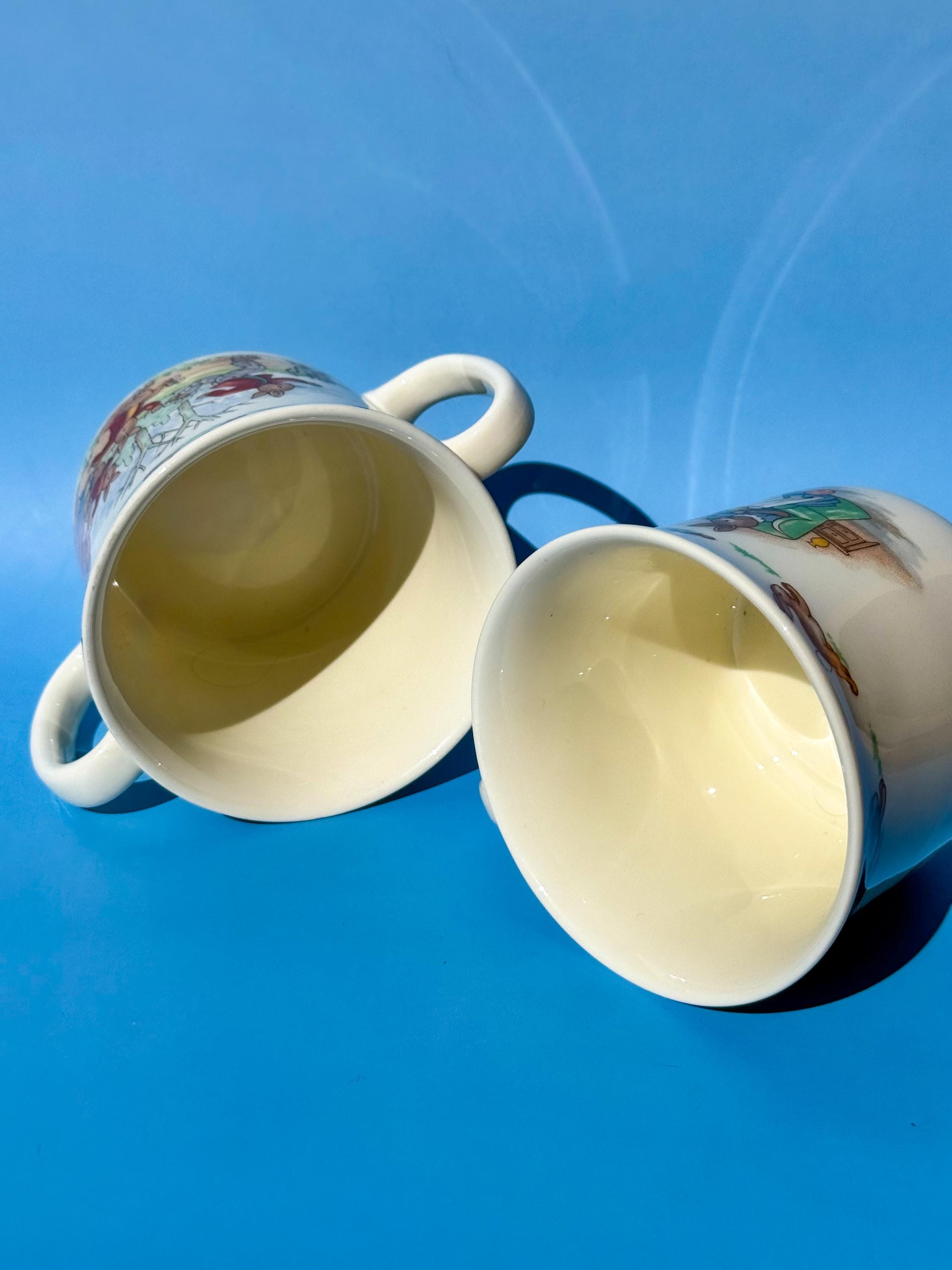 Two vintage Bunnykins mugs. English fine bone china, made by Royal Doulton. One has a standard handle, the other is sippy-cup style with two handles. No chips or cracks. Sold as a pair.