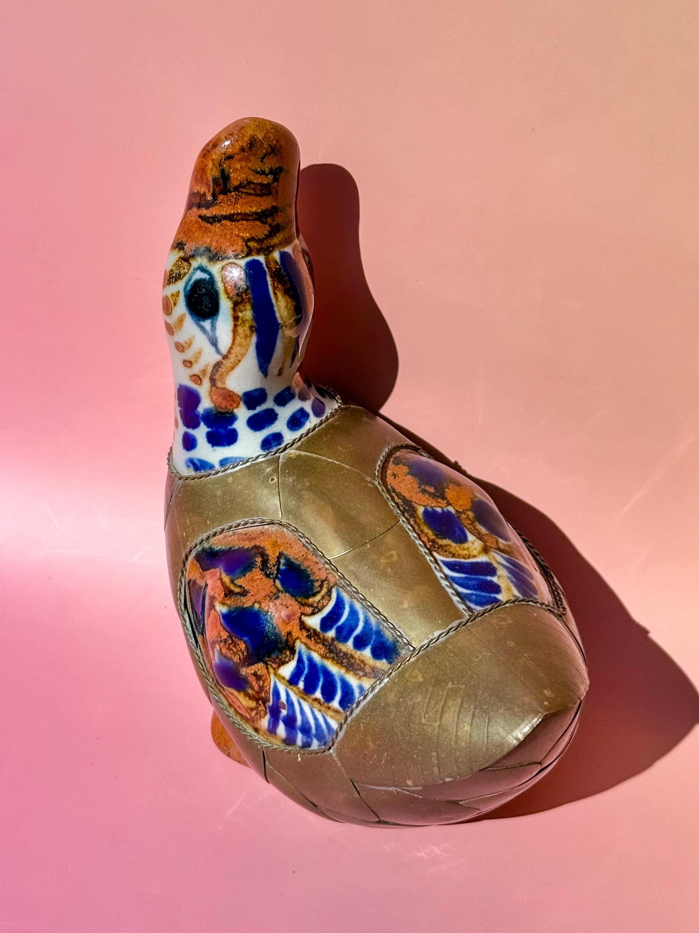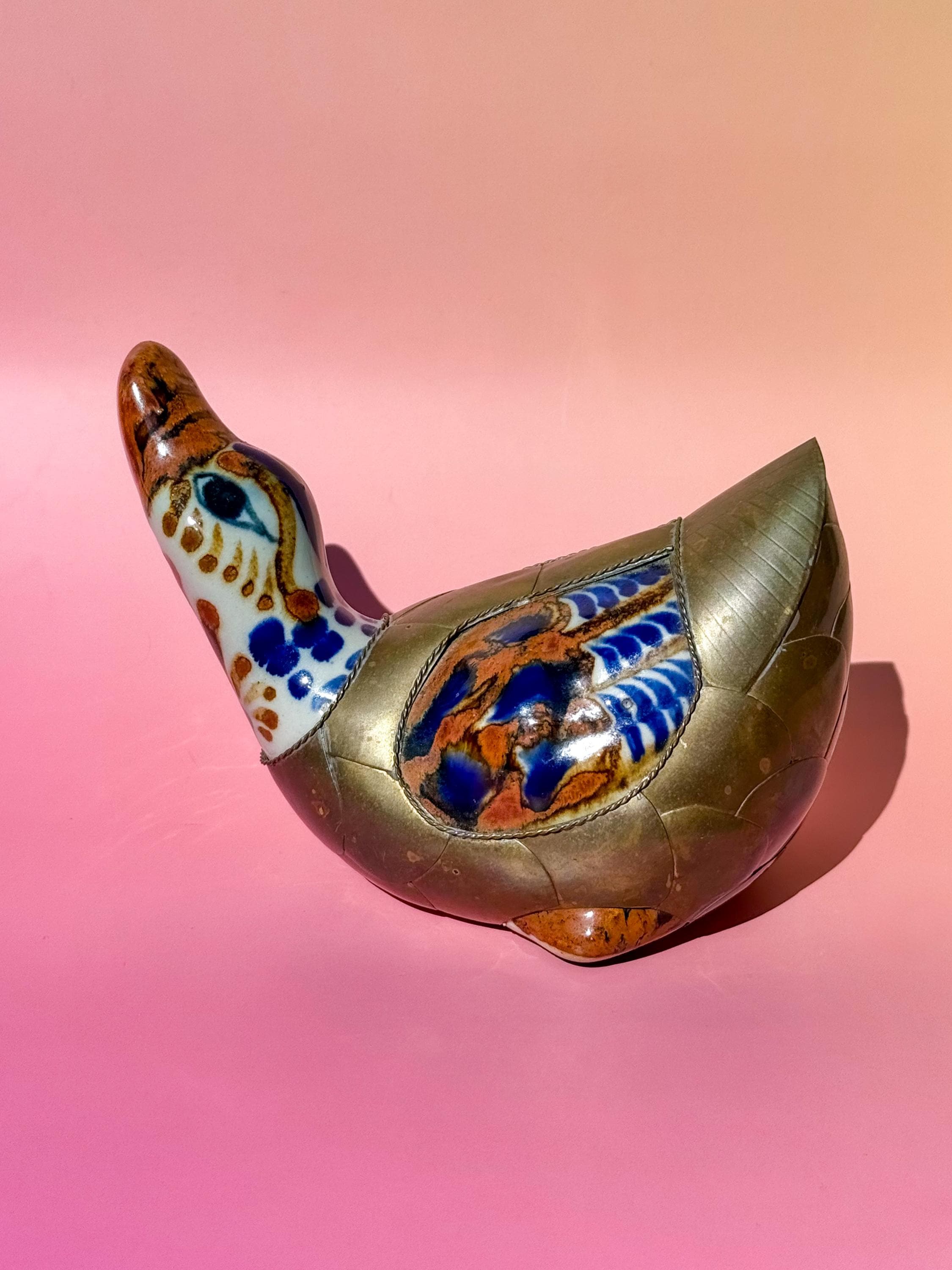 Fabulous vintage Tonala duck with handpainted porcelain & Sergio Bustemante-style brass additions. Weighty, with no chips or cracks.