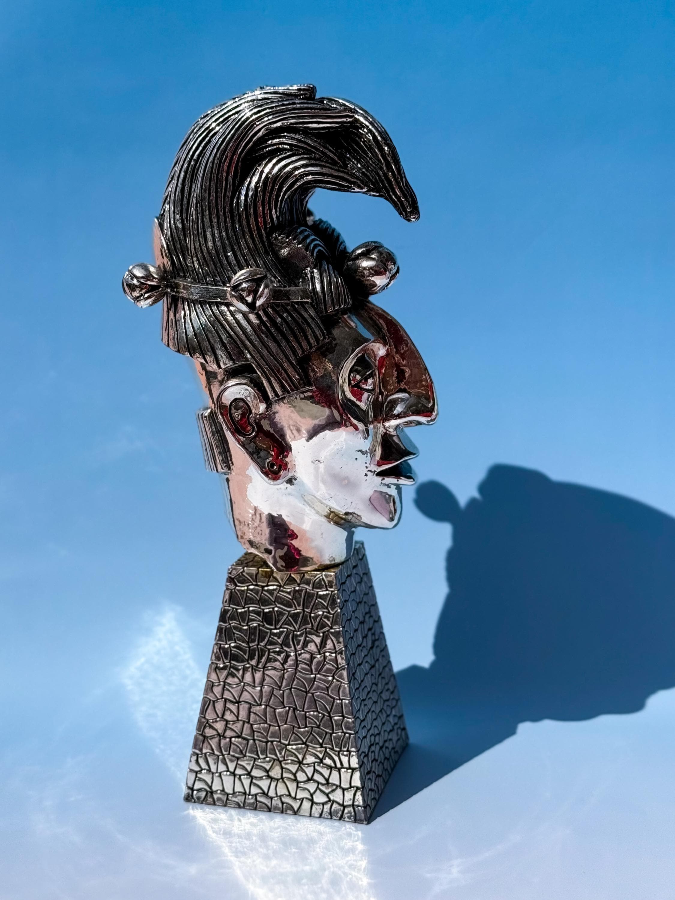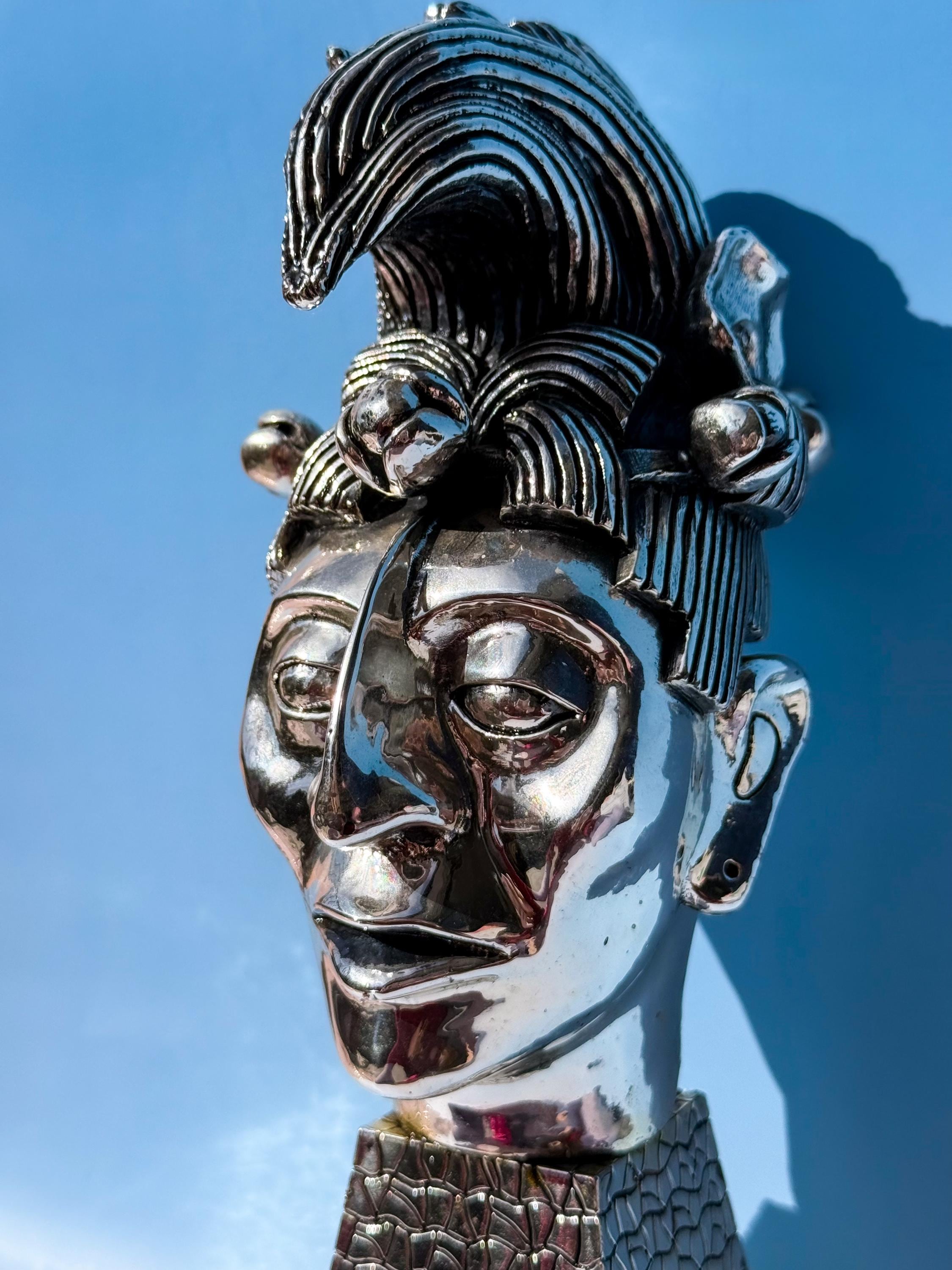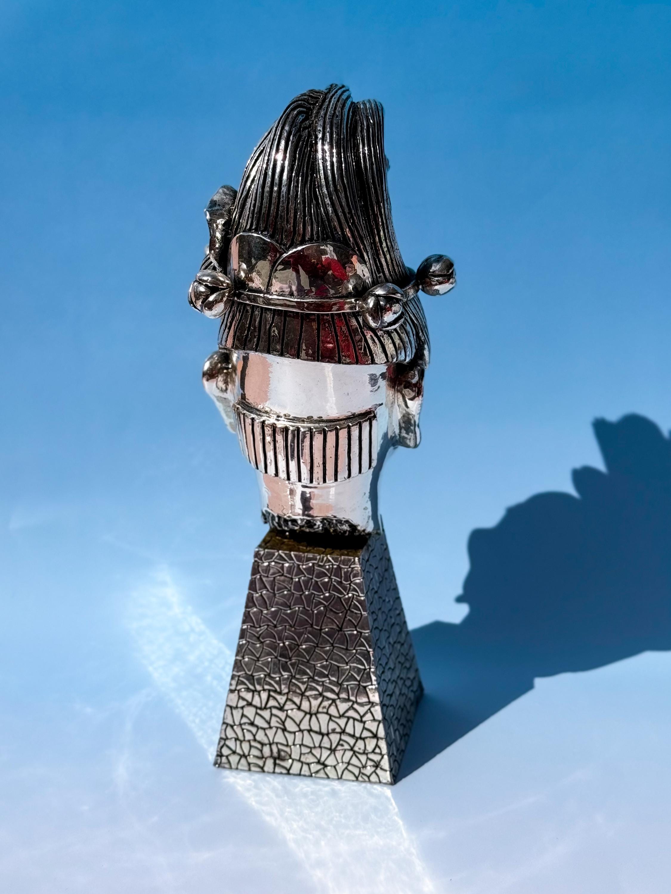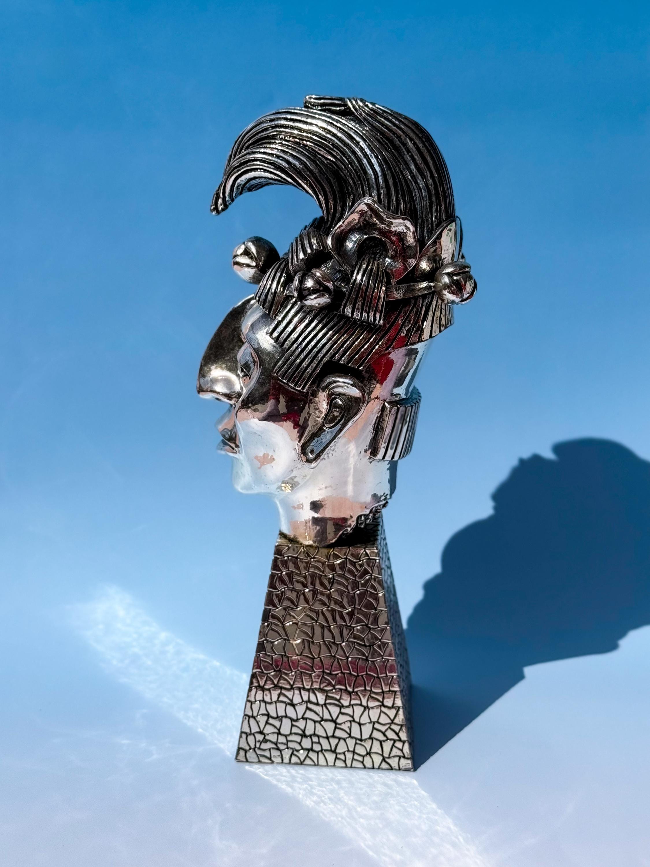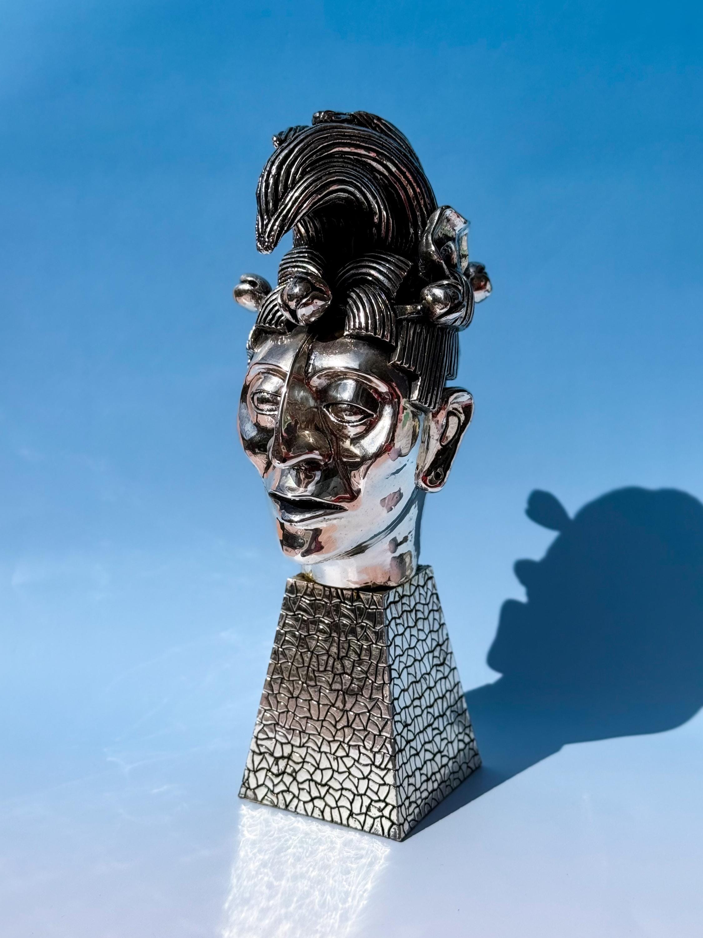 Vintage D’Argenta silverplate bust of K’inich Janaab Pakal (603-583 AD) from the Mayan Empire Collection. Super heavy & fabulous. No maker's mark, which is common for older D'rgenta pieces. It has some old glue visible in the rear crease where the head is attached to the base, but it cannot be seen from the front. In otherwise fabulous vintage condition. Market price estimated at ~$2000 USD.