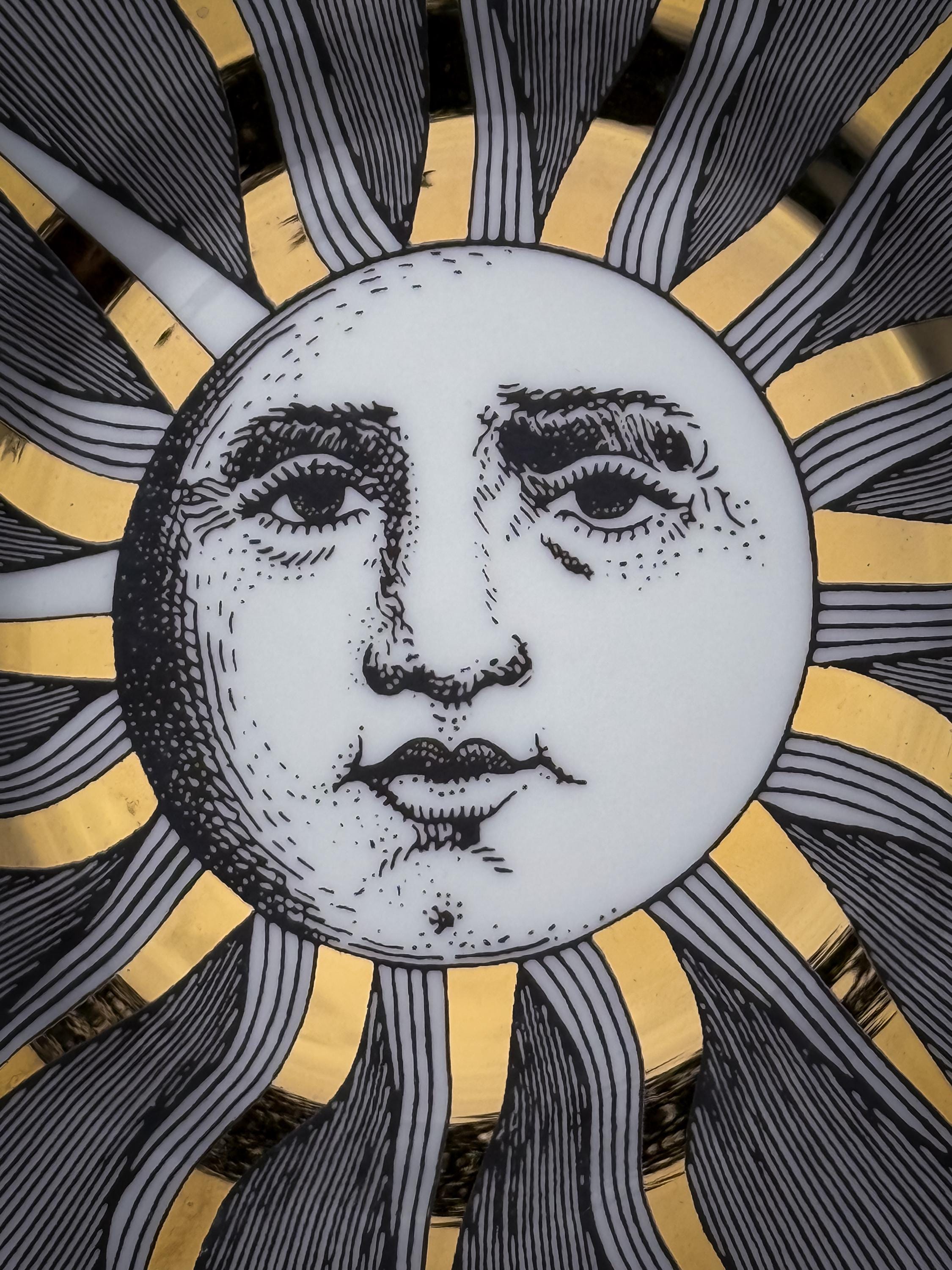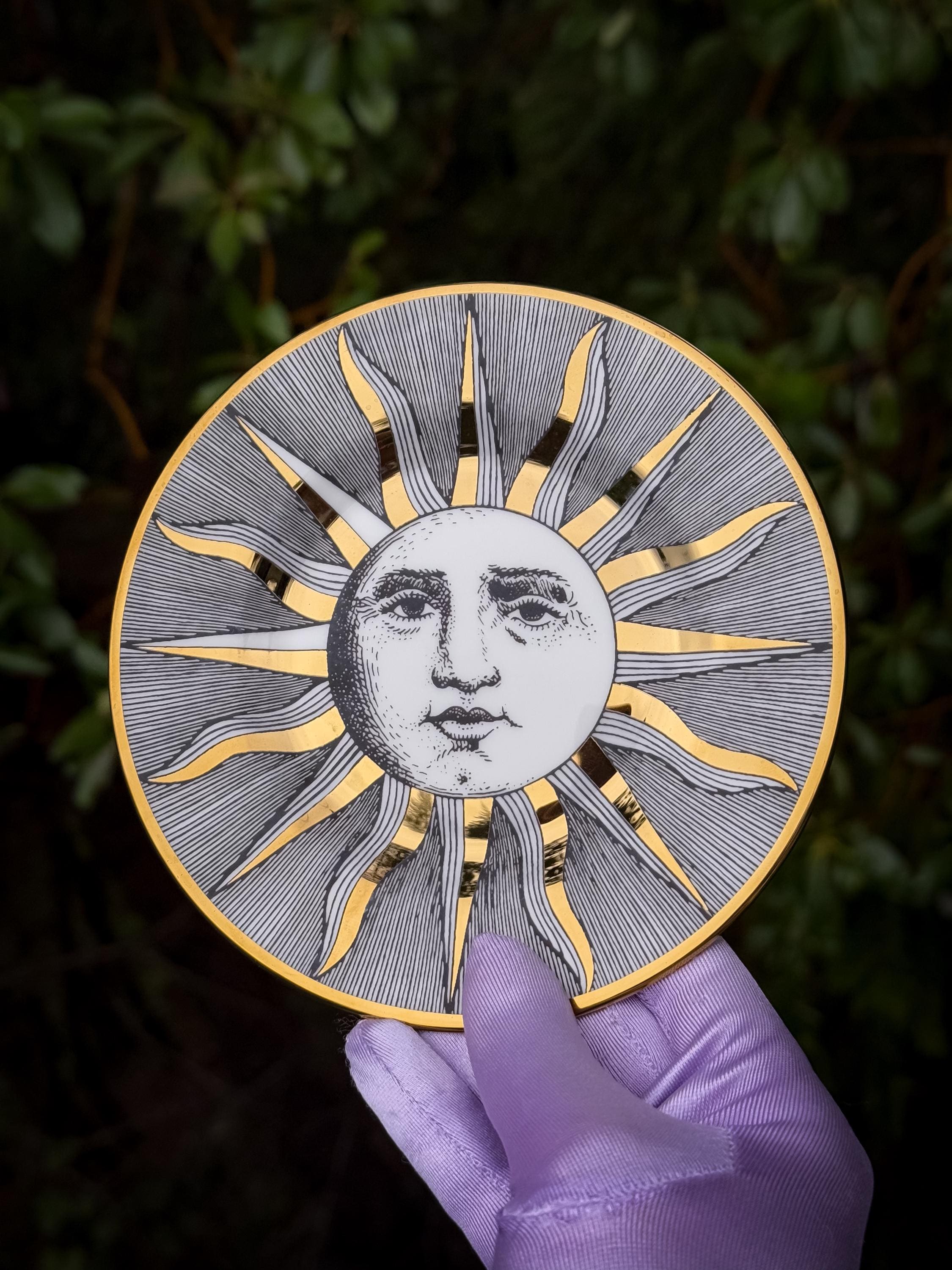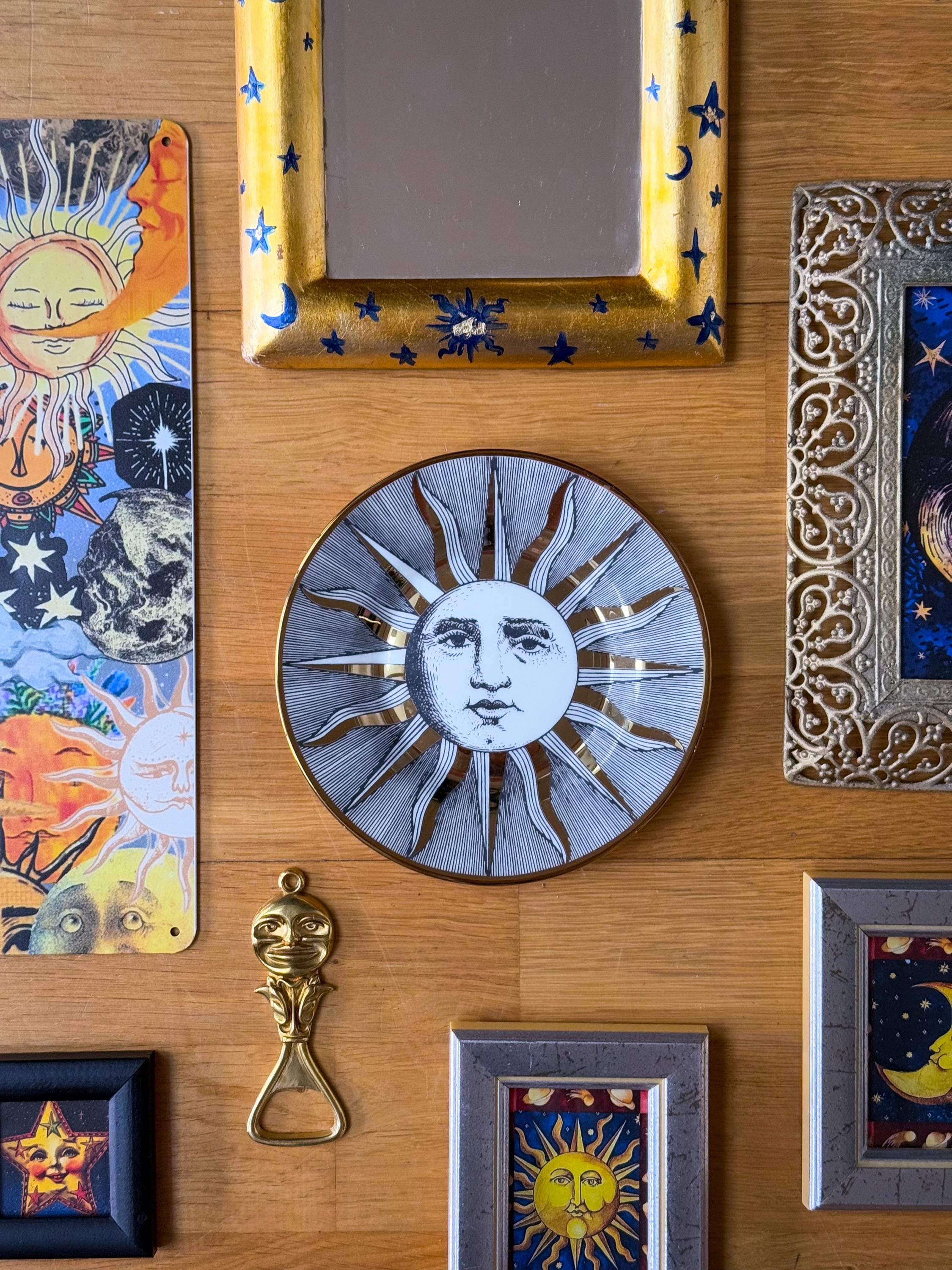 Fabulous gilded porcelain sunburst dish. Fornasetti-style, but it has no Fornasetti marking. This could be used as a trinket dish but I think it belongs on the wall! It will need a dish hanger or Command Strip tab- doesn’t come with either. No chips or cracks.