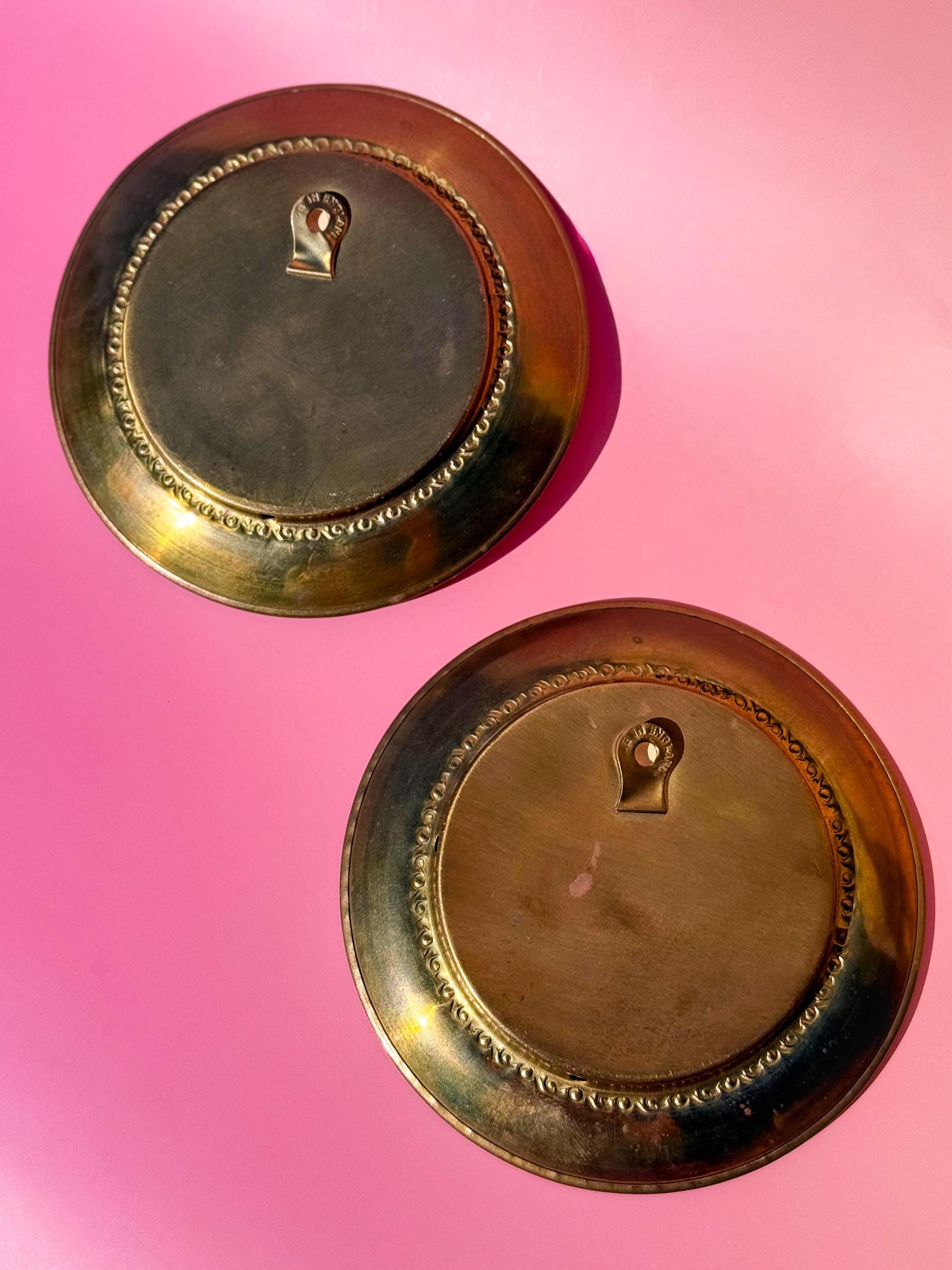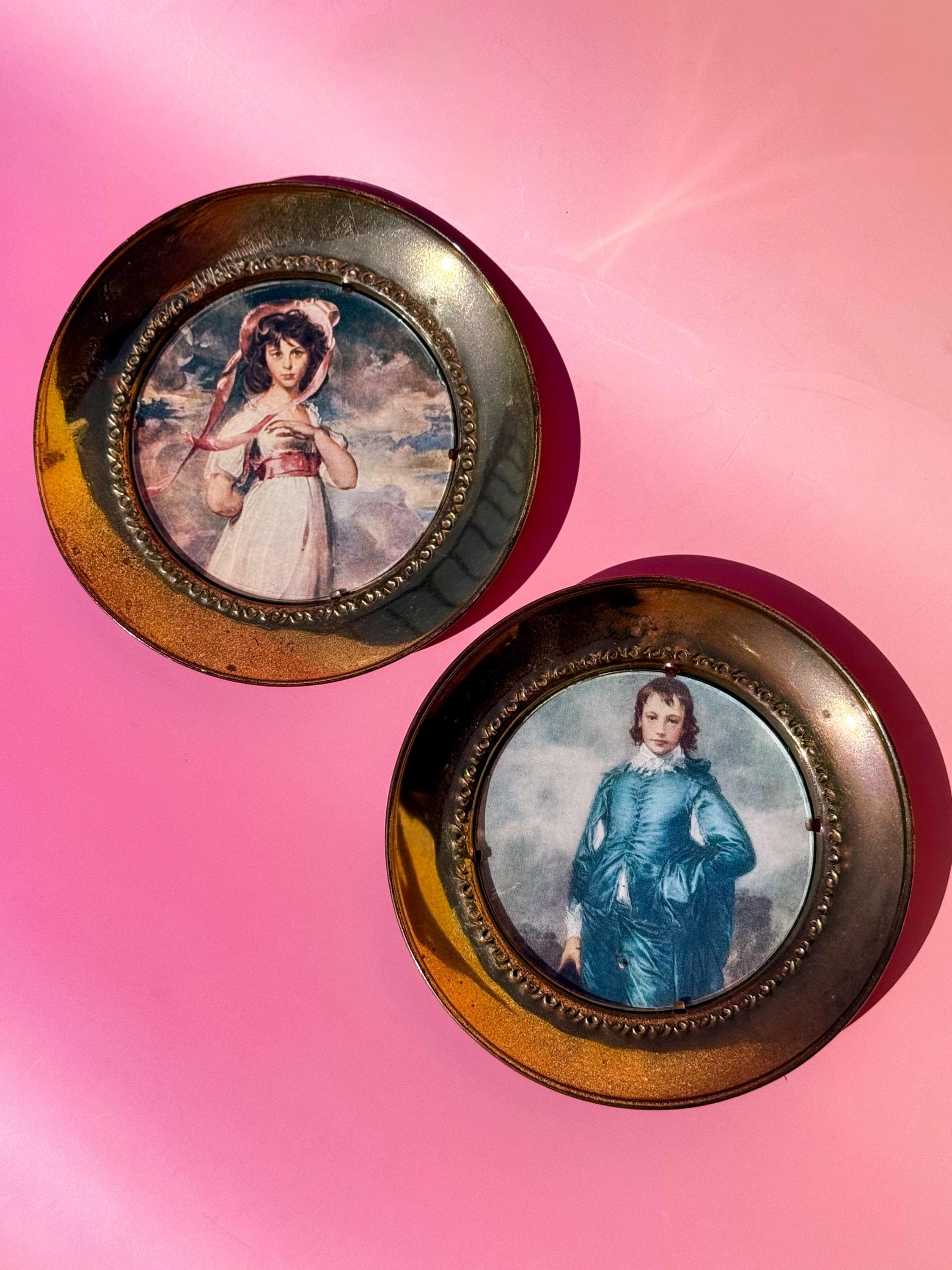PLEASE NOTE THAT U.S. BUYERS ARE RESPONSIBLE FOR ANY TARIFFS THAT MAY APPLY. Did you know that Blue Boy & Pinkie actually belong displayed together? Not officially- they’re painted by different artists decades apart. But vintage collectors know that they are meant to be paired. Or you could just keep ‘em solo and hang them in separate rooms- it’s 2025, you do you. 😂 Two antique English Linton brass plates. One with a “Sarah Goodin Barrett Moulton: Pinkie” lithograph behind glass, by Thomas Lawrence, 1794. The other with “The Blue Boy” lithograph behind glass, by Thomas Gainsborough, 1770. Stamped. With hooks to hang. Sold as a pair.