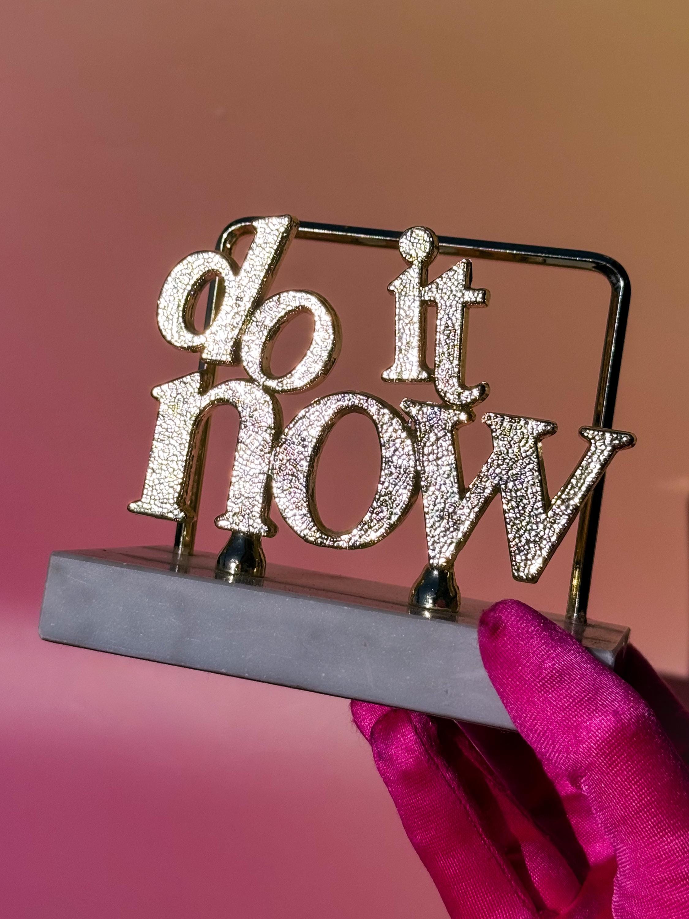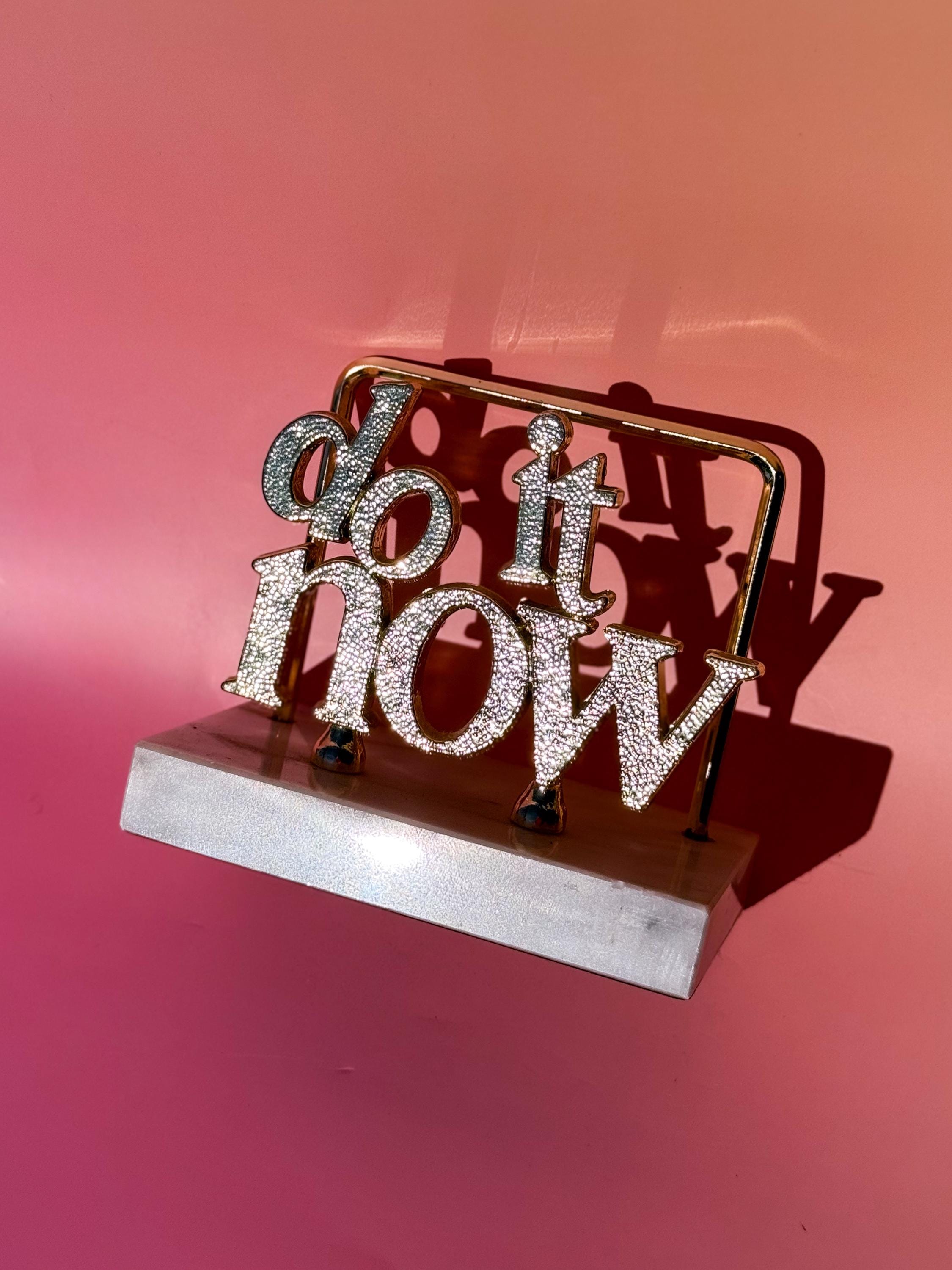 PLEASE NOTE THAT U.S. BUYERS ARE RESPONSIBLE FOR ANY TARIFFS THAT MAY APPLY. “Do It Now” mid century desk organizer. The sass! 💁♀️ With the original sticker still attached, reading “Fine marble base, made in Italy.” Heavy! Gold-tone metal, marble base with some light fleabites, and the bottom is flocked.