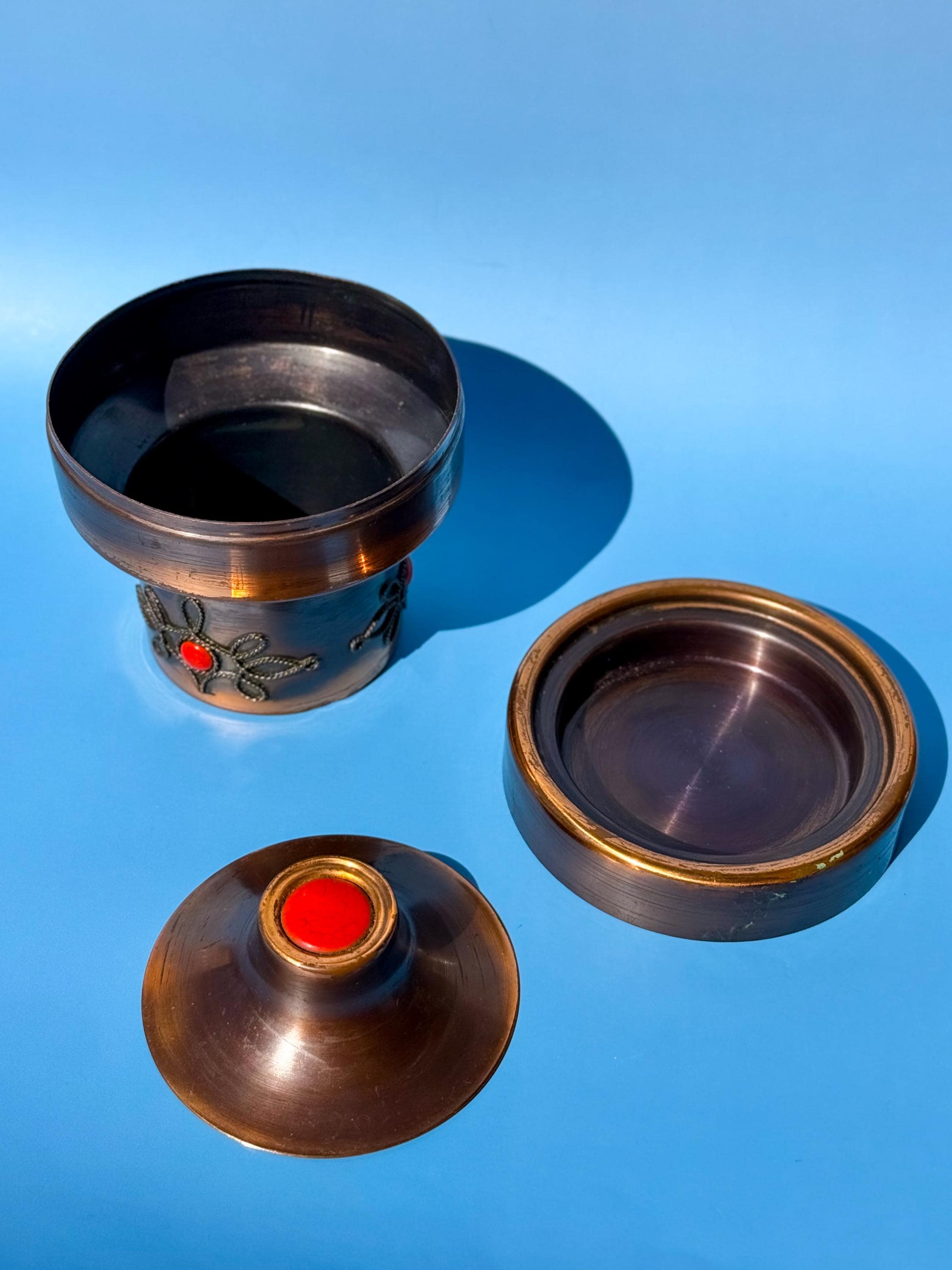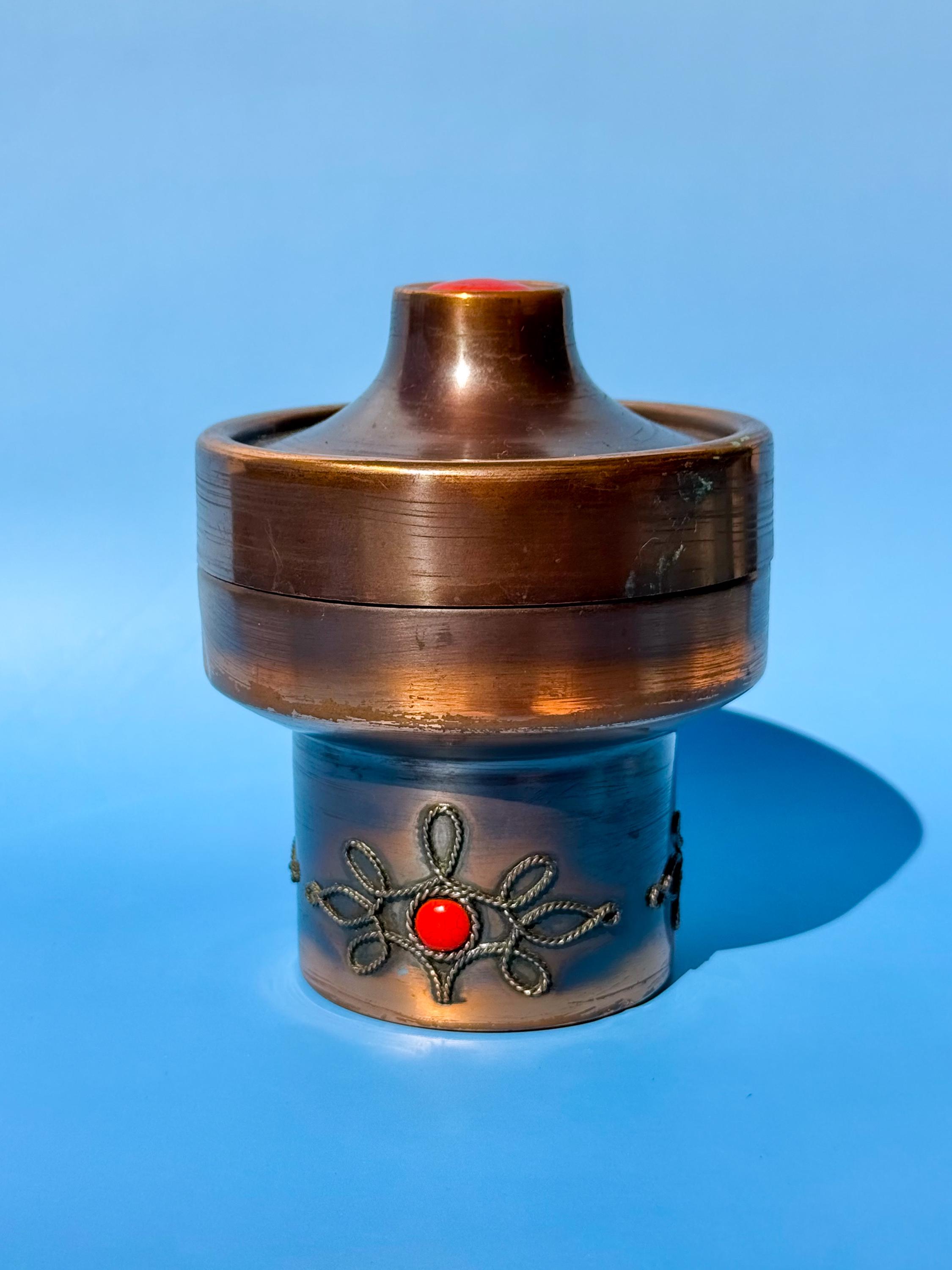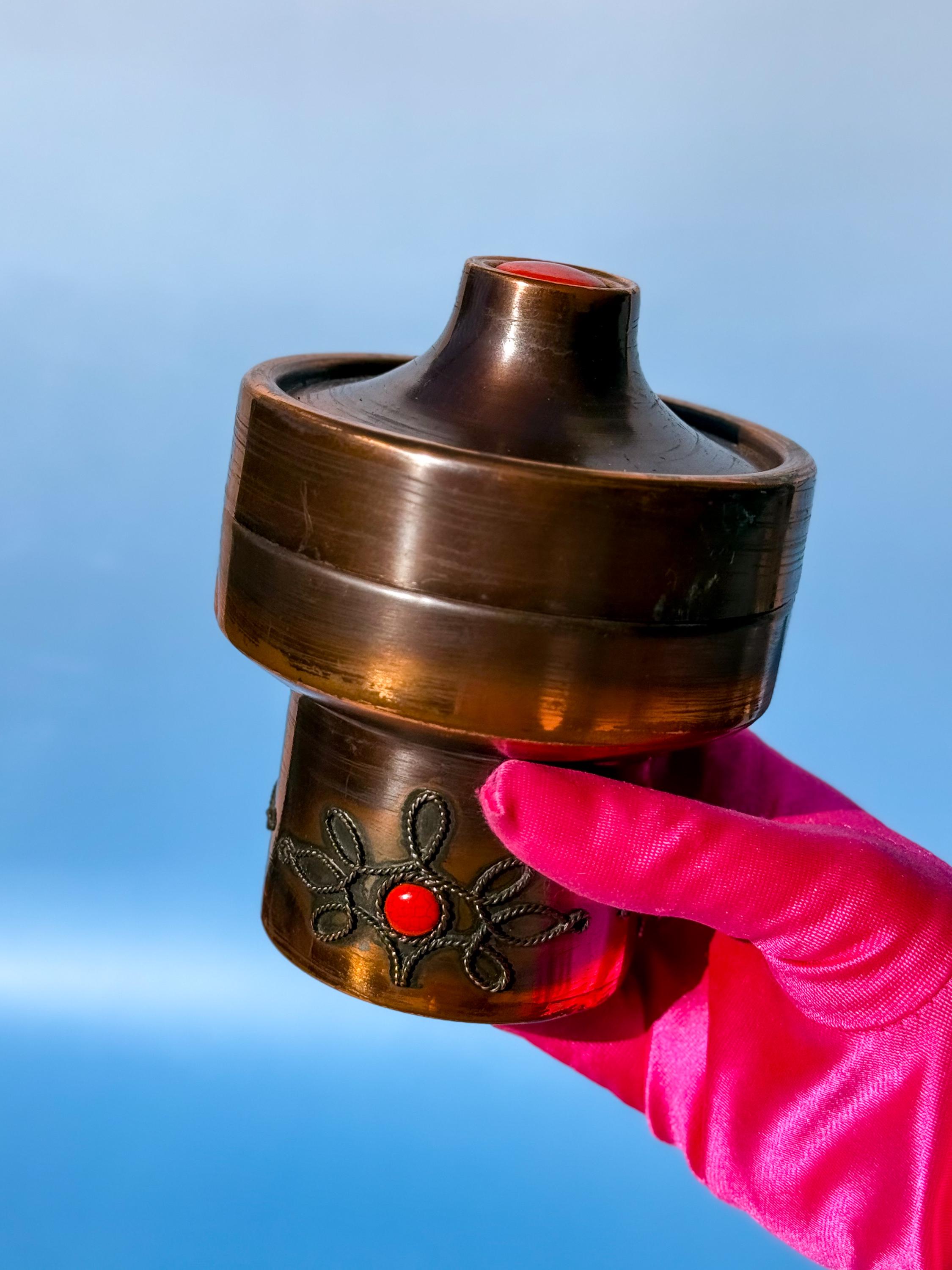 1970’s Lignifer modular copper ashtray. Super unique piece from the collectible mid century Hungarian manufacturer. Brushed copper with red fire enamel details. Three parts, with a lid, ashtray up top, & compartment for cigarettes below. But this multi-section vessel could be used for anything you like. It has light surface age but is in overall great condition. Maker’s label on the bottom. Others are selling in the $100’s.