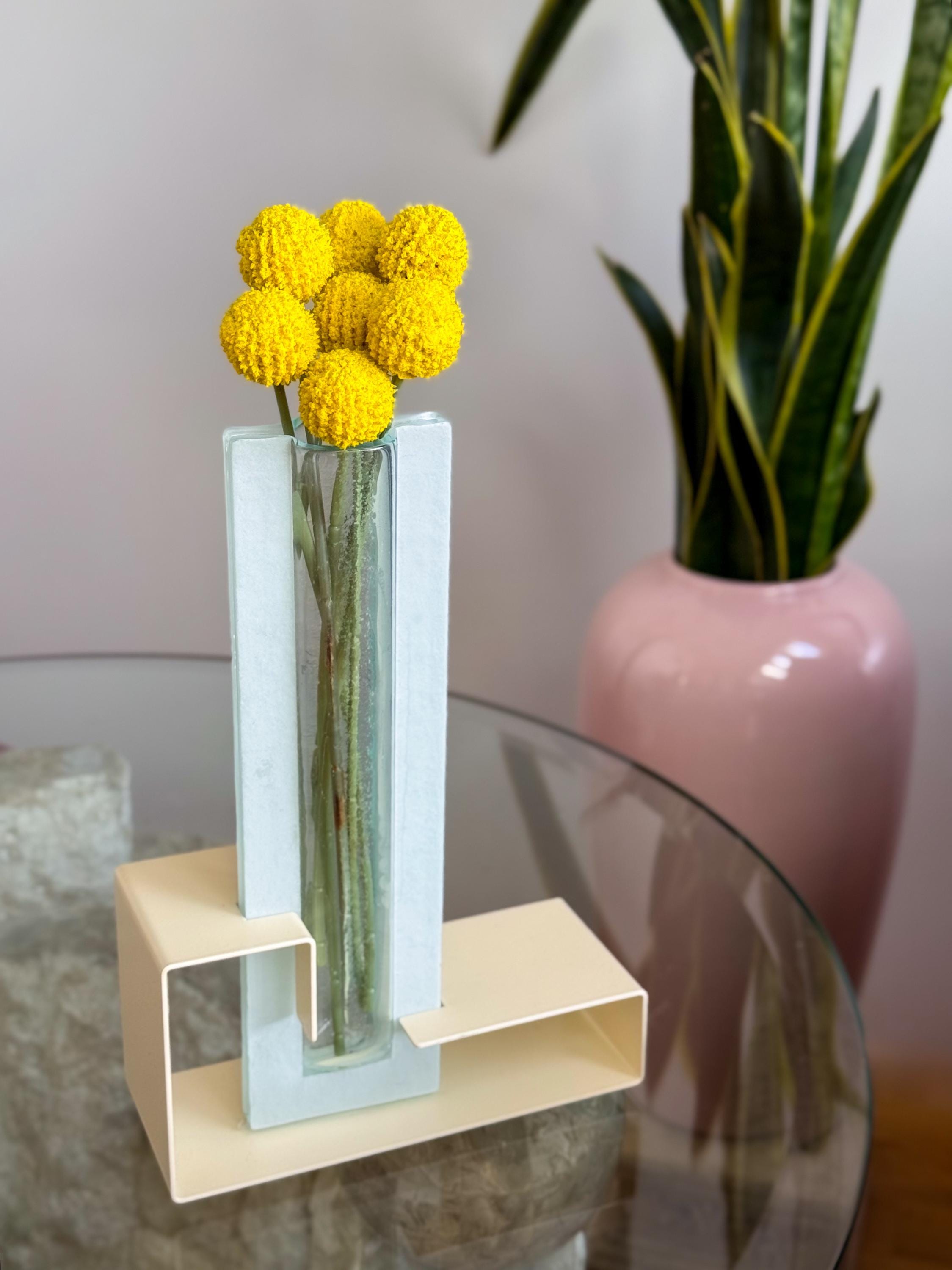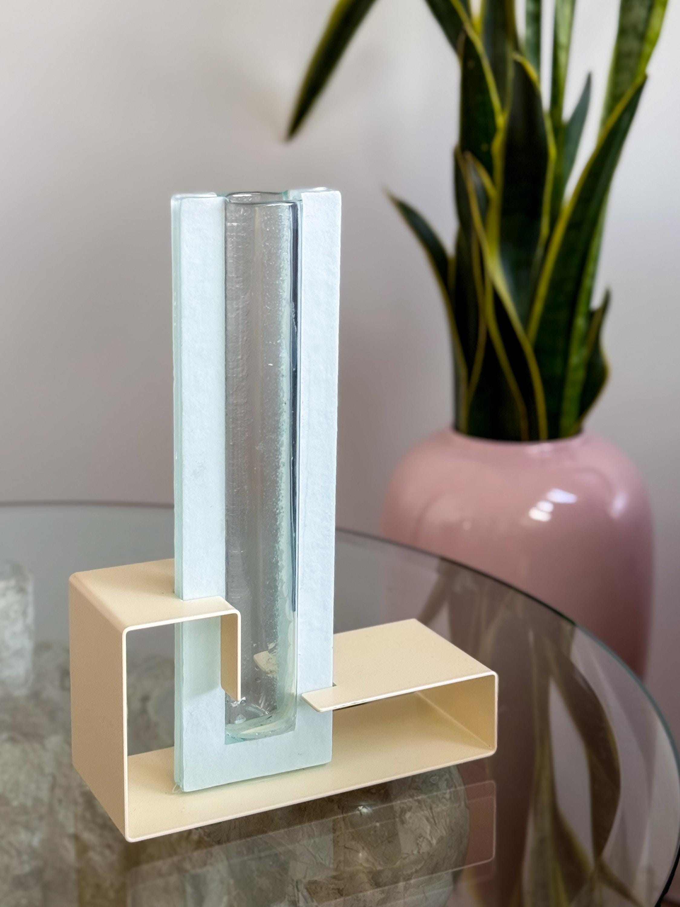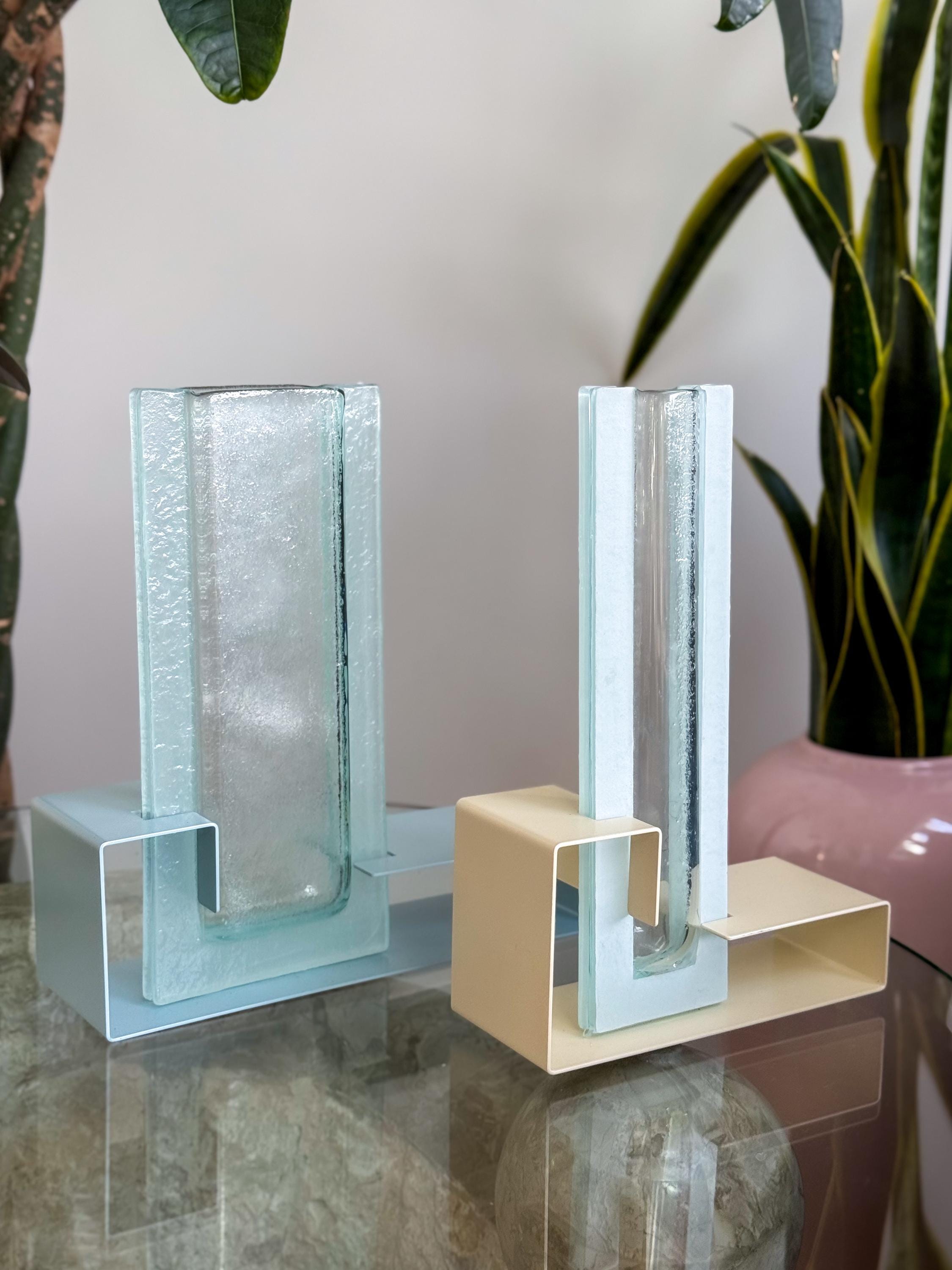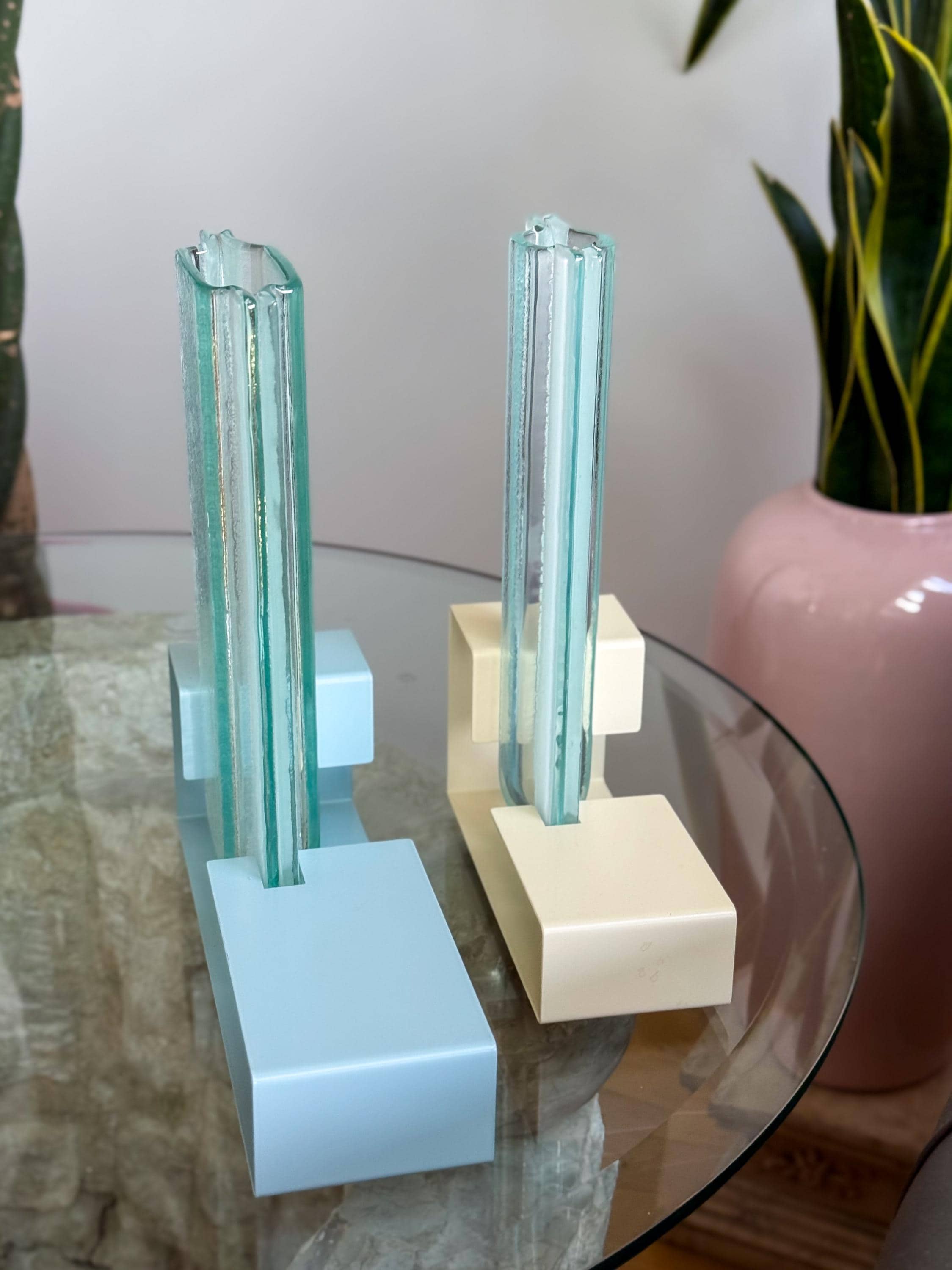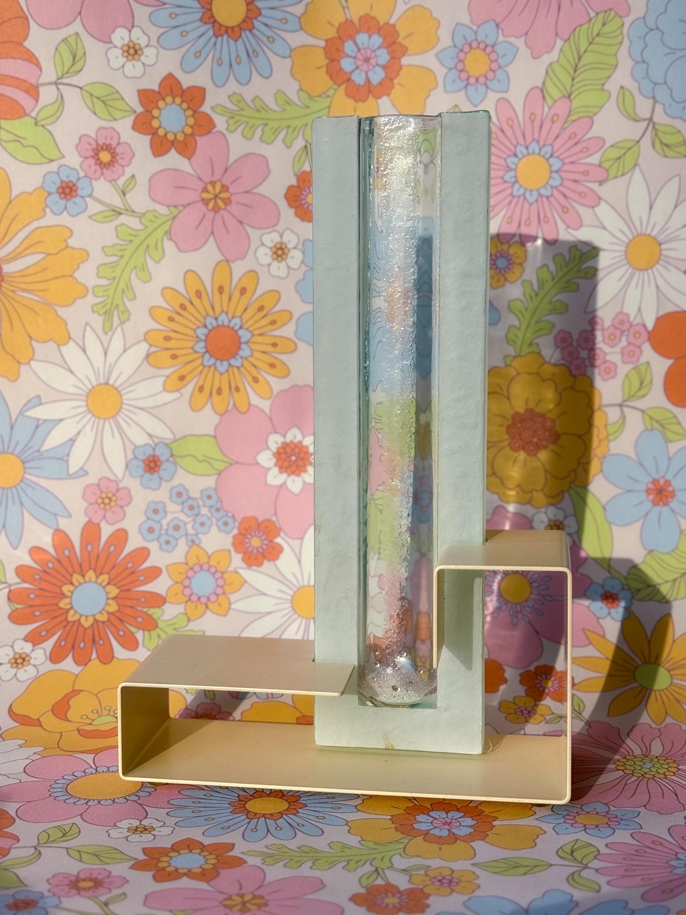 Vintage Postmodern colour block vases. These fabulous mod vases were made by This Is It in Vancouver, Canada. 80’s pastels, with angular enamelled metal bases & blue pressed glass. Water-safe. No chips or cracks. Both in great condition. Sold separately or as a pair.