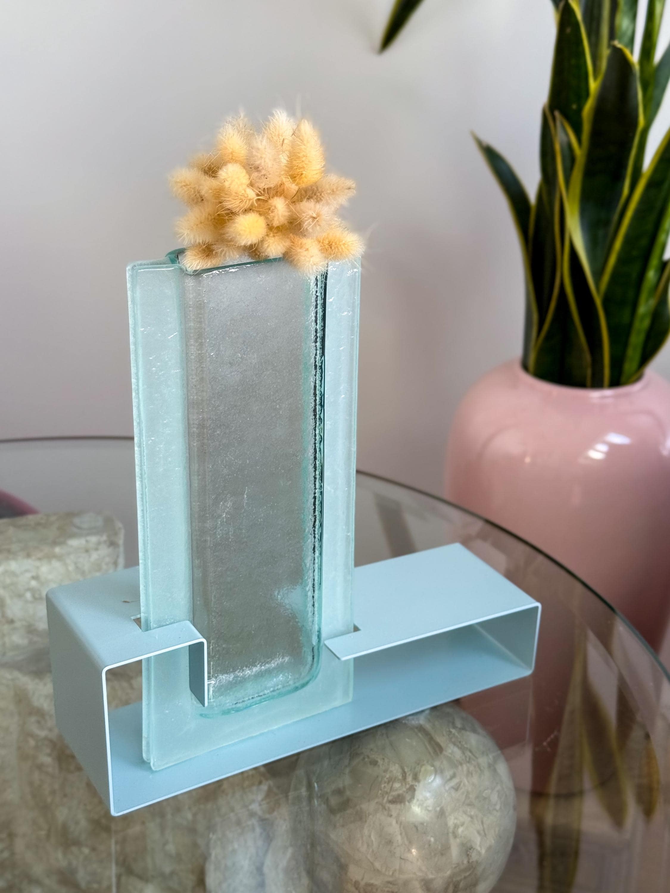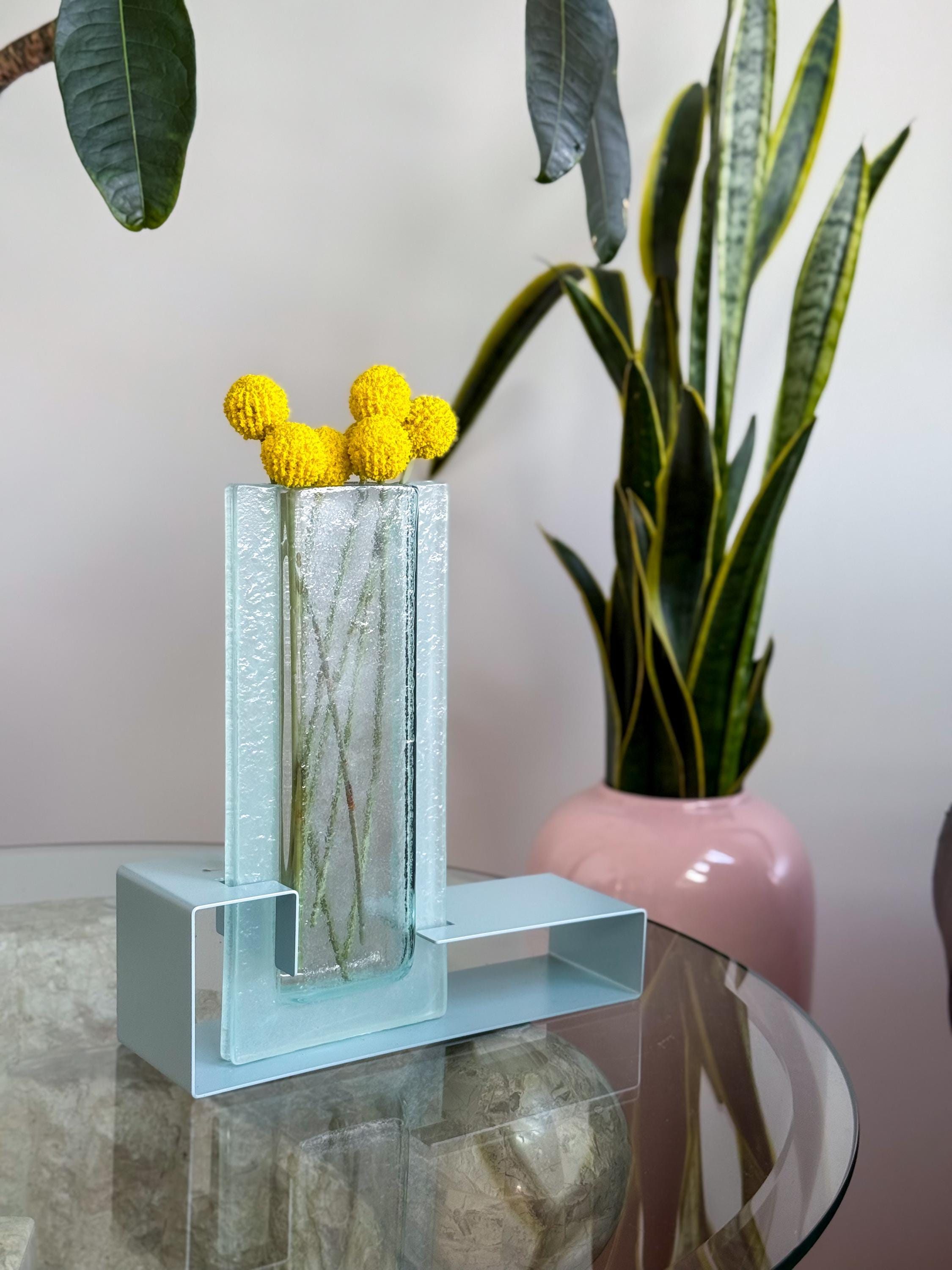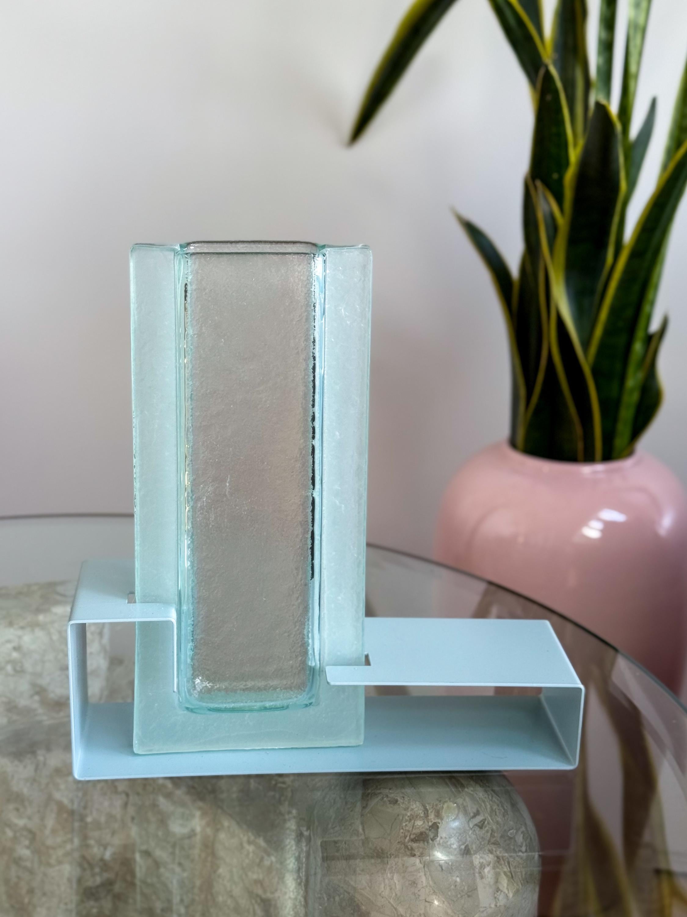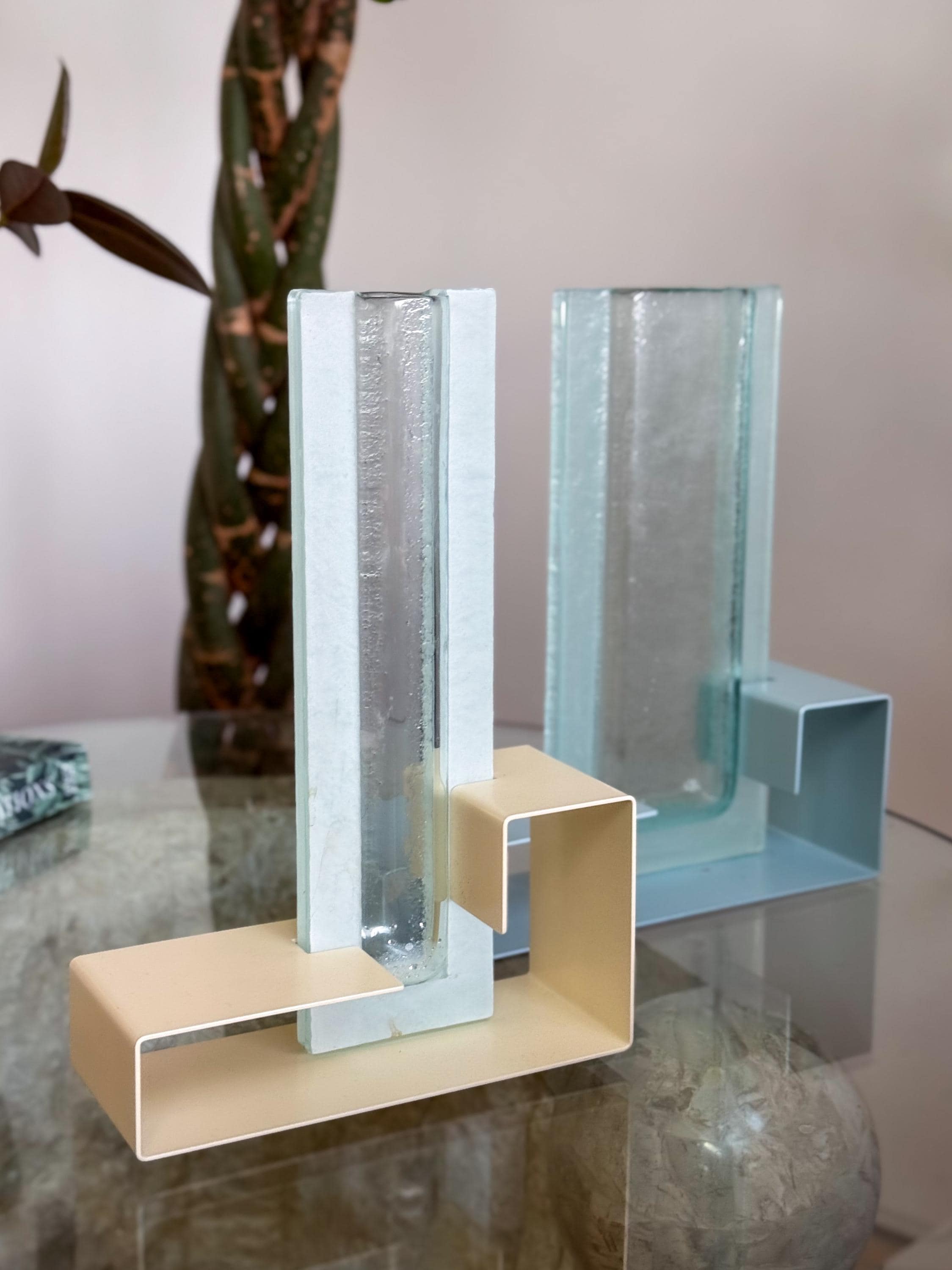Vintage Postmodern colour block vases. These fabulous mod vases were made by This Is It in Vancouver, Canada. 80’s pastels, with angular enamelled metal bases & blue pressed glass. Water-safe. No chips or cracks. Both in great condition. Sold separately or as a pair.