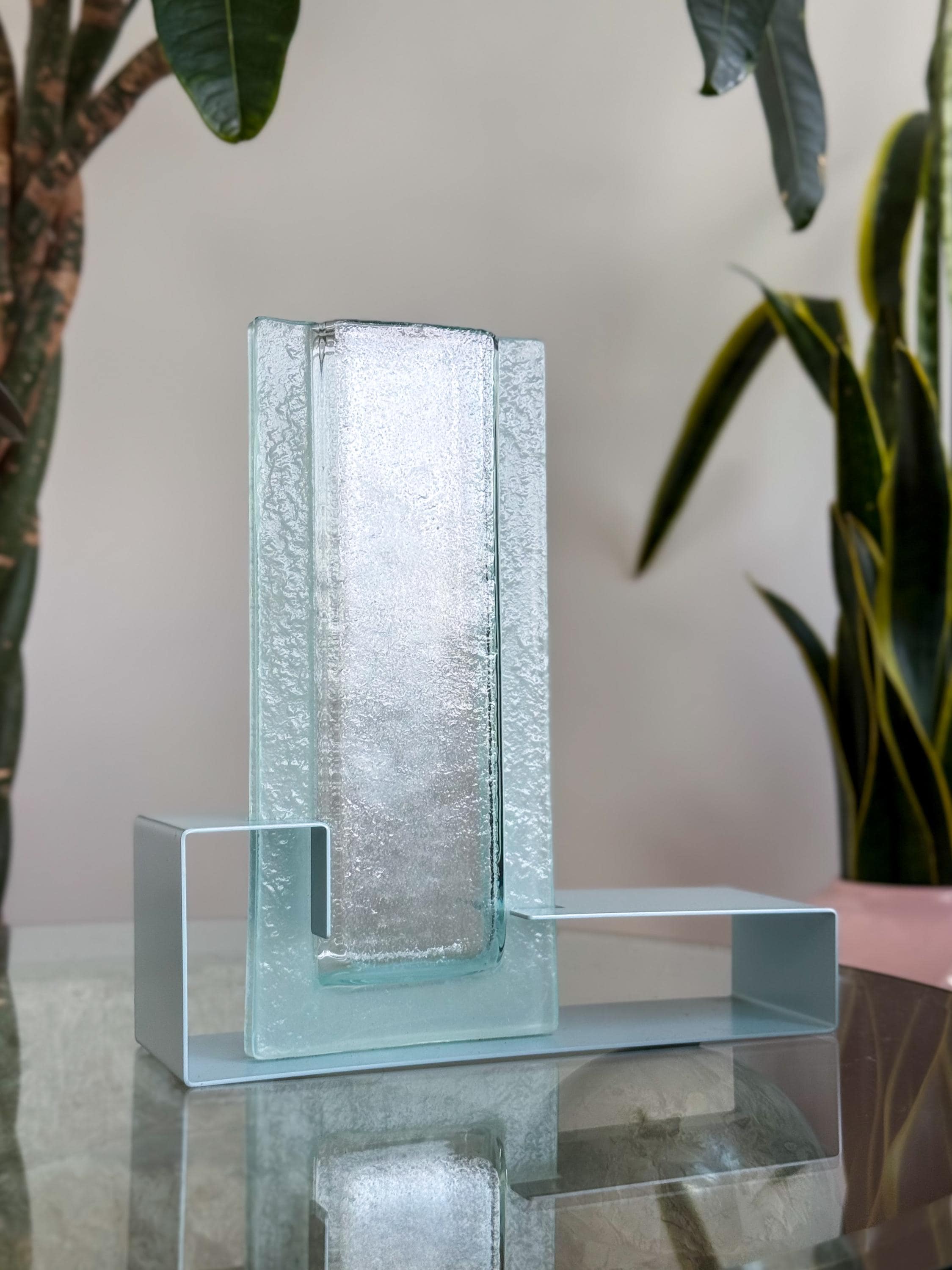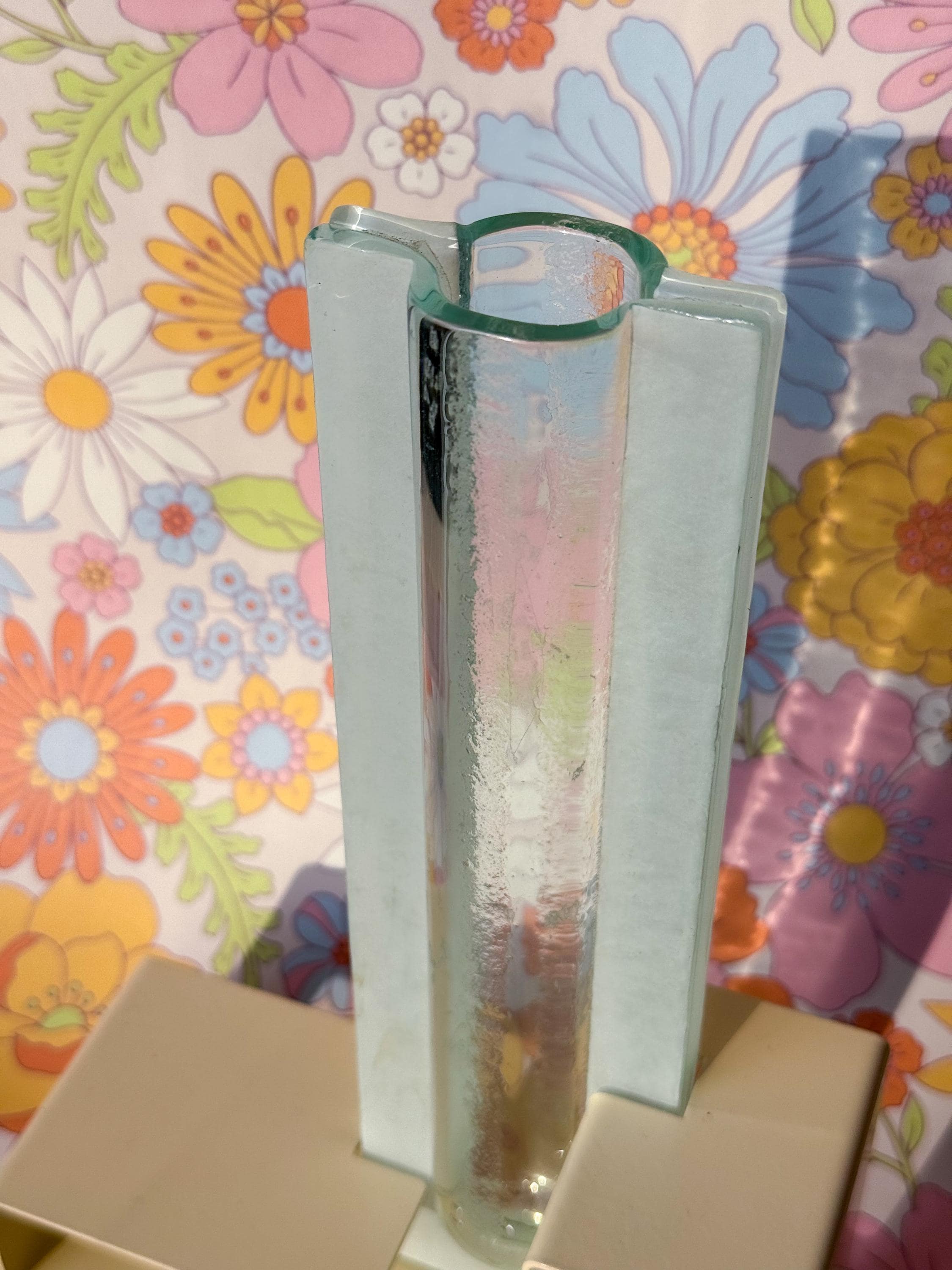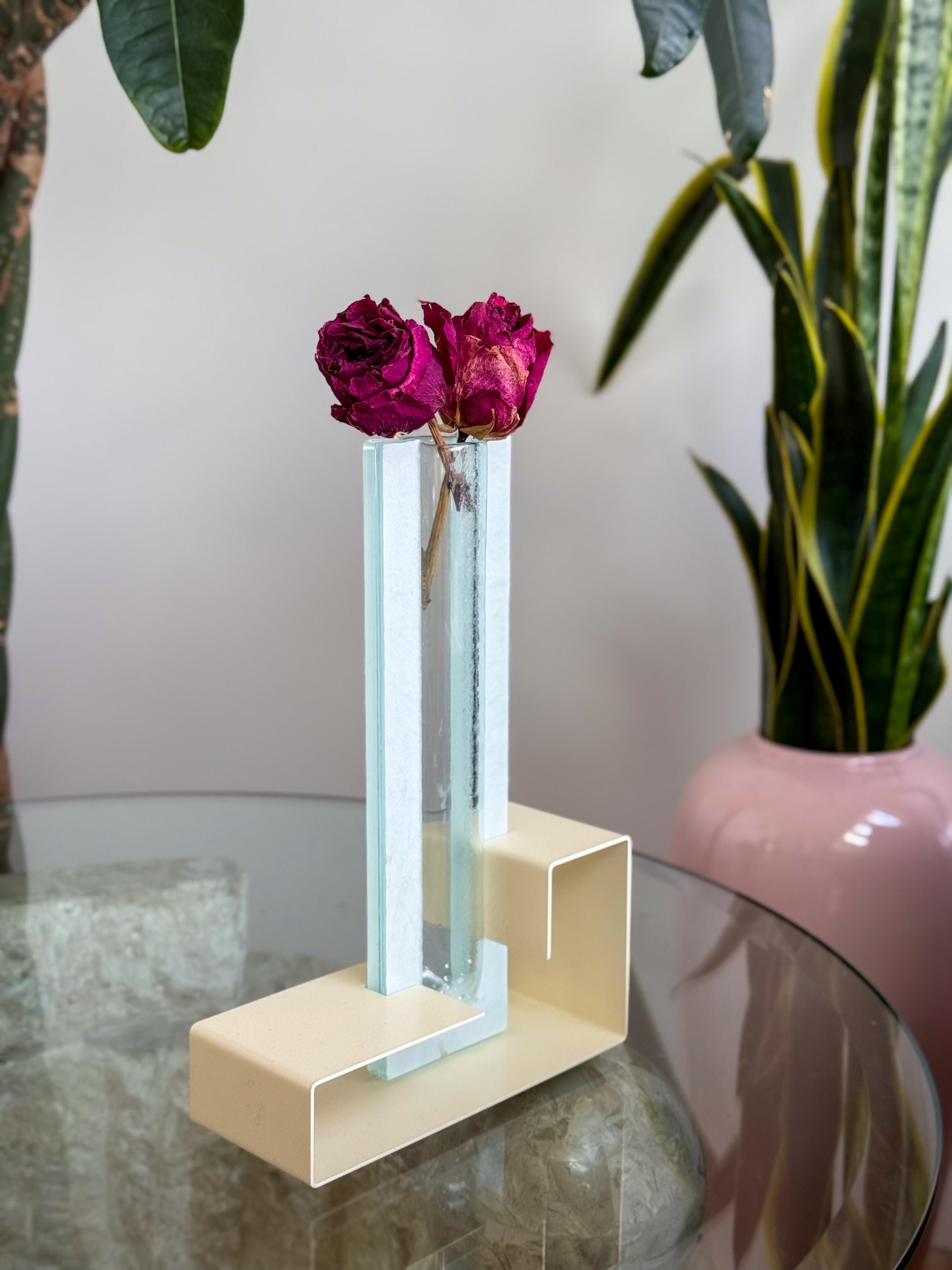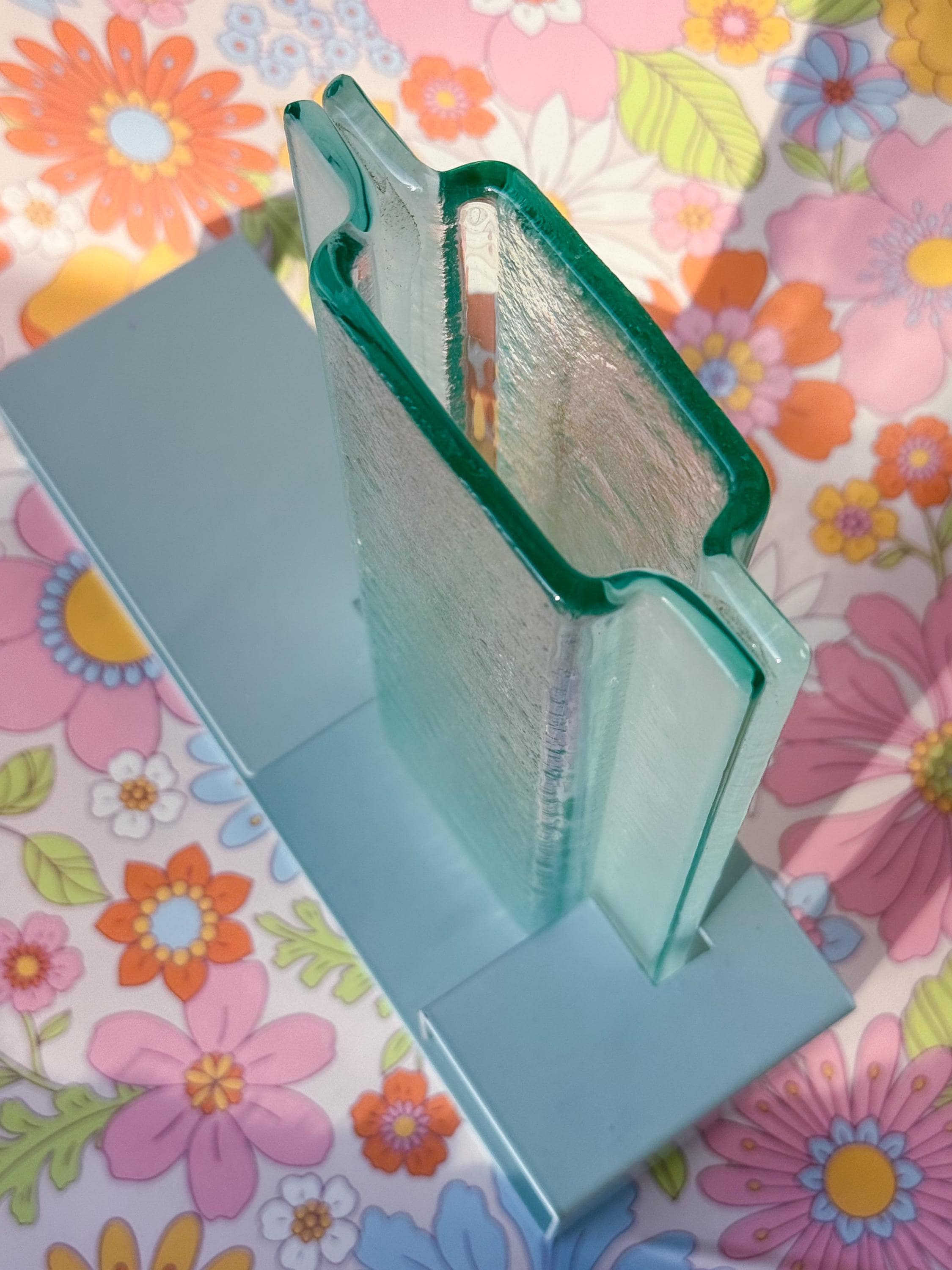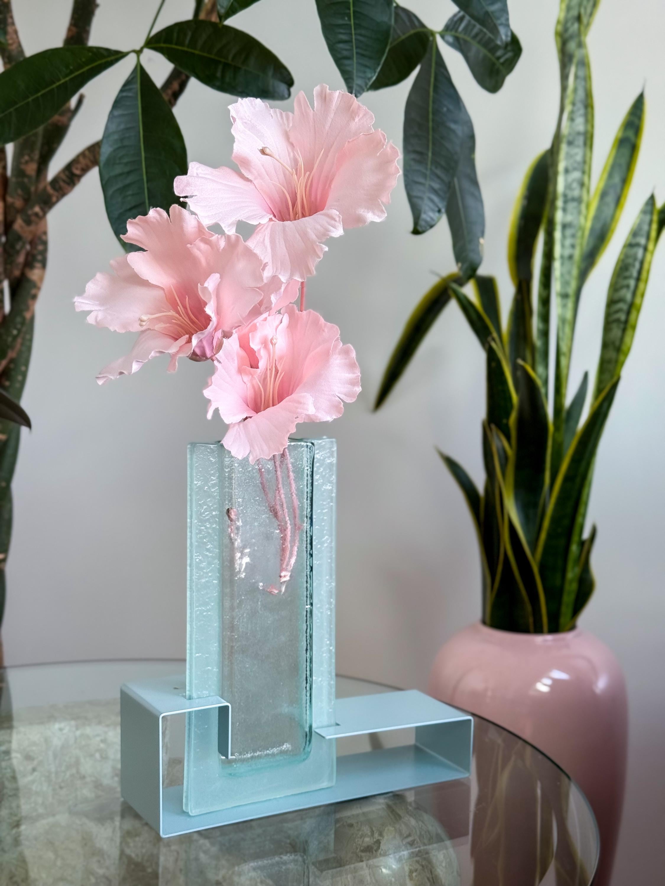 Vintage Postmodern colour block vases. These fabulous mod vases were made by This Is It in Vancouver, Canada. 80’s pastels, with angular enamelled metal bases & blue pressed glass. Water-safe. No chips or cracks. Both in great condition. Sold separately or as a pair.