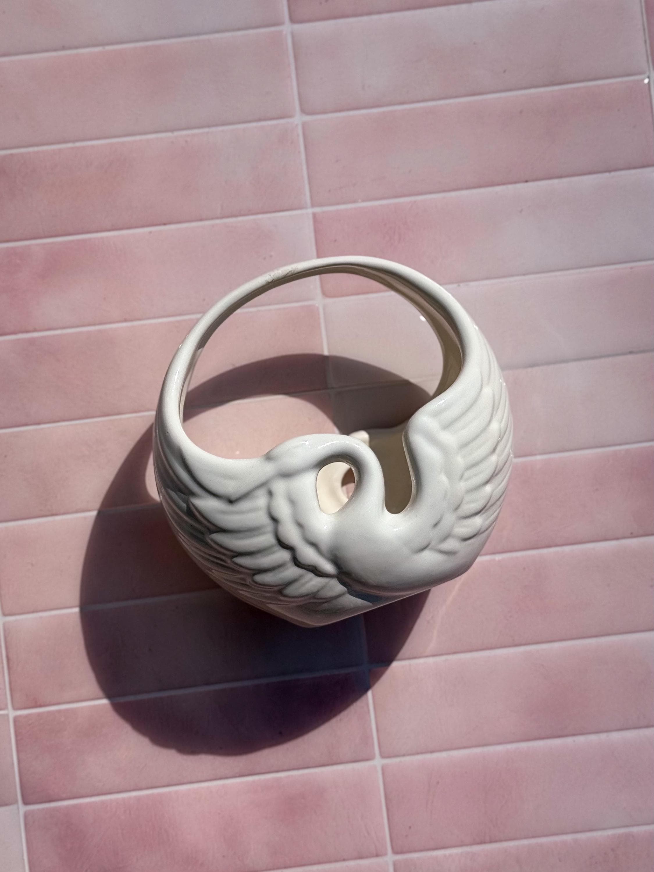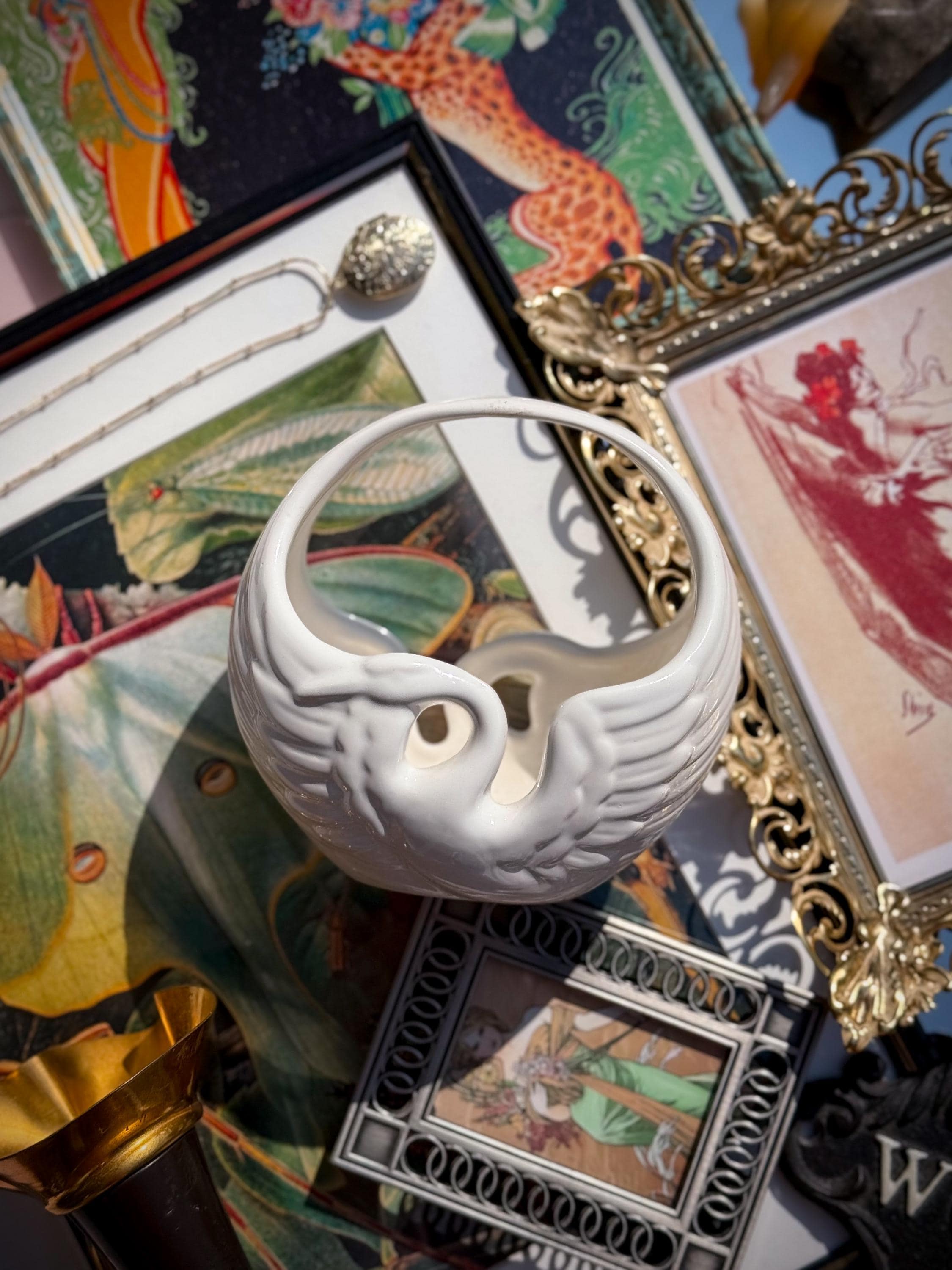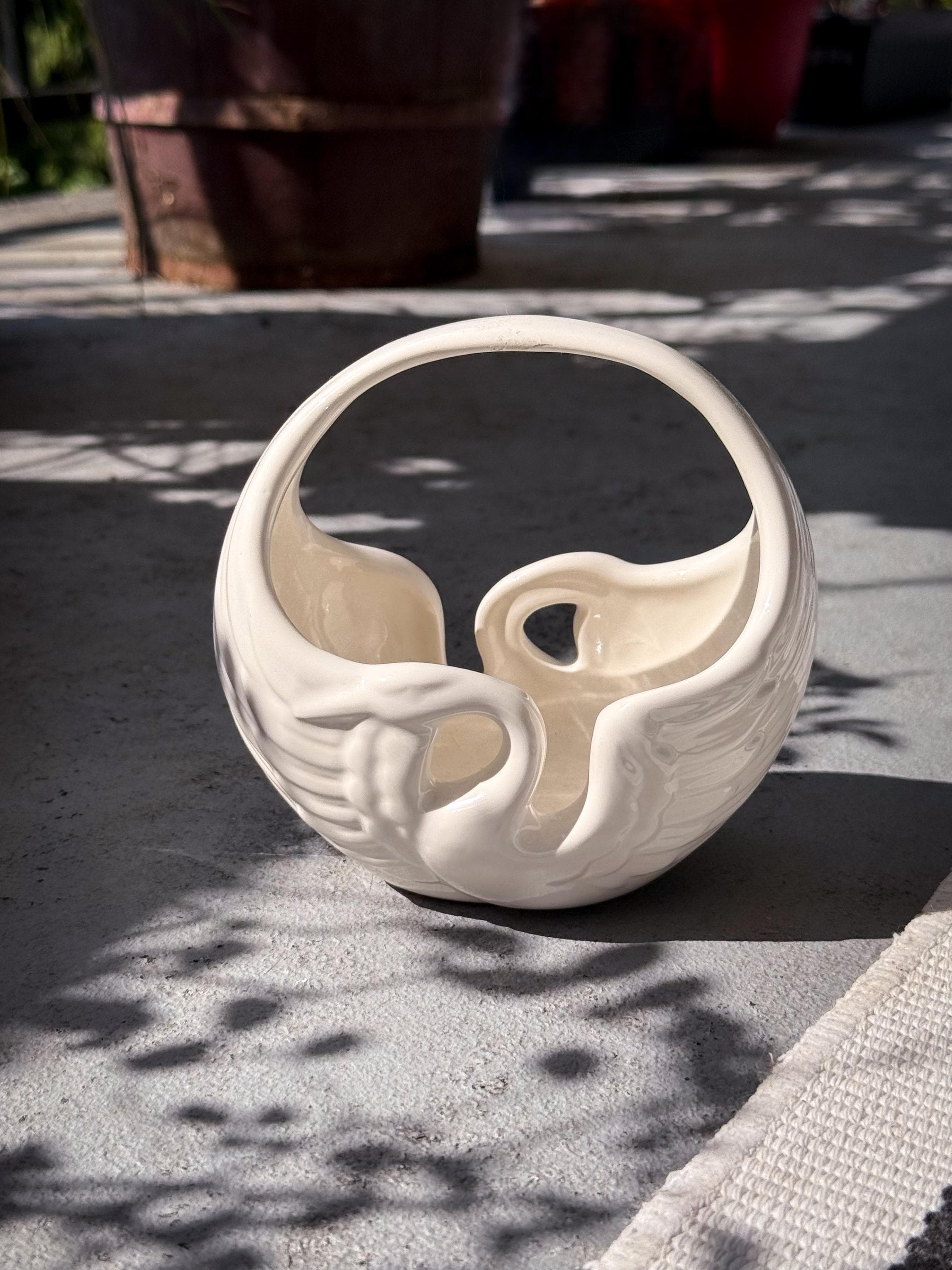 Vintage reproduction of infamous Fitz & Floyd 1980’s swan arch. This bowl/planter has been remade in so many fun ways over the years- brass, wood, ceramics. It’s always a fabulous vintage statement-making find. This one is signed glazed ceramic in great condition with no chips or cracks.
