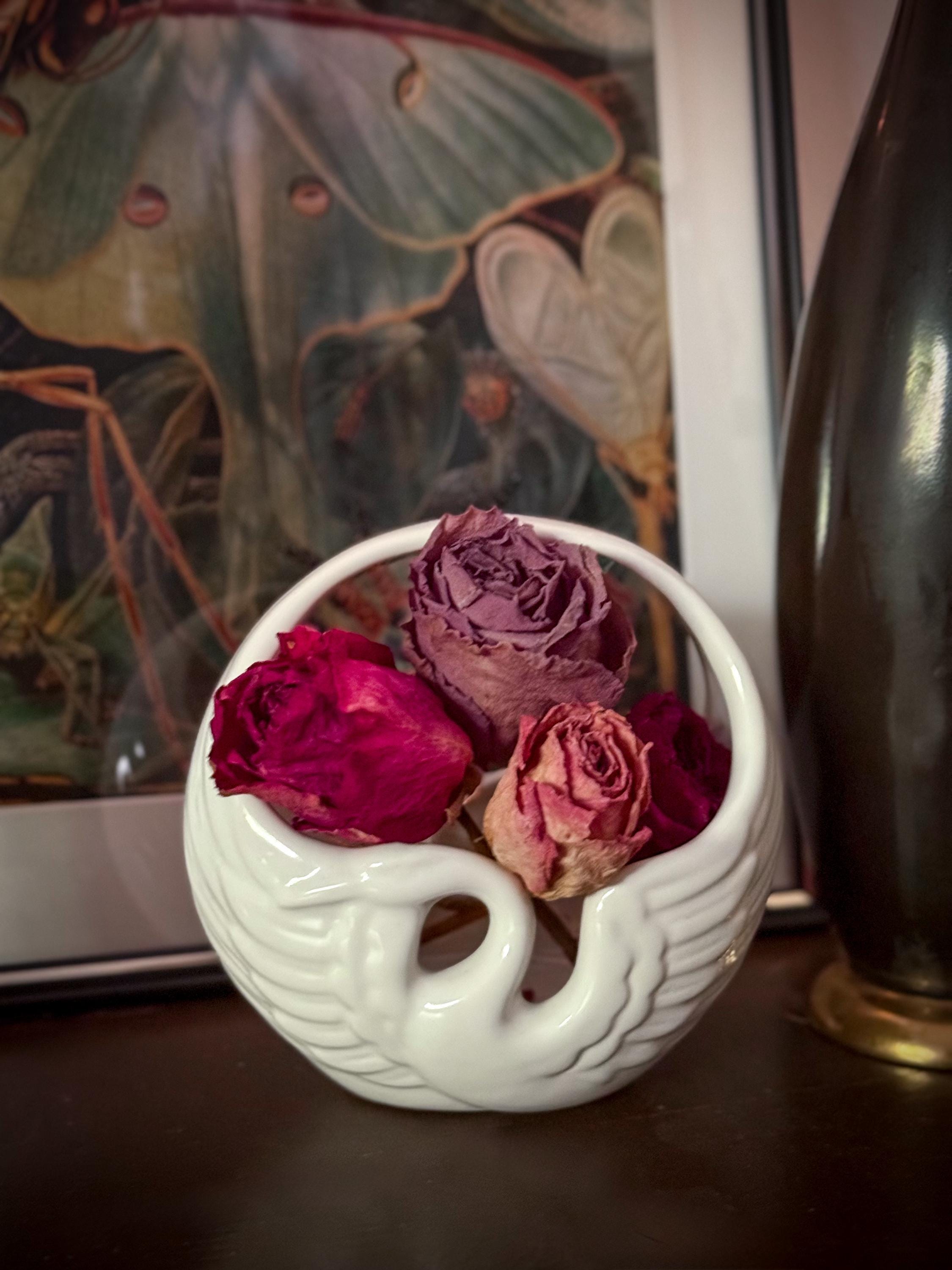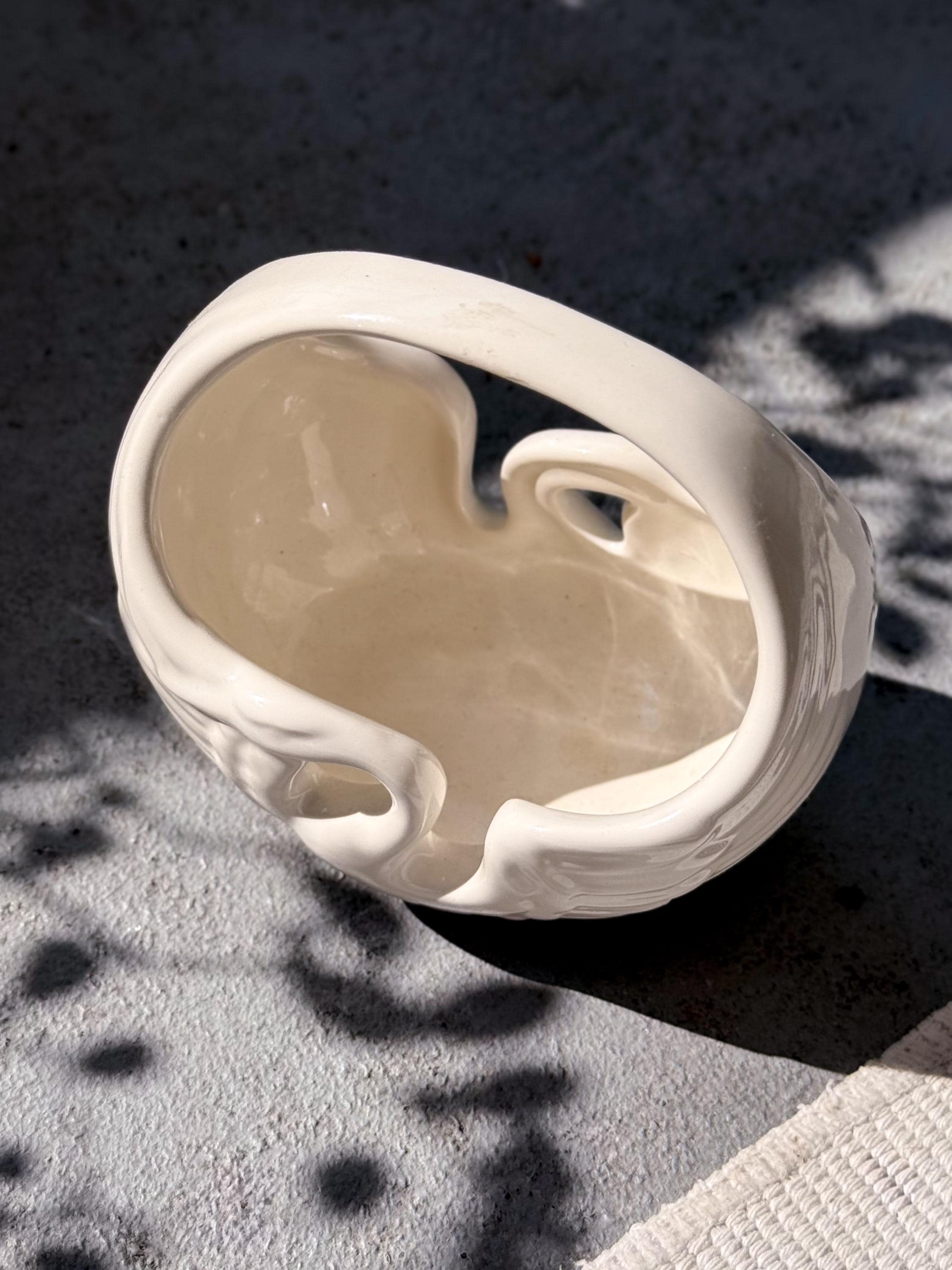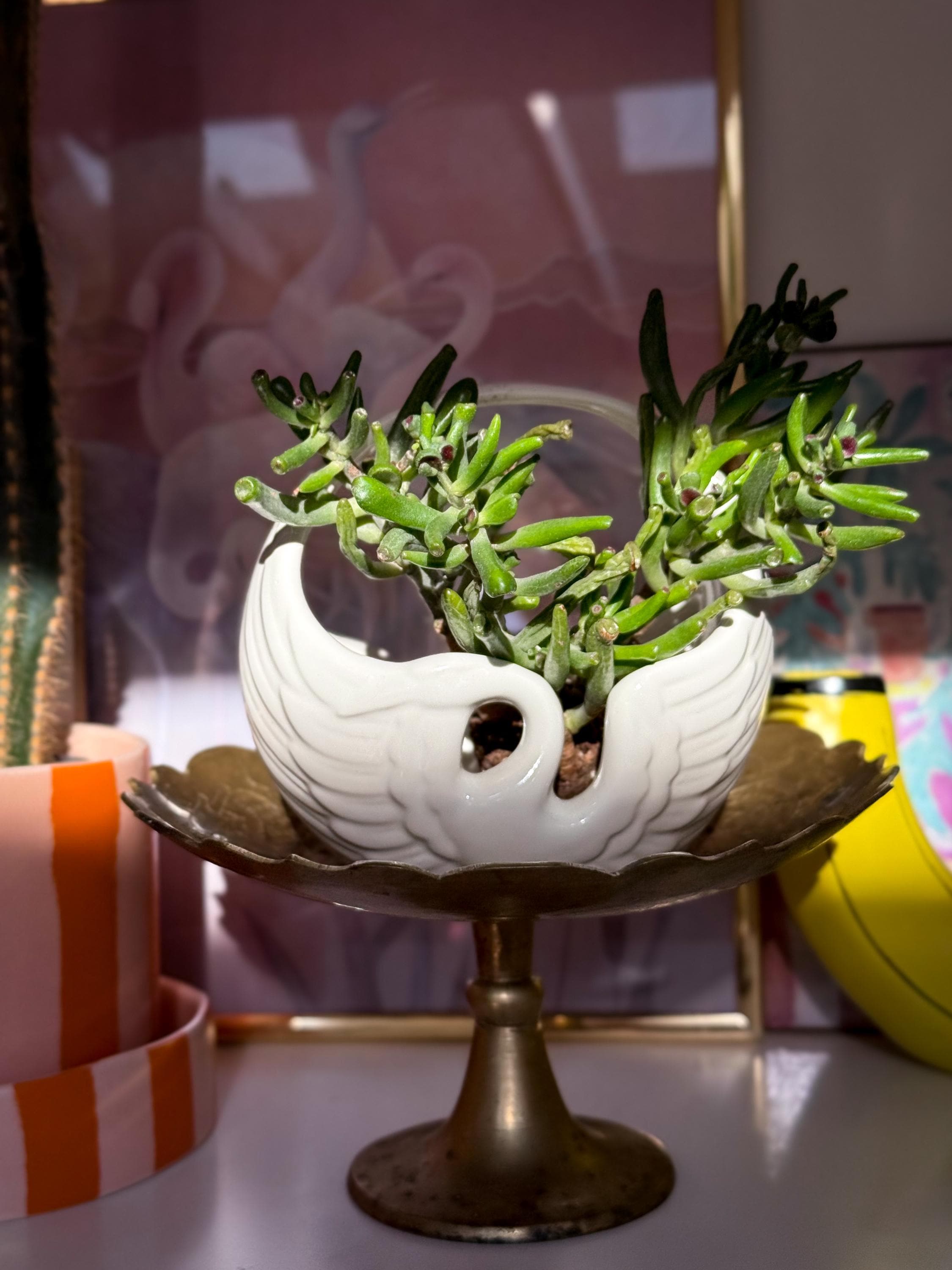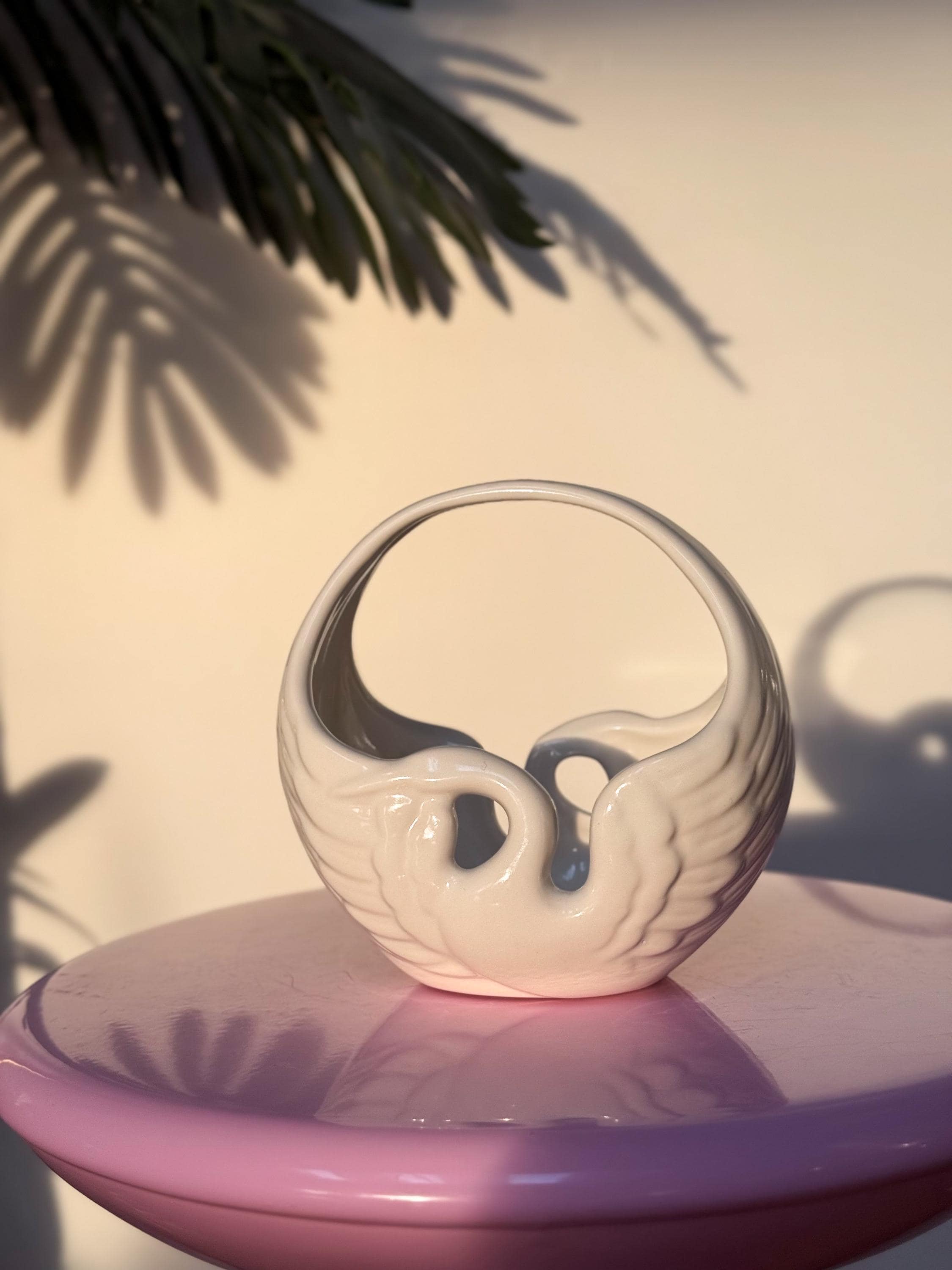 Vintage reproduction of infamous Fitz & Floyd 1980’s swan arch. This bowl/planter has been remade in so many fun ways over the years- brass, wood, ceramics. It’s always a fabulous vintage statement-making find. This one is signed glazed ceramic in great condition with no chips or cracks.