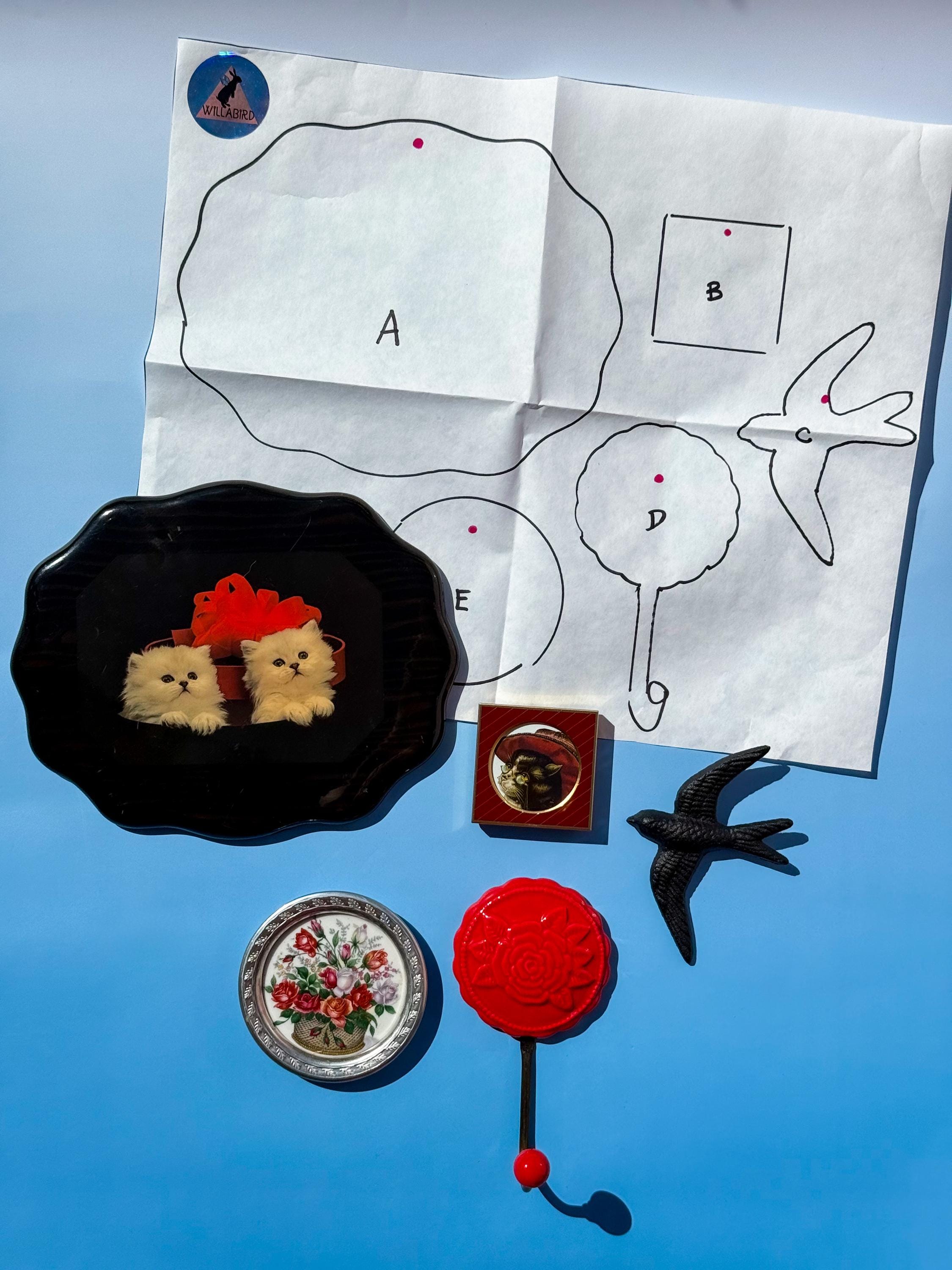 Bring vintage charm to your walls with this curated collection of vintage wall hangings, thoughtfully arranged and paired with a detailed hanging blueprint for effortless decorating. Just tape up the blueprint where you want it, hammer picture nails through the orange dots, rip off the blueprint, & hang matching letters to the wall. Designed to create a perfectly balanced wall — without the guesswork. Like pieces handed down from grandma, and a gallery you've collected over time.