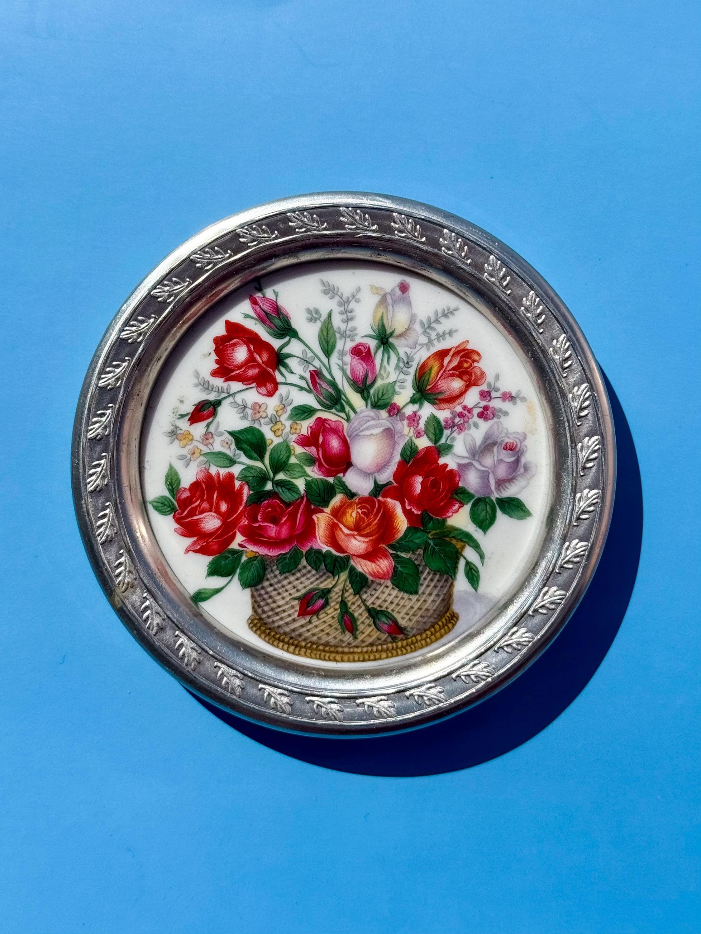E- 1970’s Bavaria Vohenstrauss Johavan Seltmann dish. Porcelain framed in silverplate, made in West Germany. With a little hook to hang. 4 inches