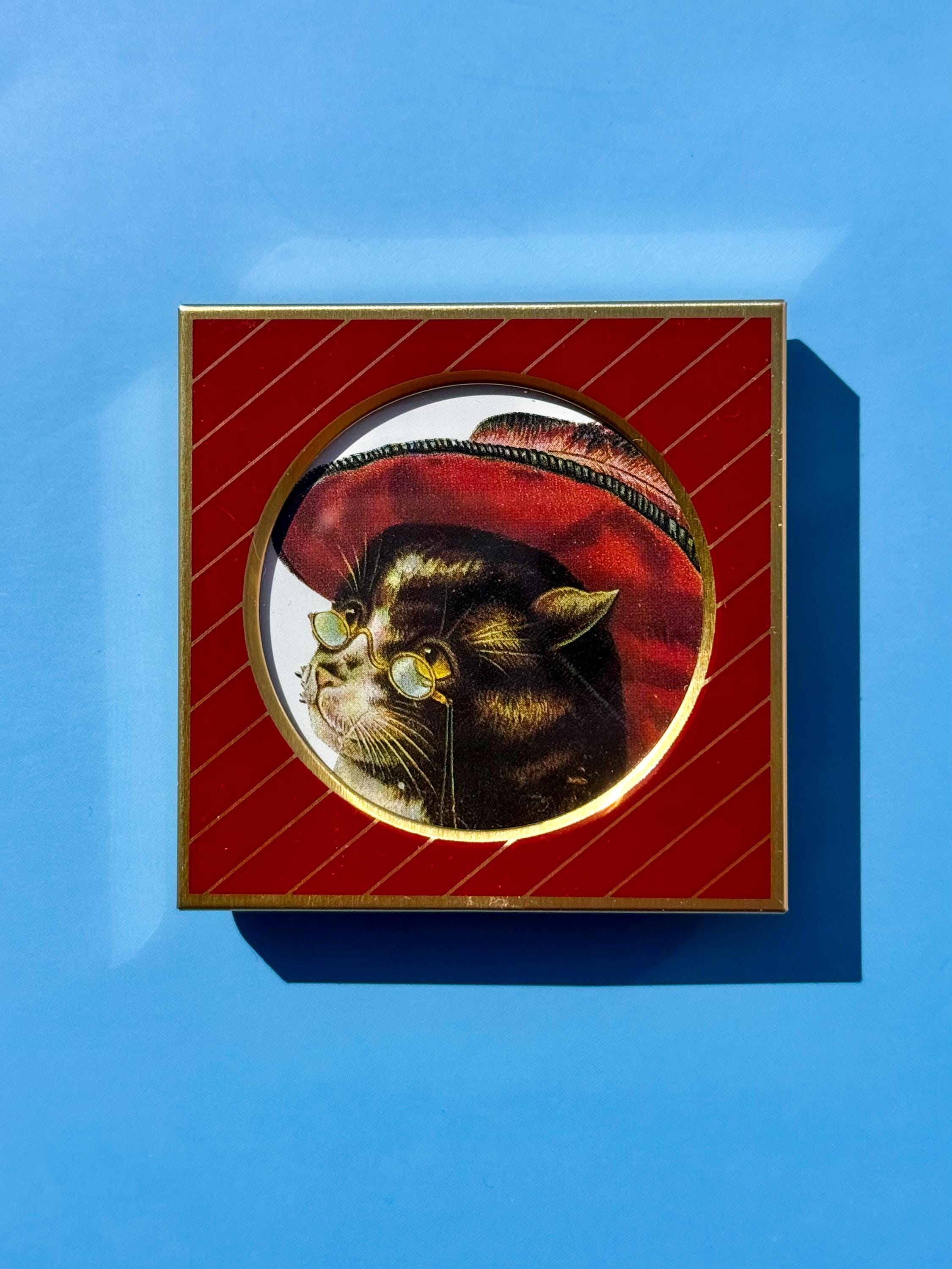 B- Vintage Victorian cat print in a miniature vintage enamelled brass frame. 2.5 x 2.5 inches