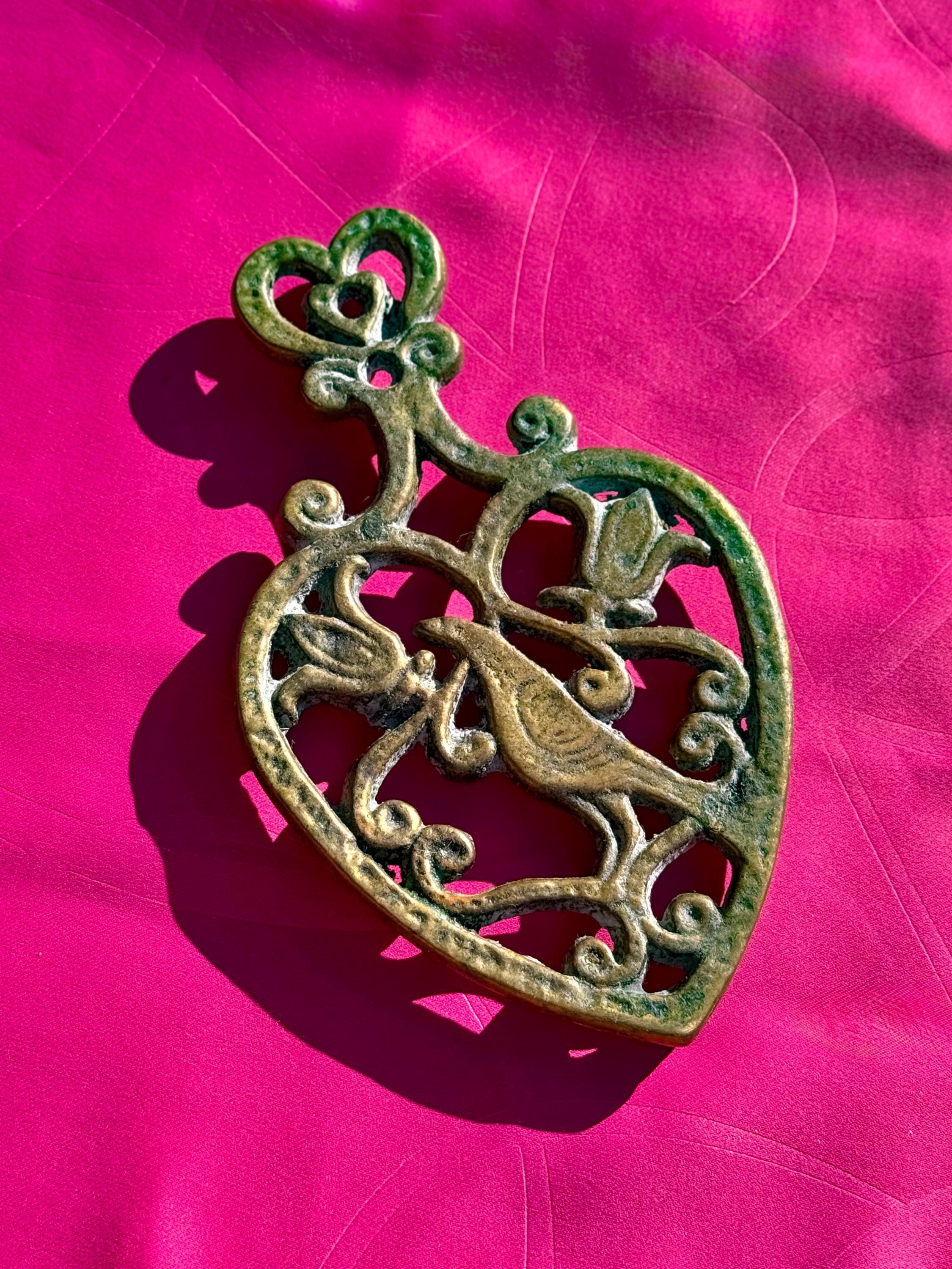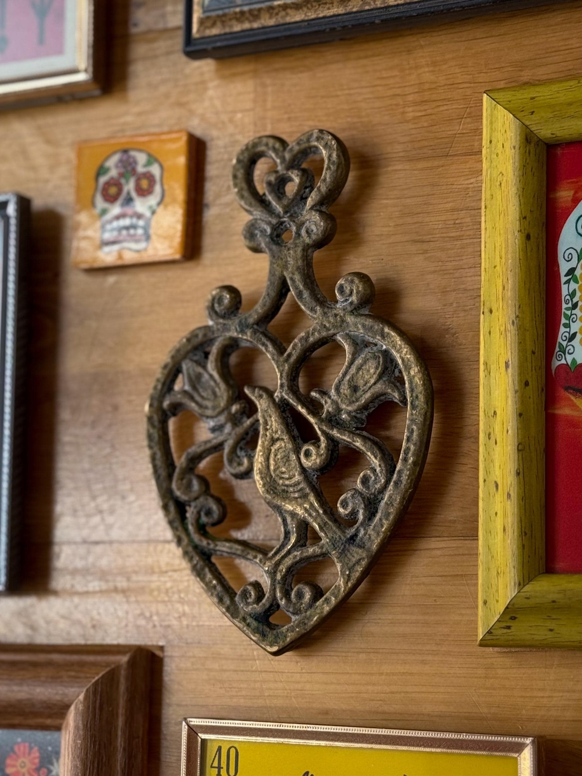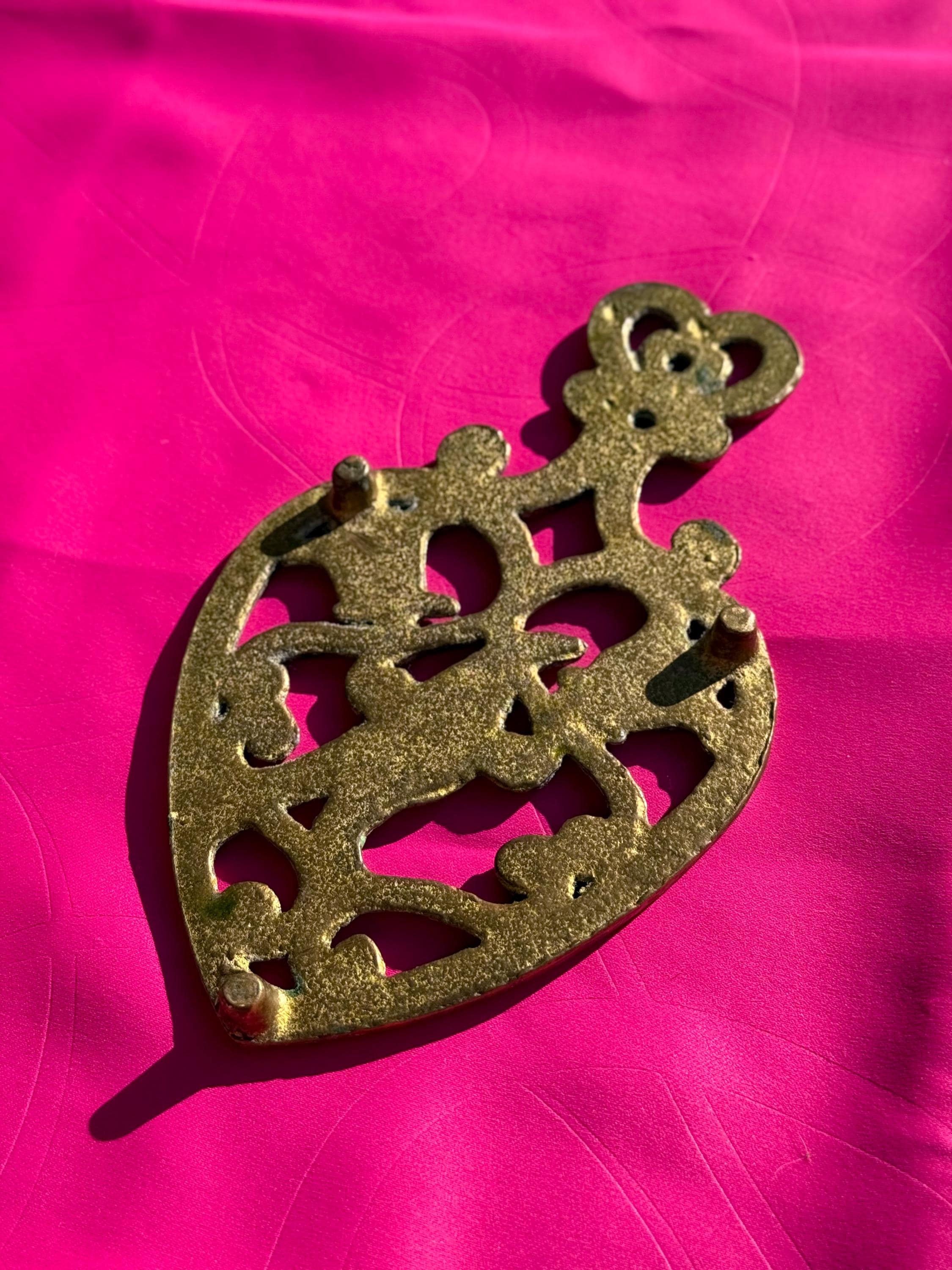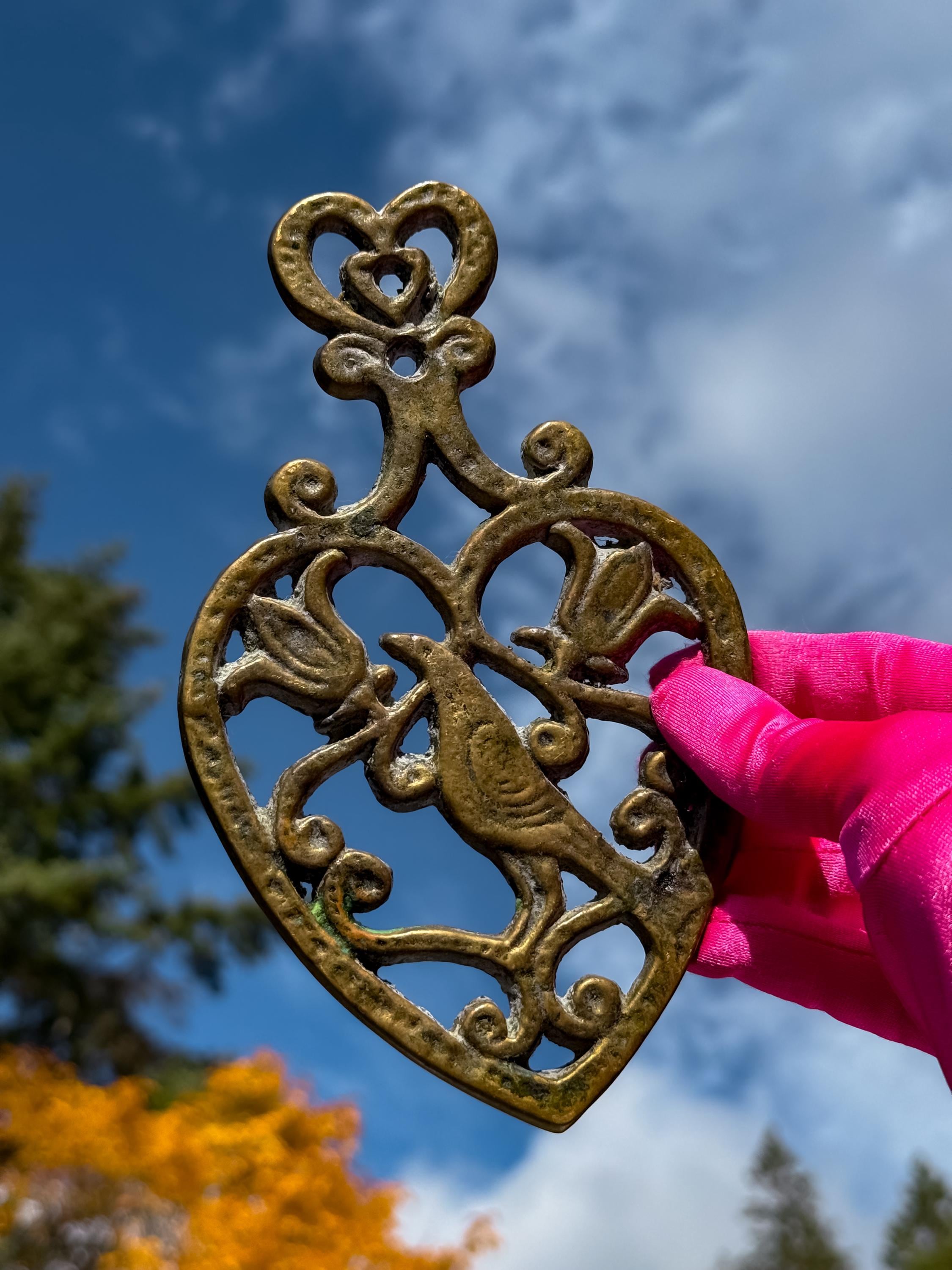 Mid century brass-plate iron Sacred Heart trivet. This gorgeous vintage footed bird trivet can be used in the kitchen for hot pots, or hung on the wall. It's quite weighty & has lots of patina.