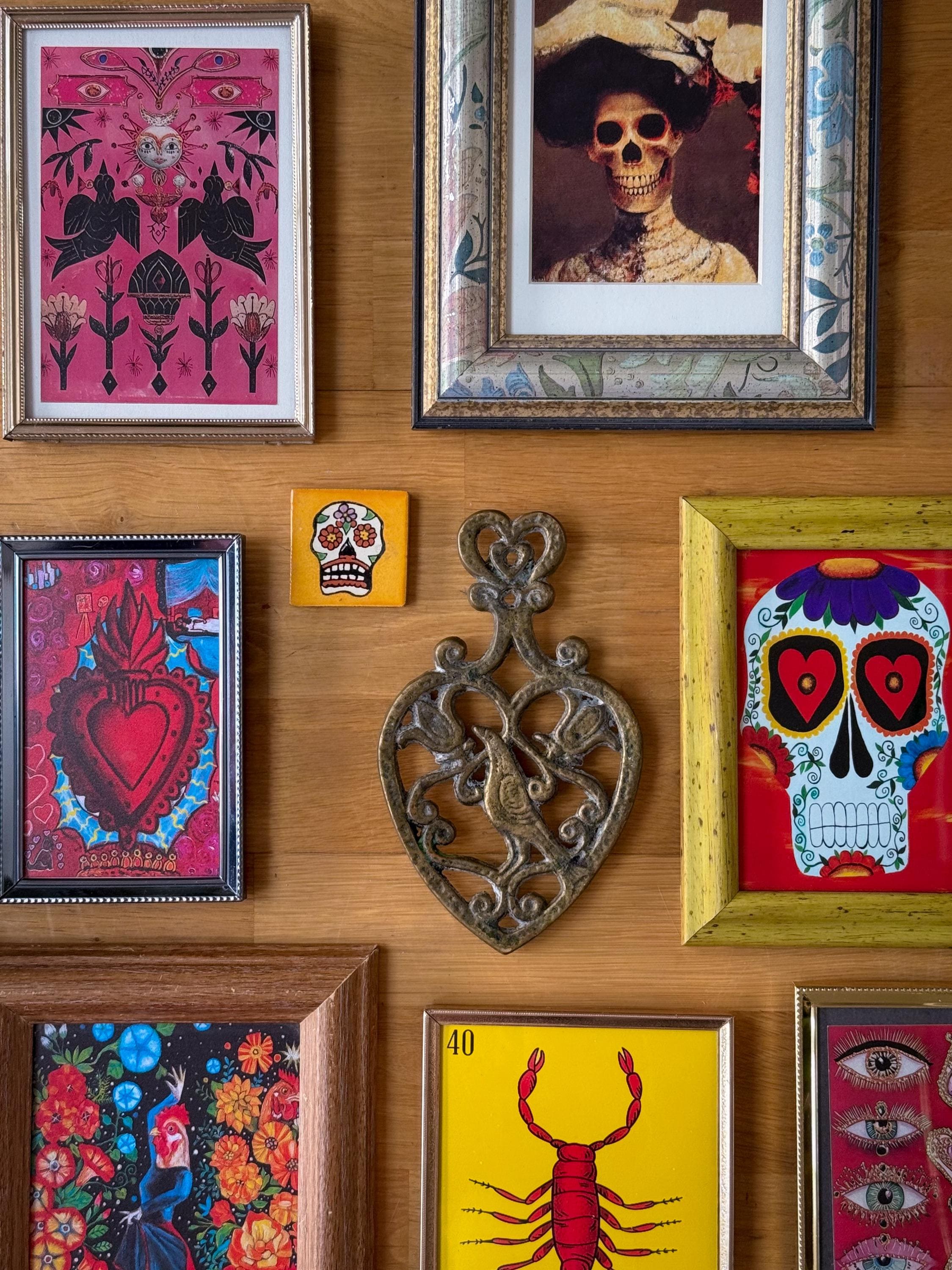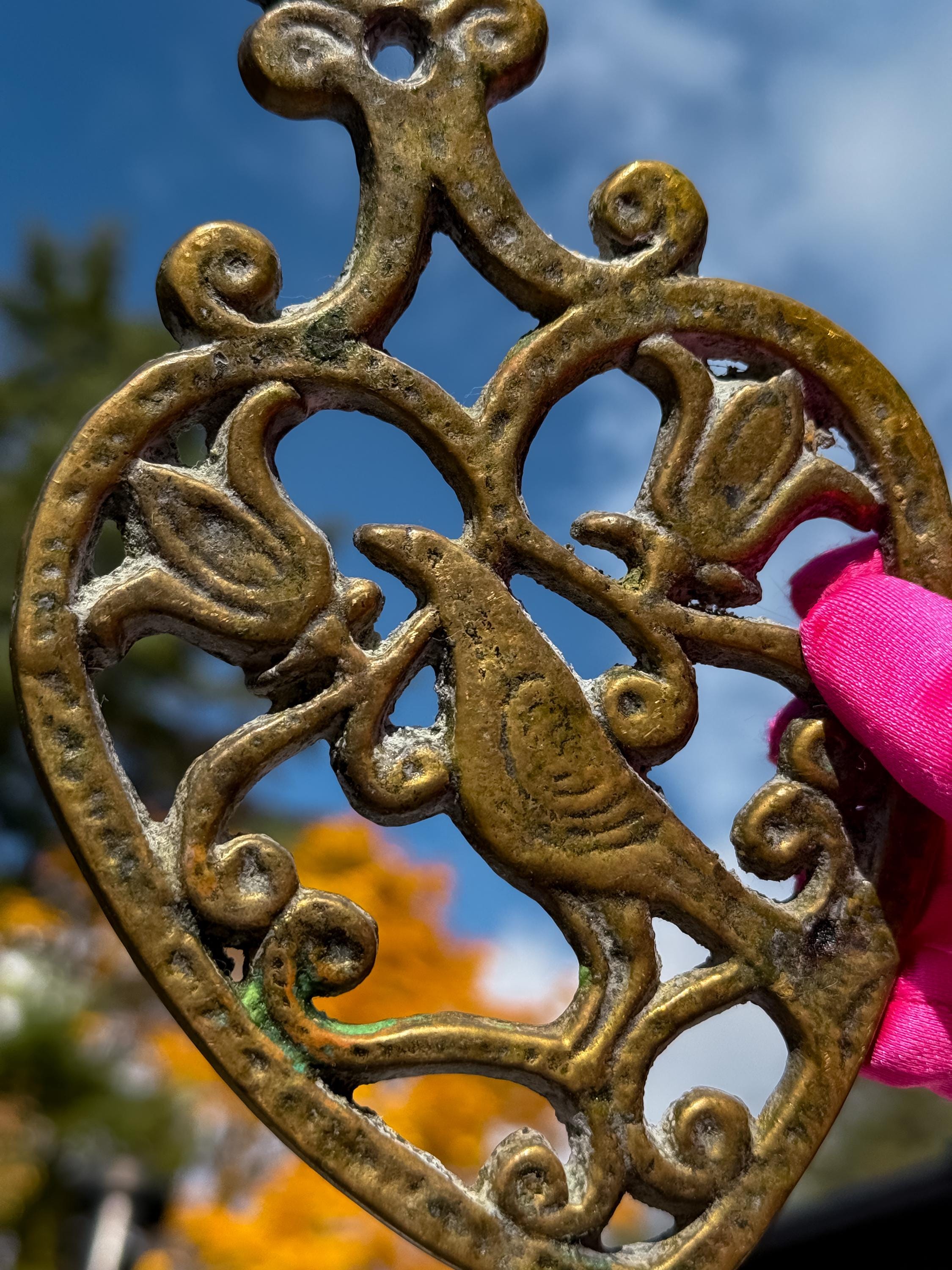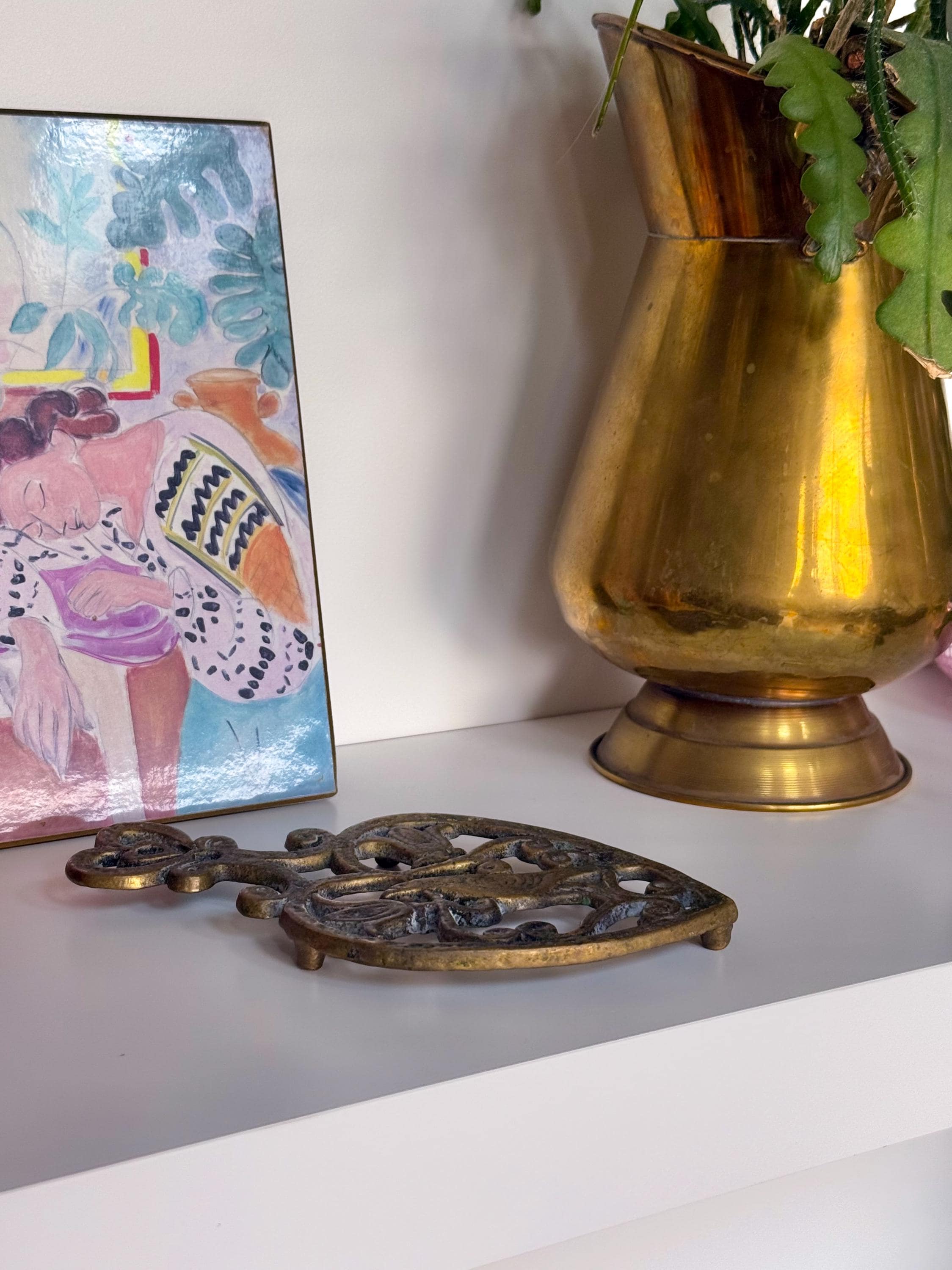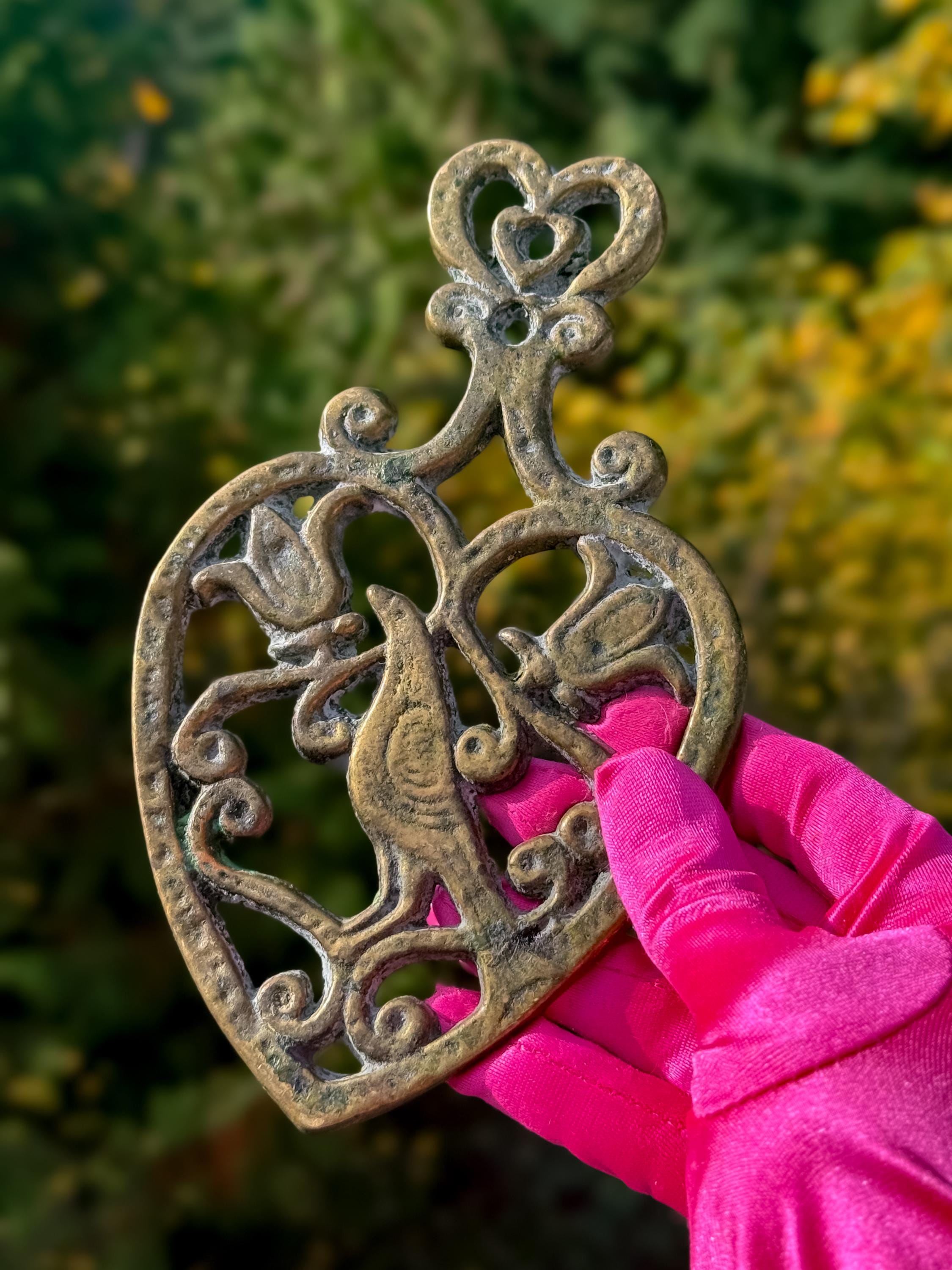 Mid century brass-plate iron Sacred Heart trivet. This gorgeous vintage footed bird trivet can be used in the kitchen for hot pots, or hung on the wall. It's quite weighty & has lots of patina.