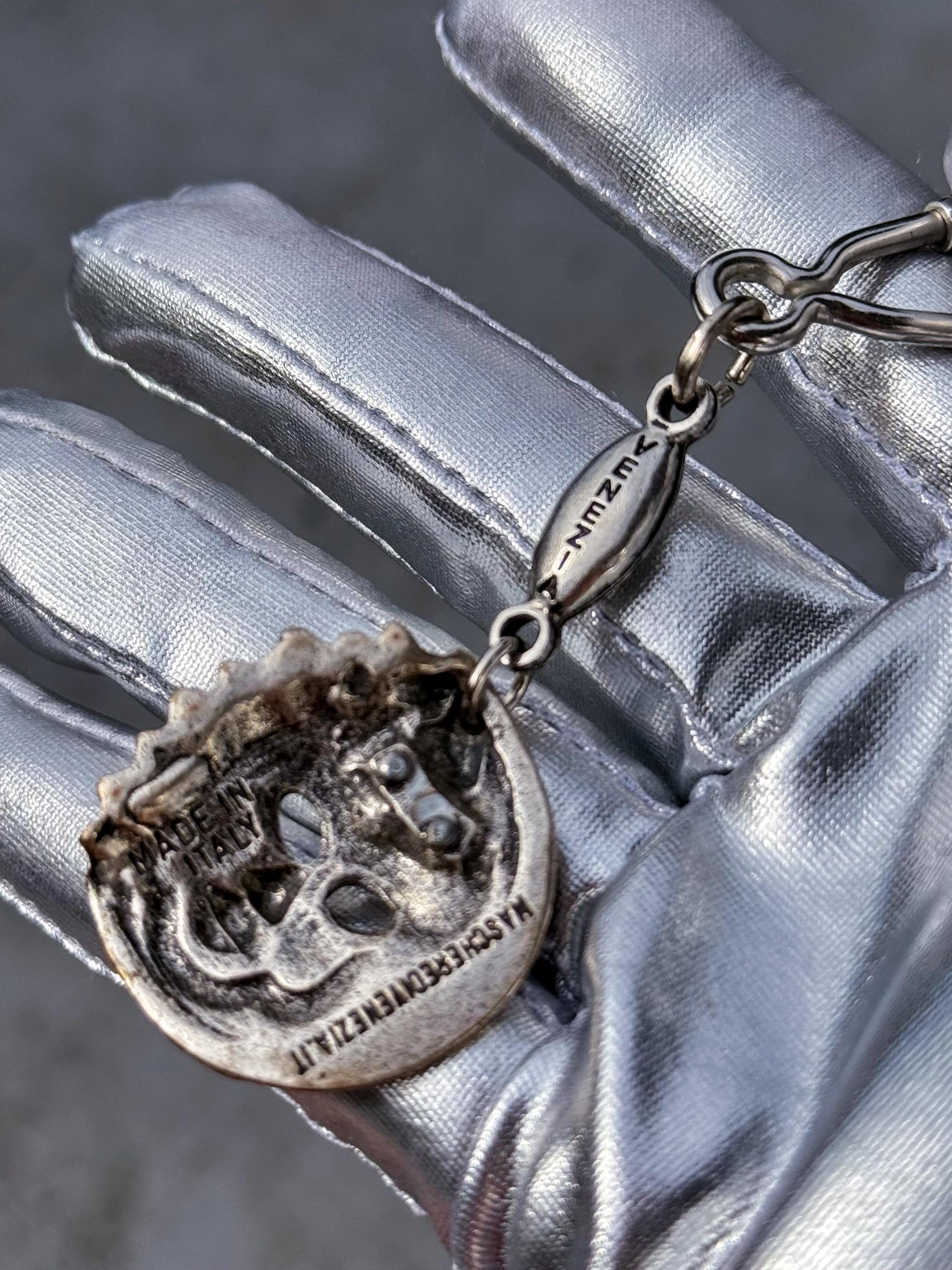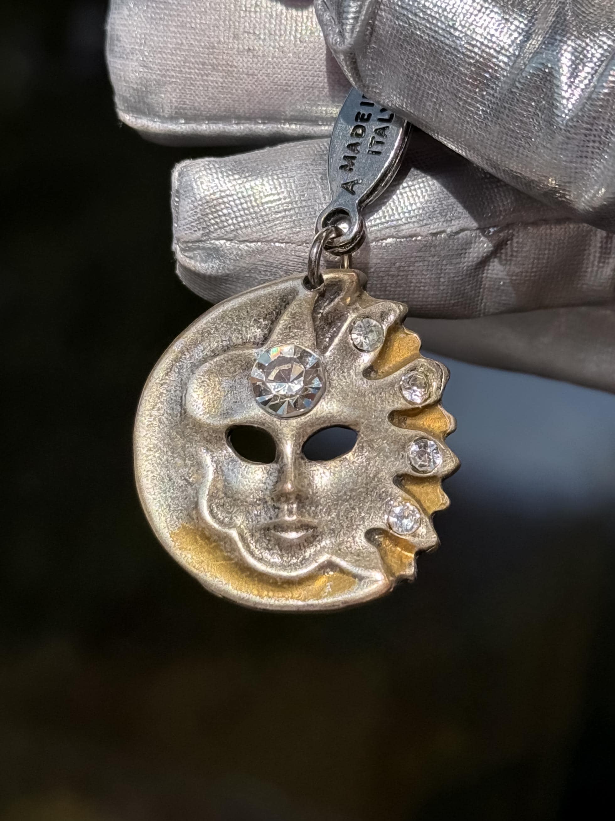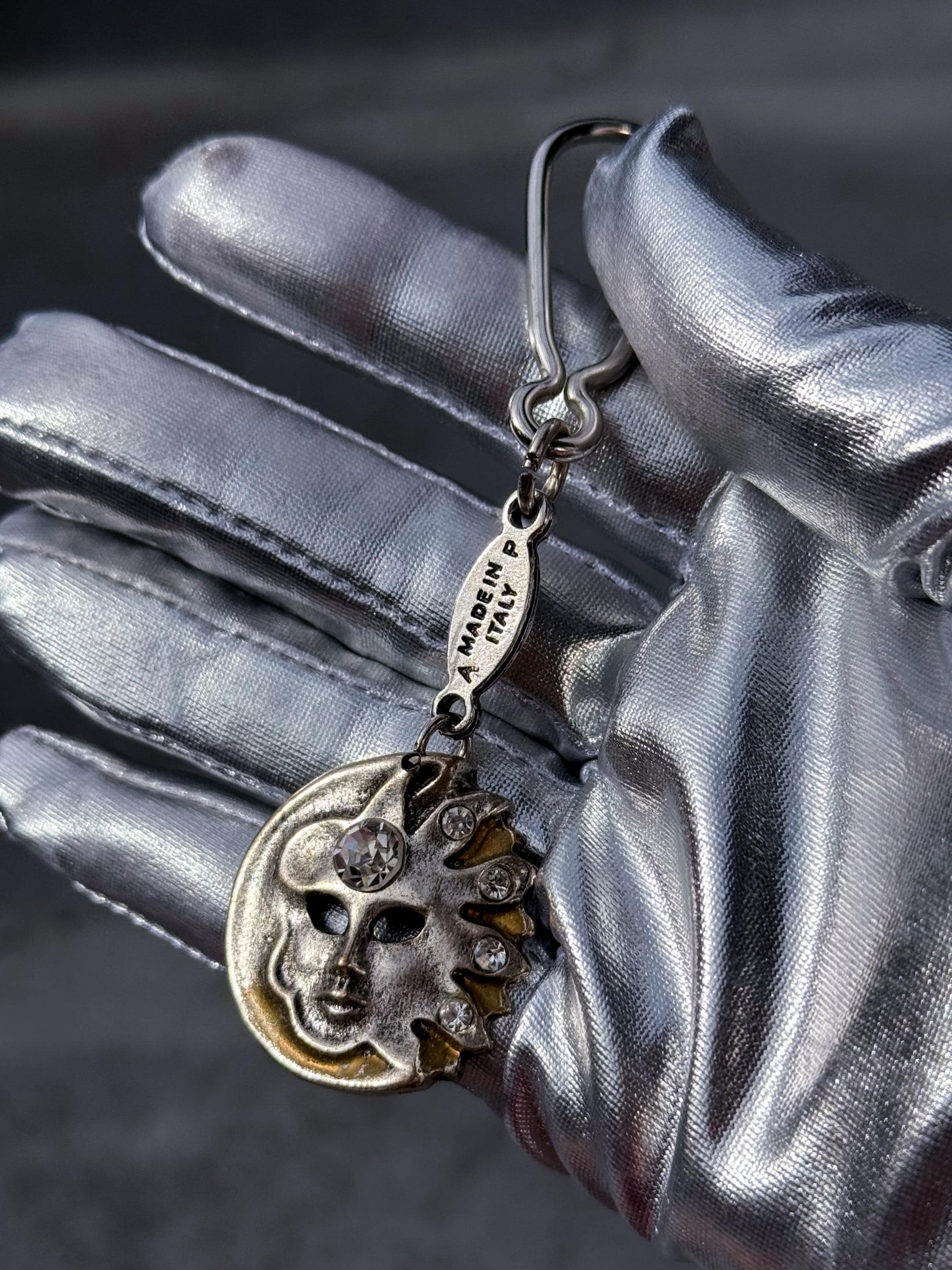 Fab creepy vintage celestial keychain, made in Italy by Mascheredi Venezia. Venetian mask in silver-tone & gold-tone metal, and covered in iridescent crystals.