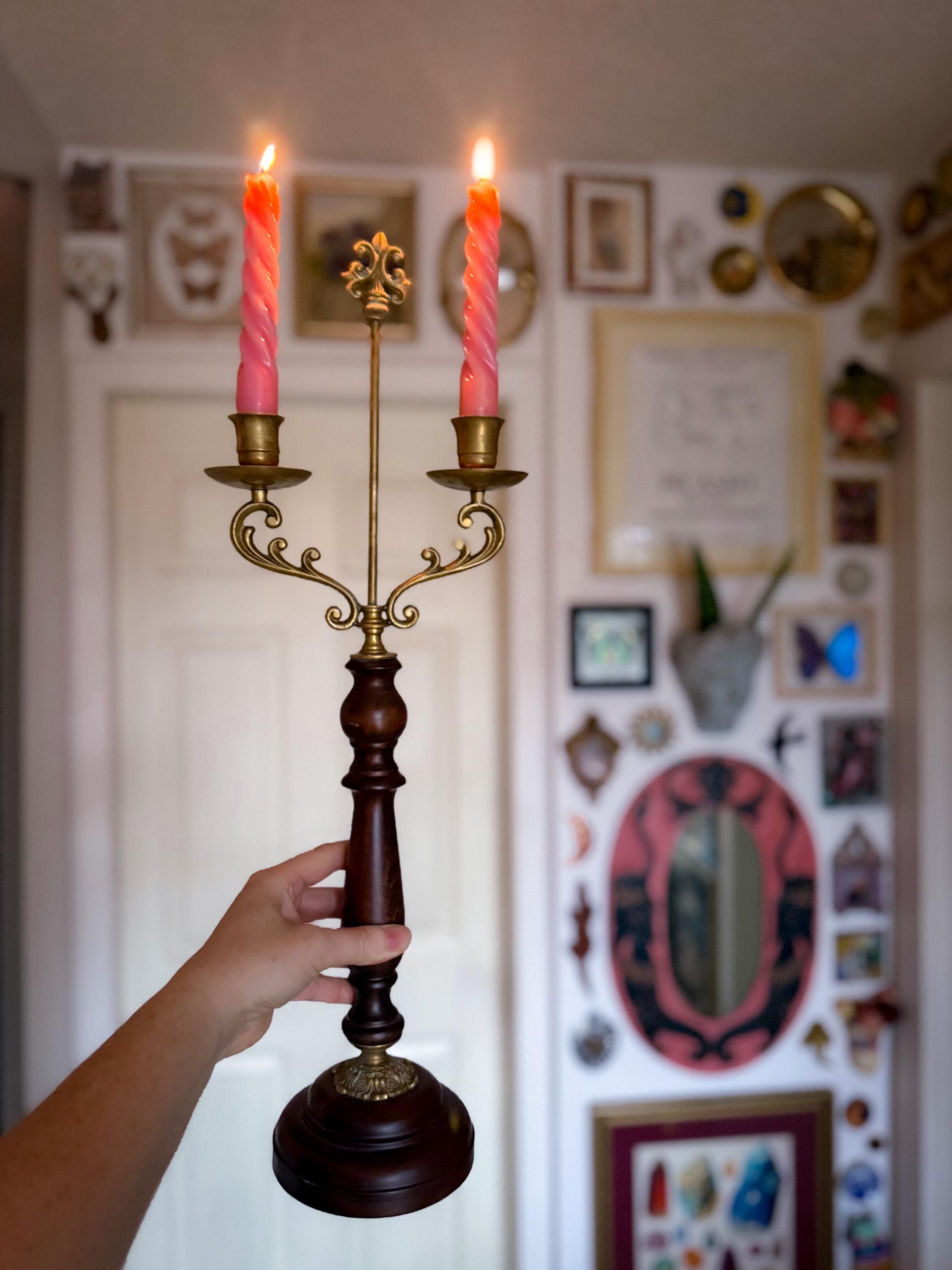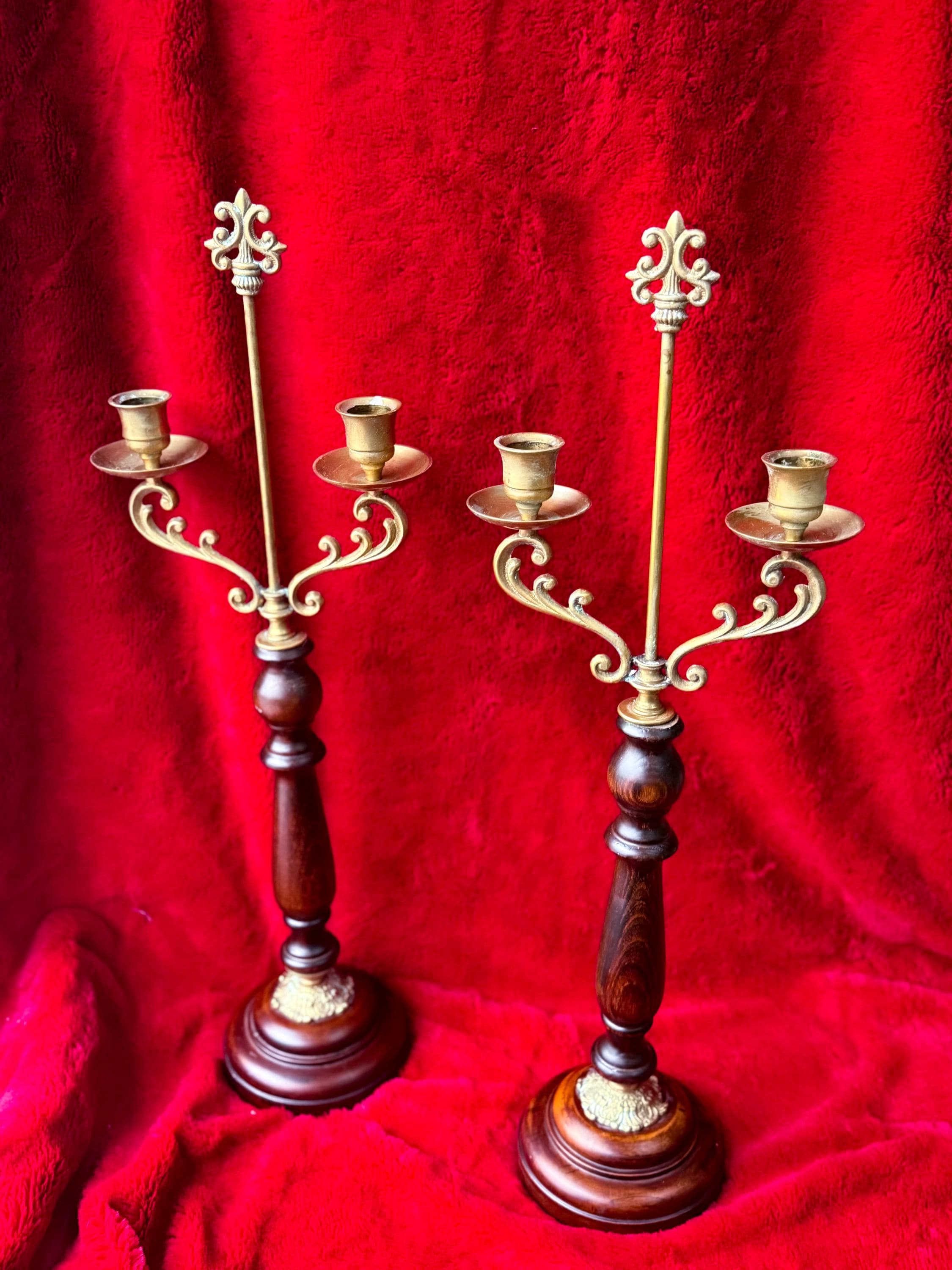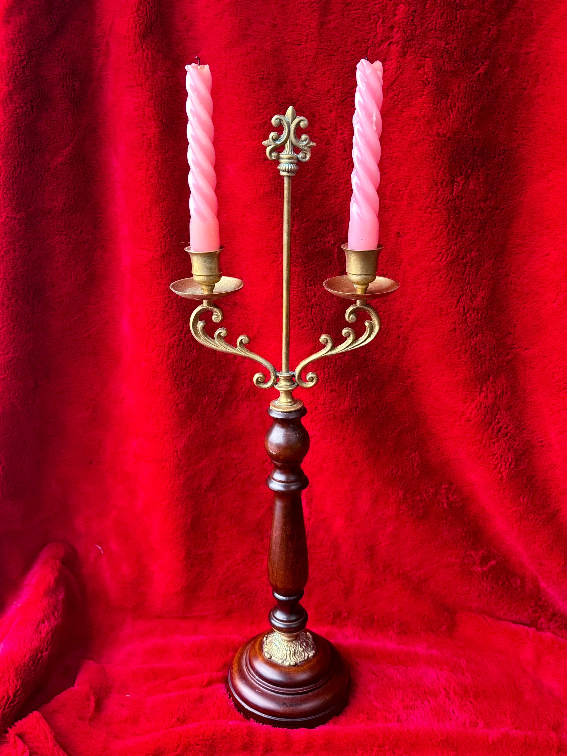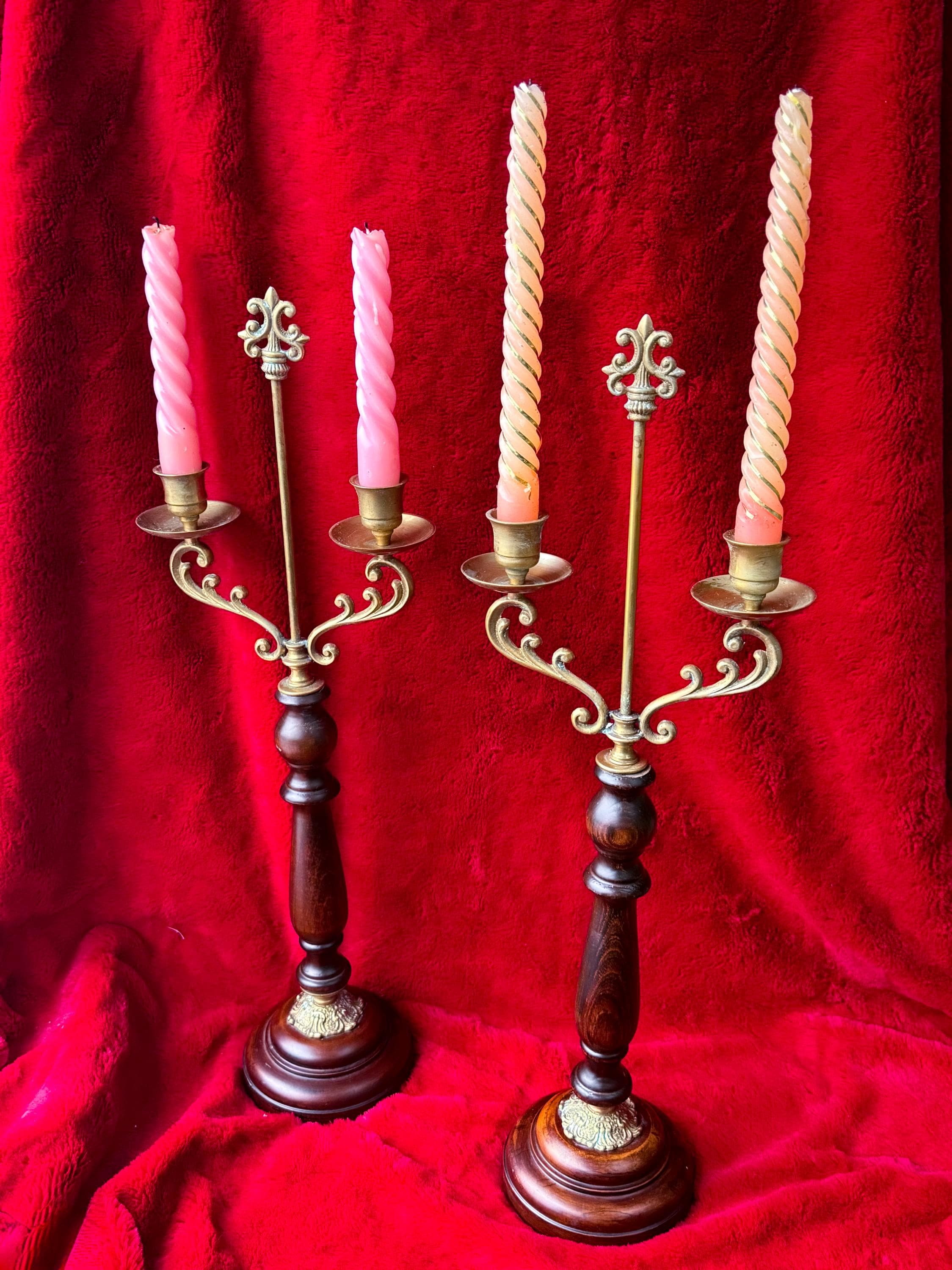 Two tall fabulous vintage candelabras. Heavy brass & wood double taper holders with lots of verdigris. These are in really great condition & I love the verdigris. Sold separately or as a pair.