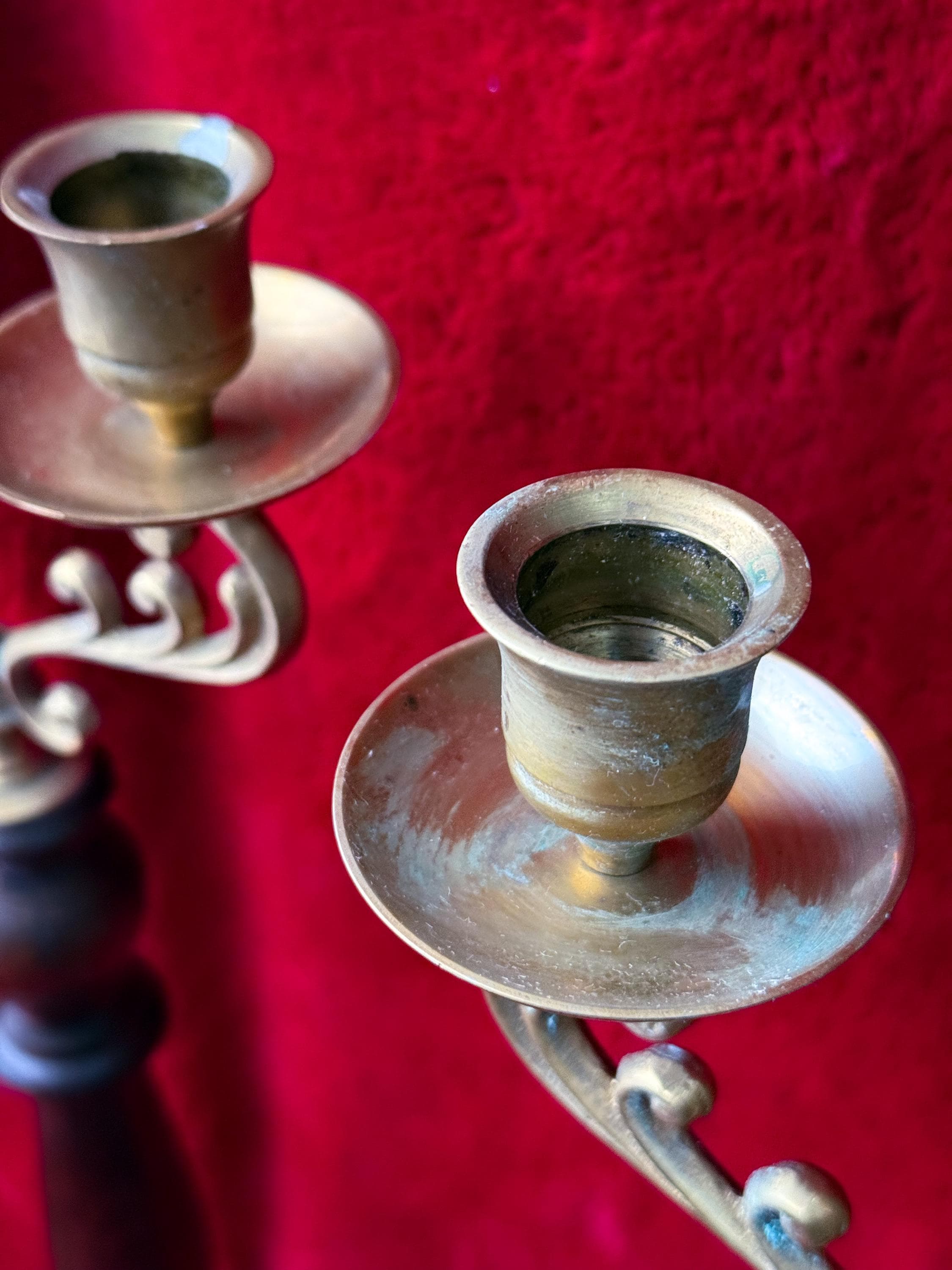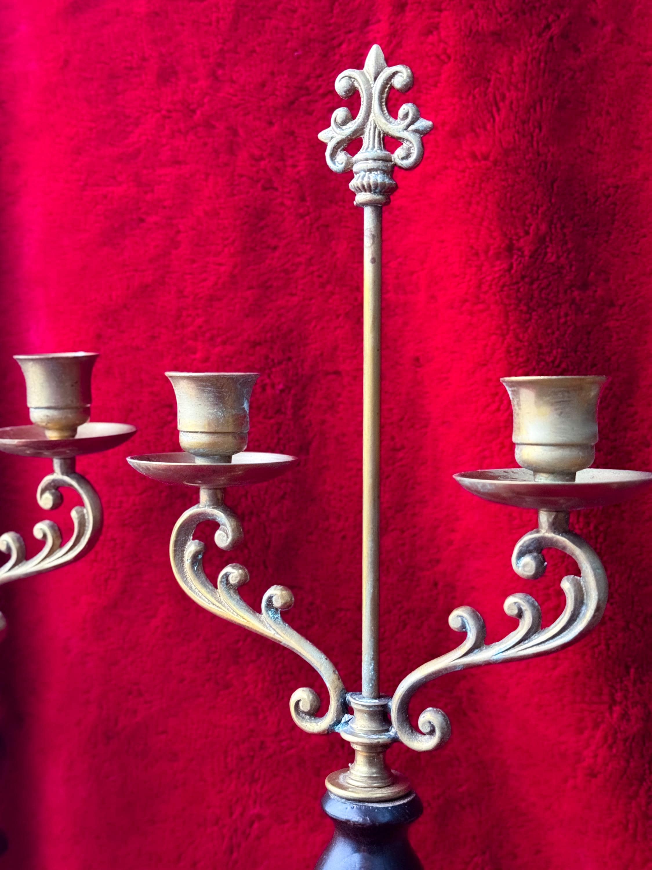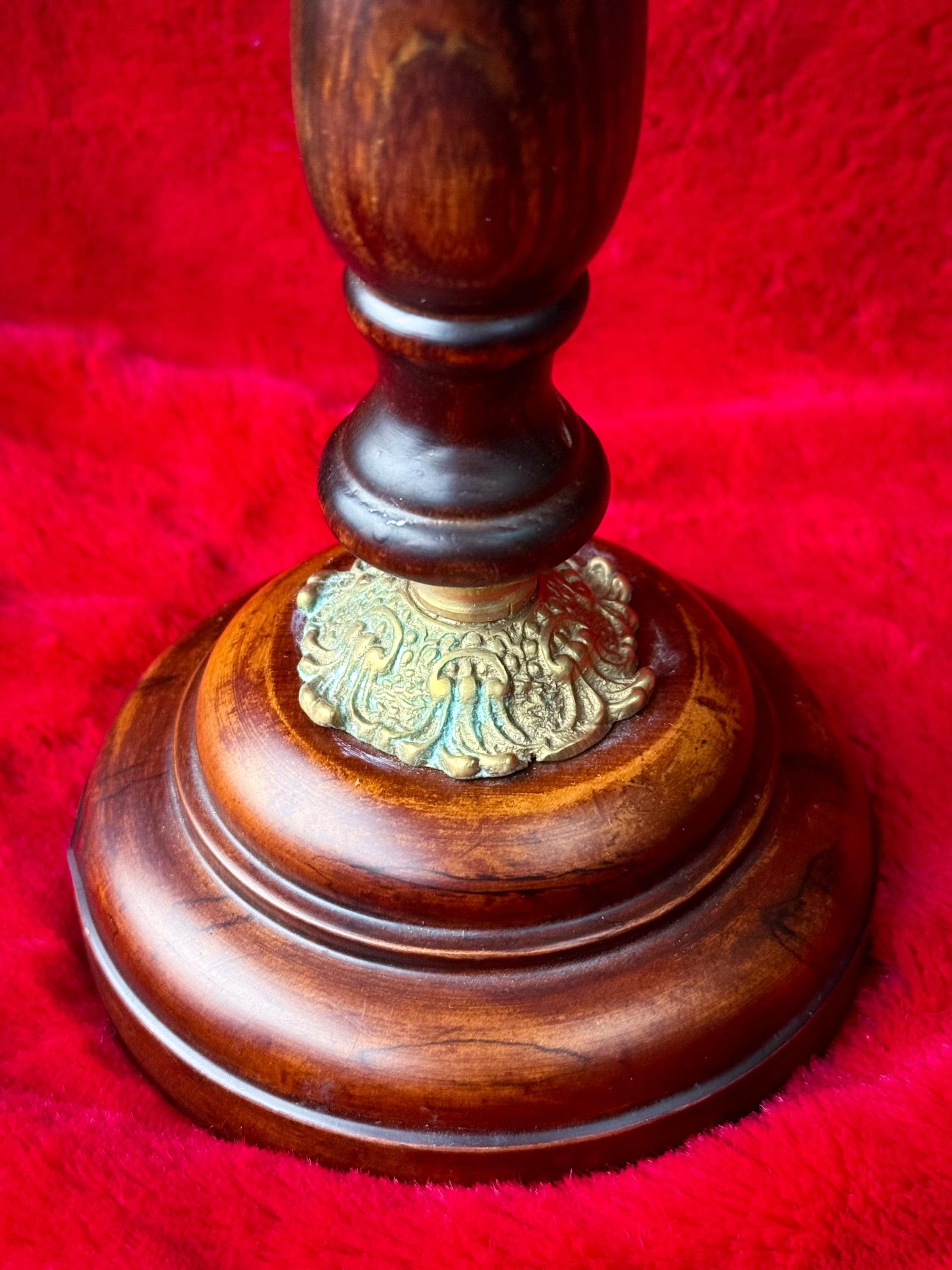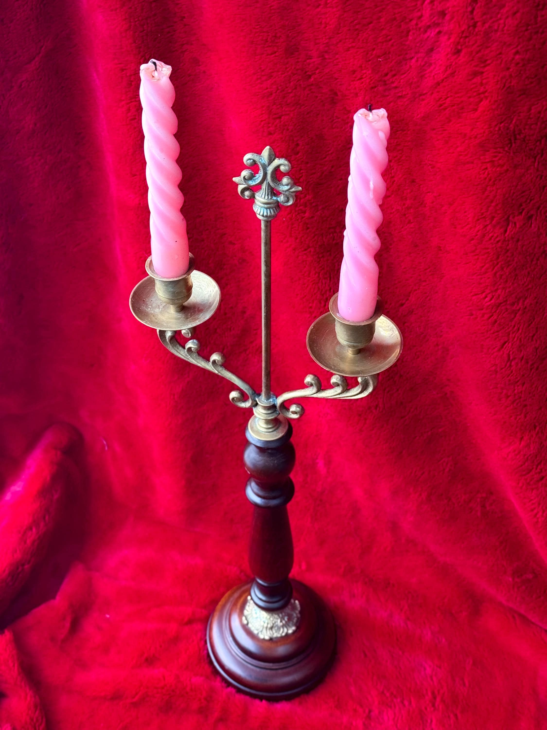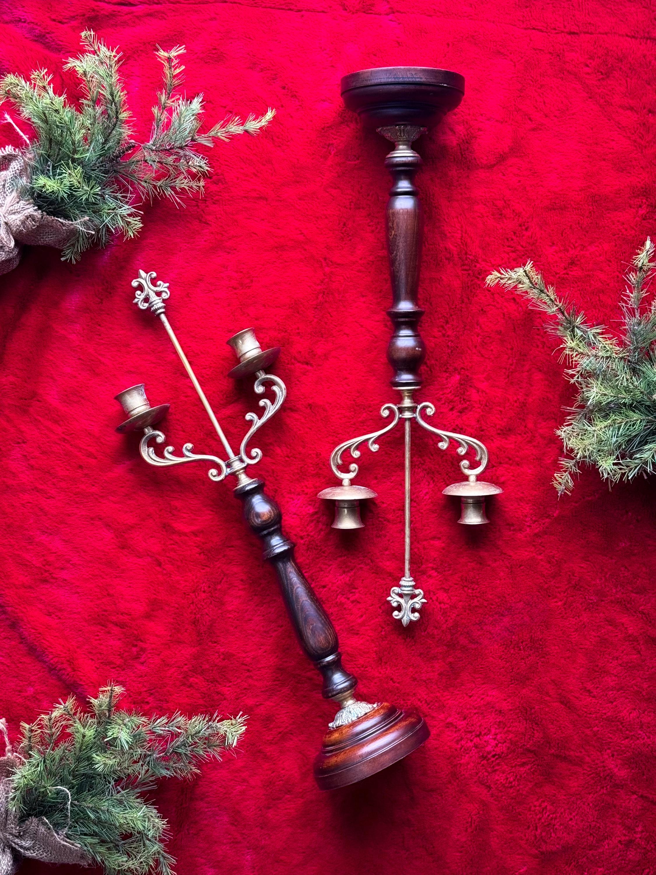 Two tall fabulous vintage candelabras. Heavy brass & wood double taper holders with lots of verdigris. These are in really great condition & I love the verdigris. Sold separately or as a pair.