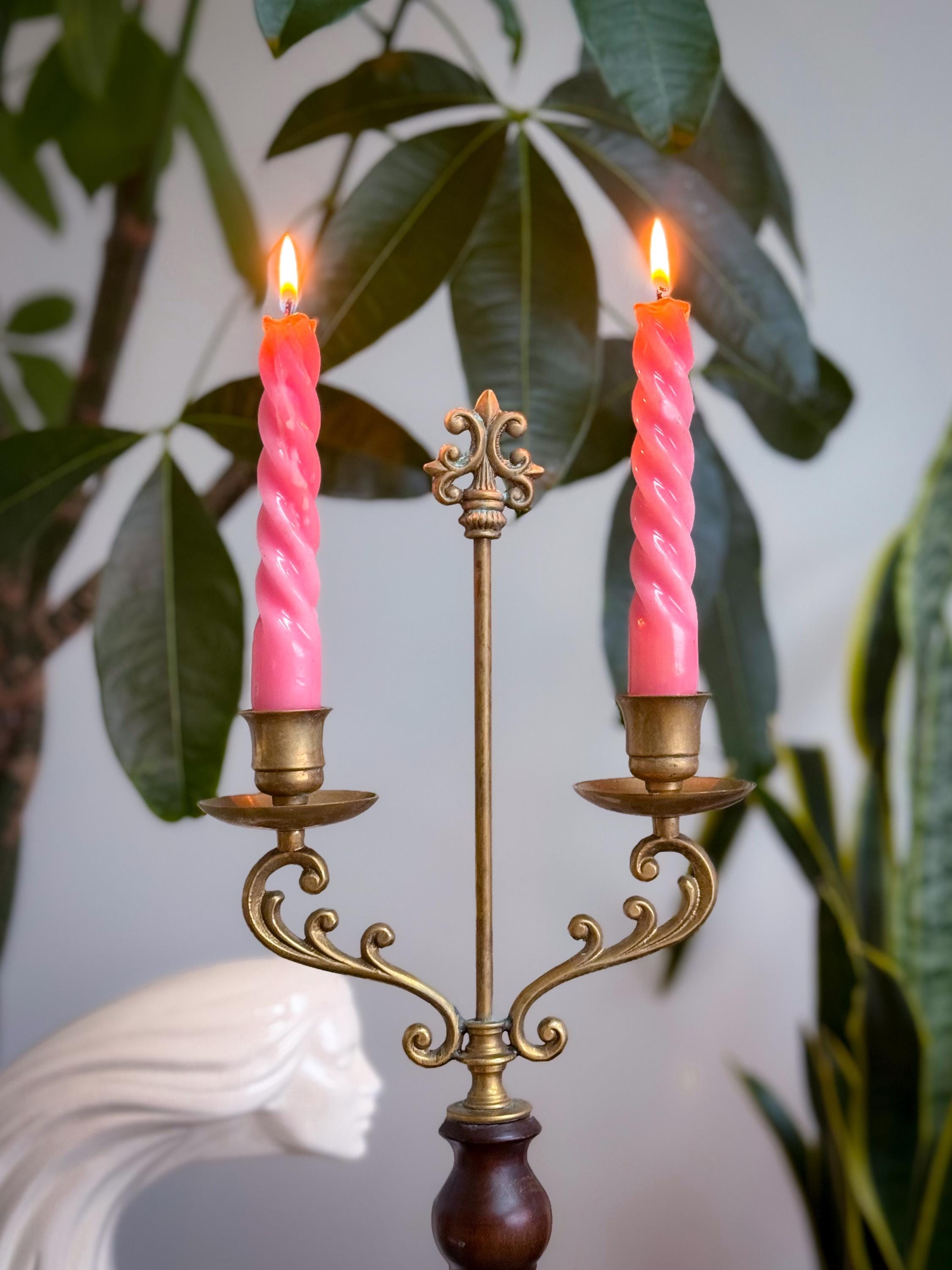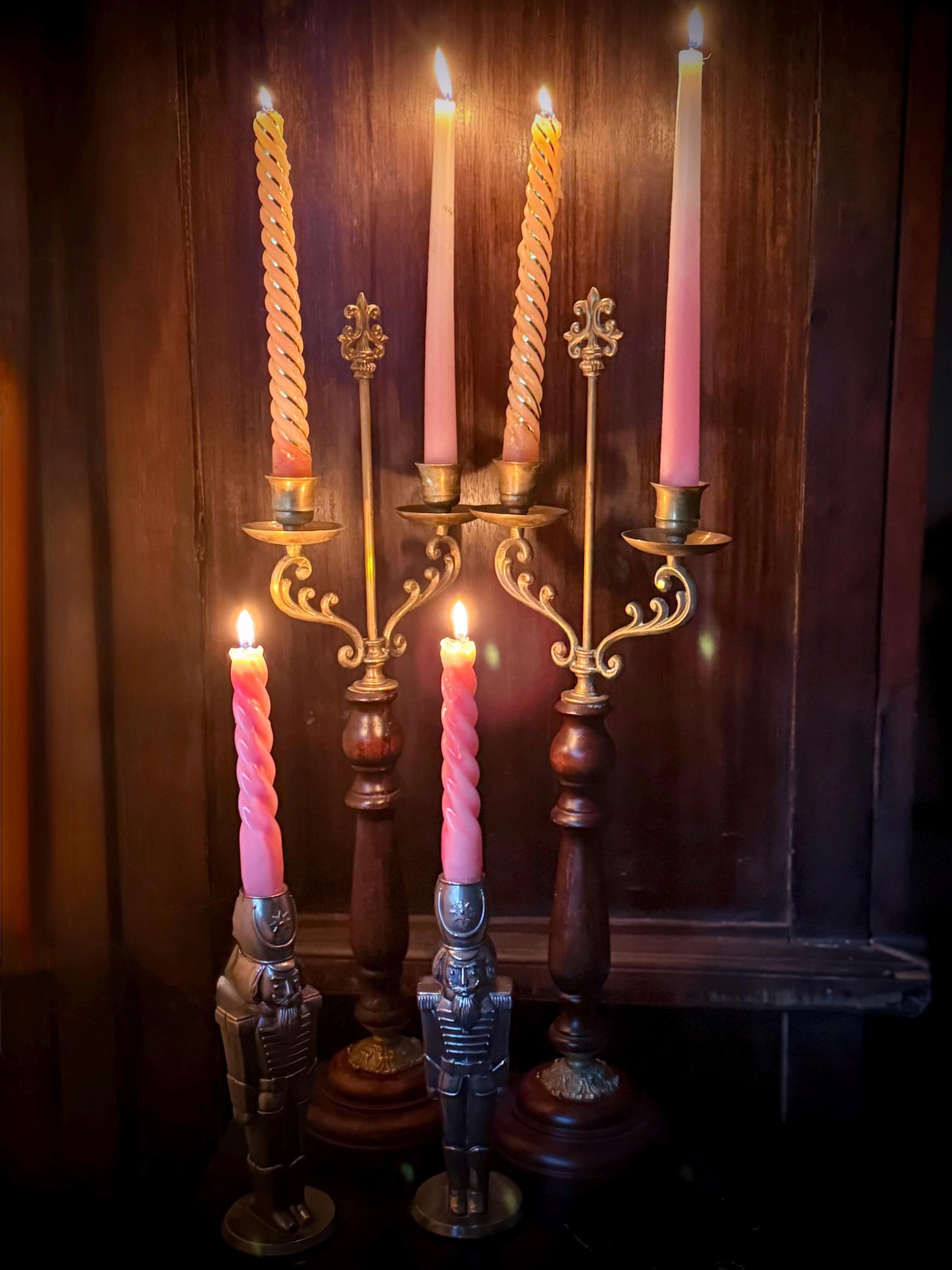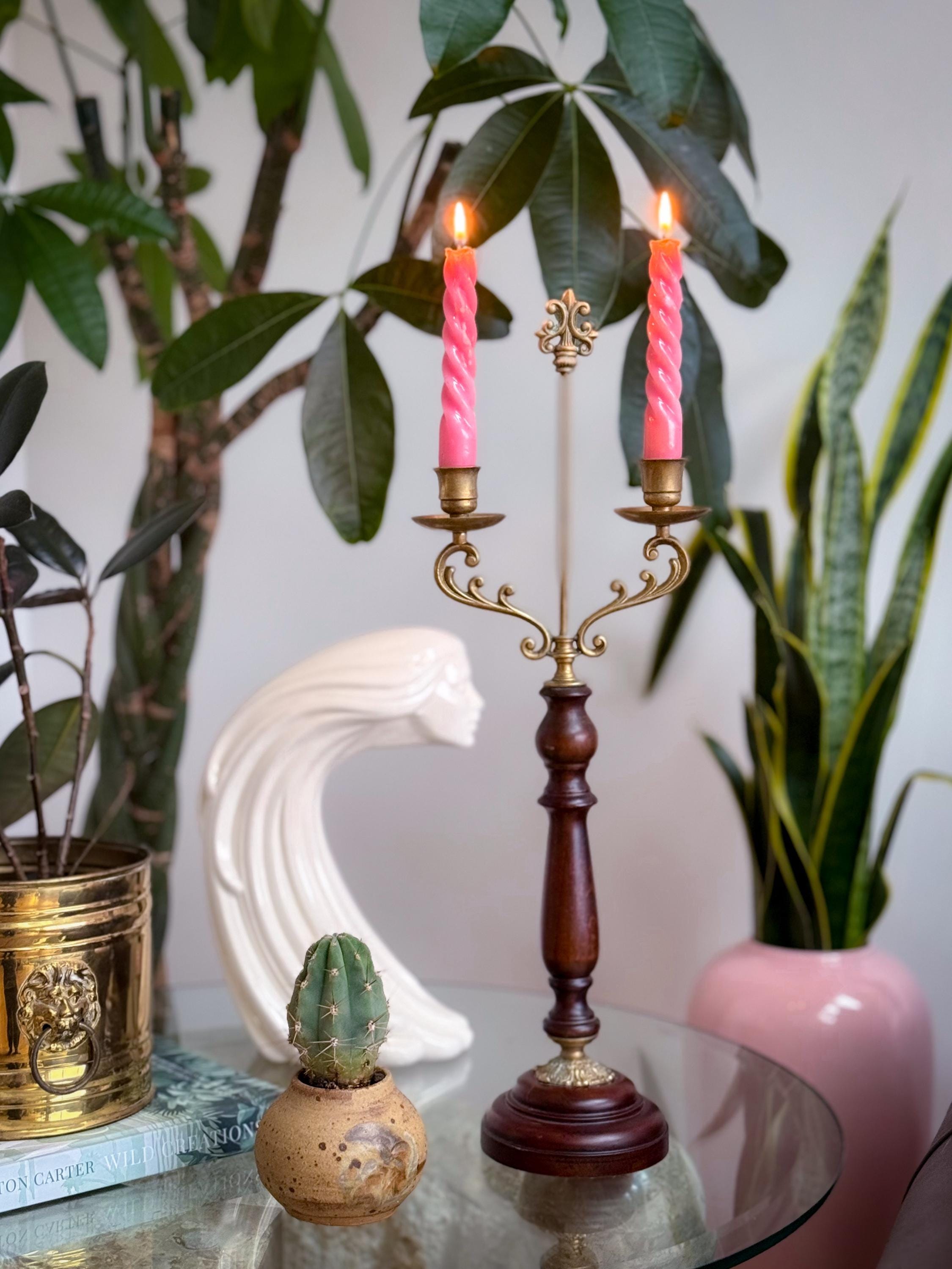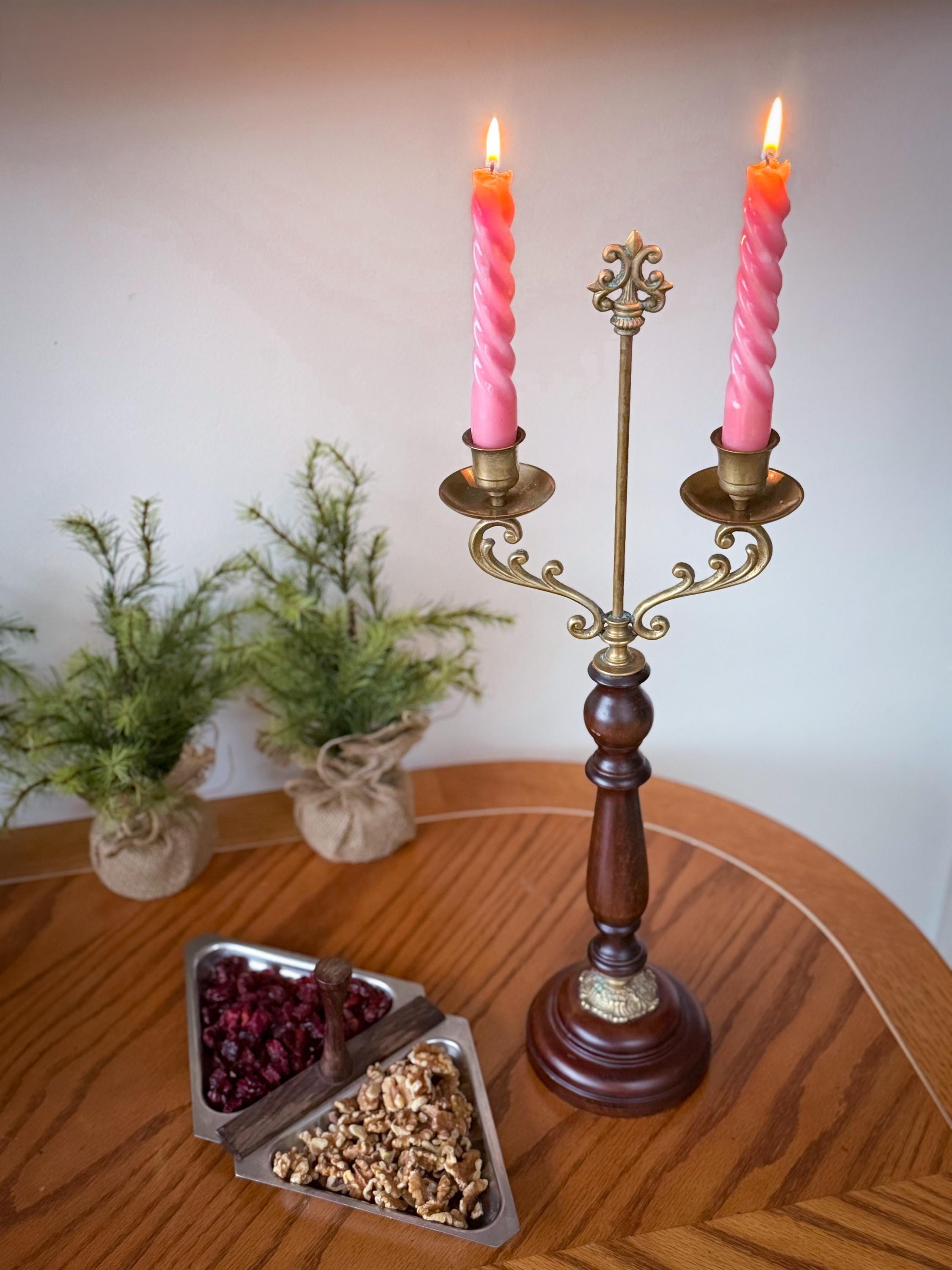 Two tall fabulous vintage candelabras. Heavy brass & wood double taper holders with lots of verdigris. These are in really great condition & I love the verdigris. Sold separately or as a pair.