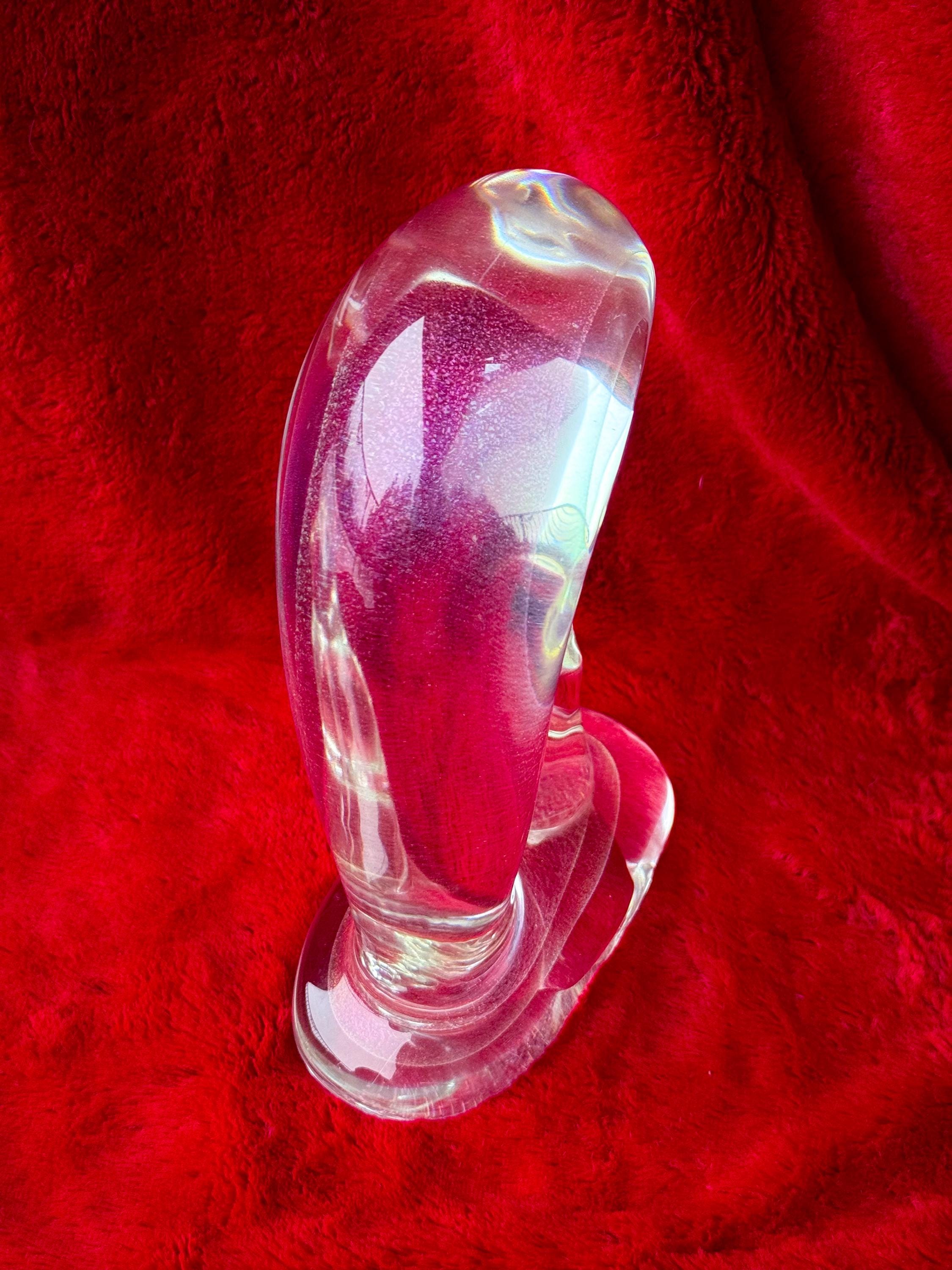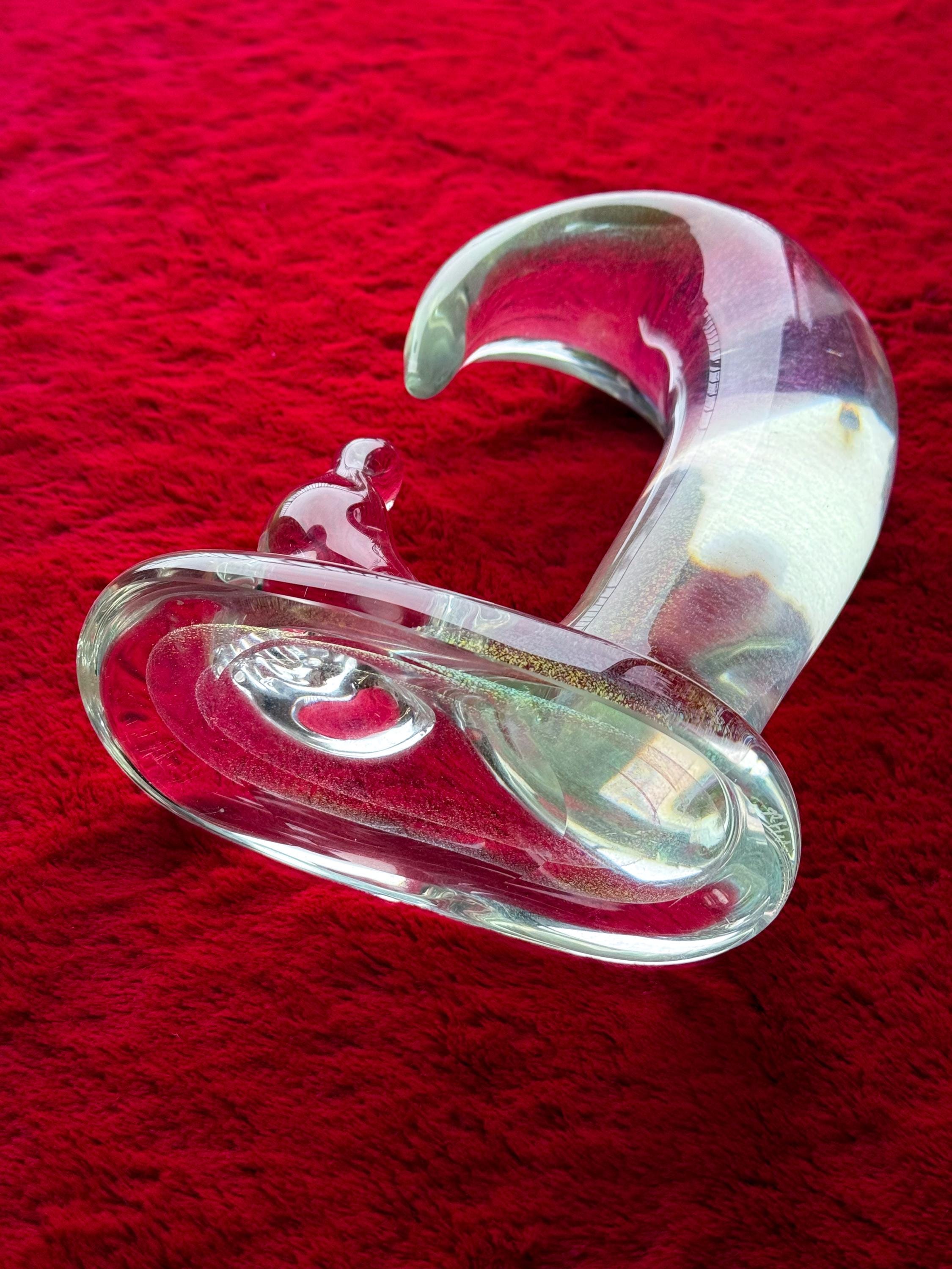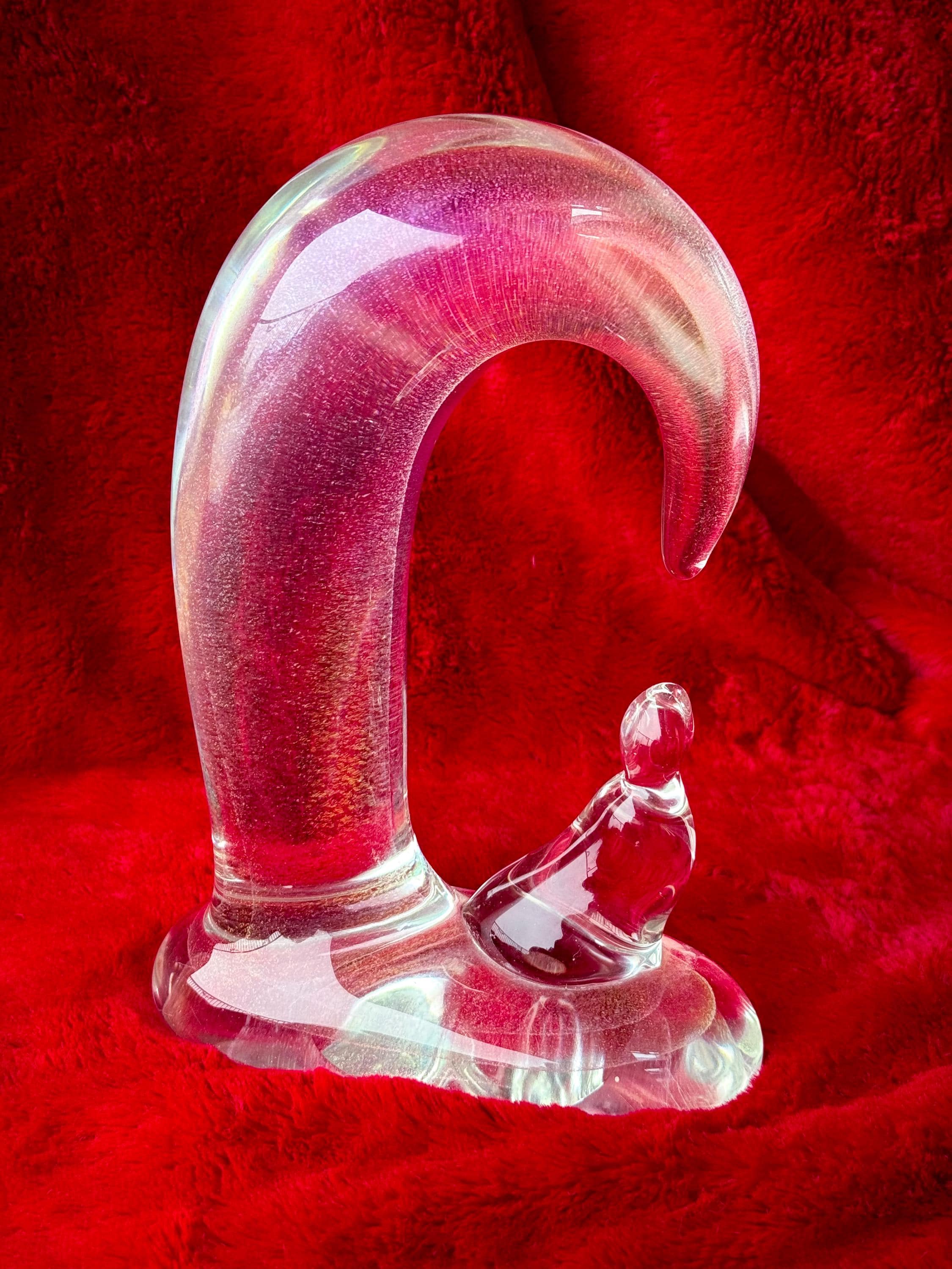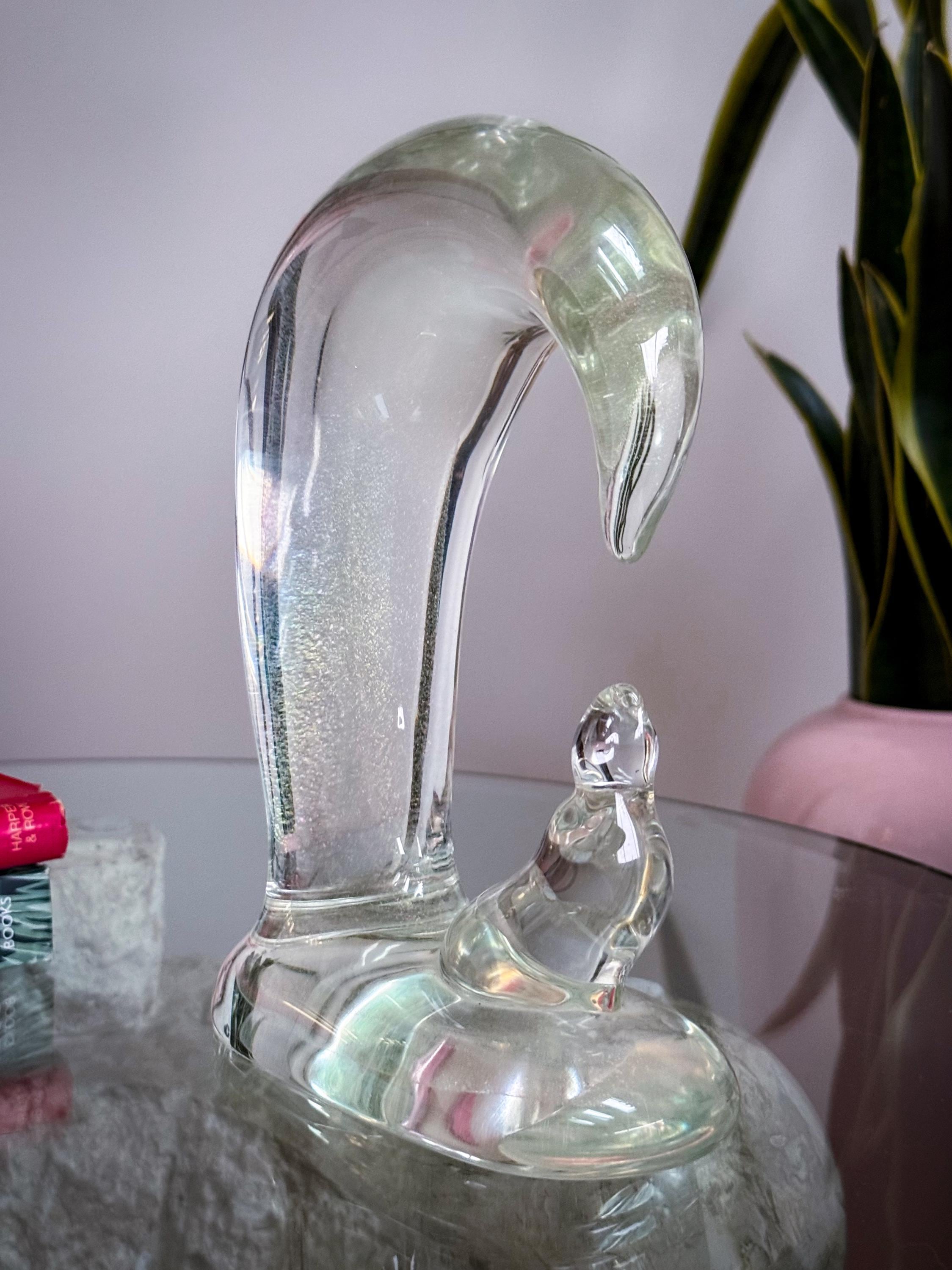 Large & VERY heavy vintage glass penguin mama & baby sculpture. This abstract figural glass is full of fabulous rainbow flecks! Etched signature on the rear base. No chips or cracks.