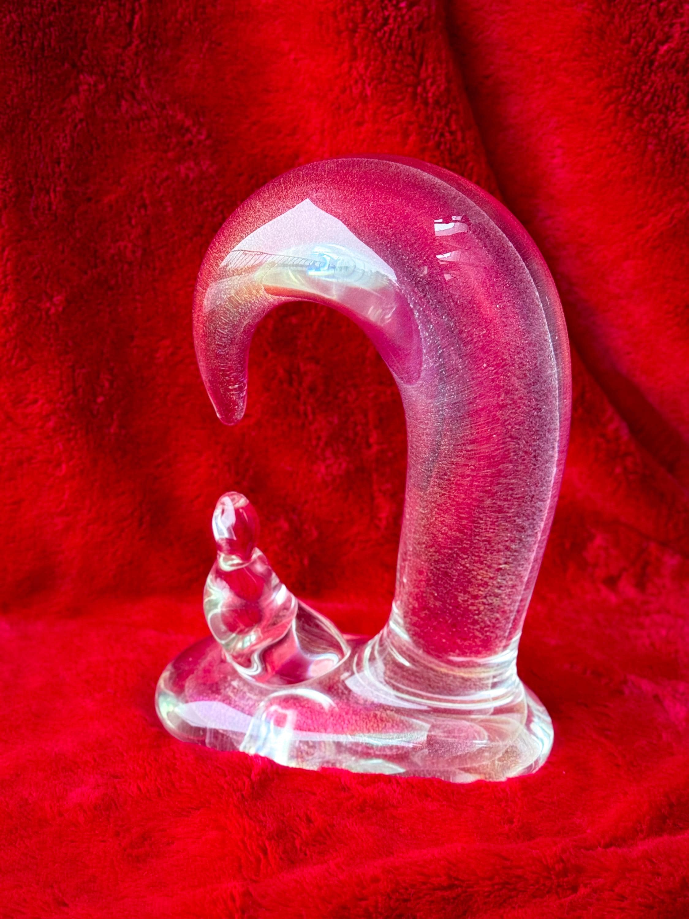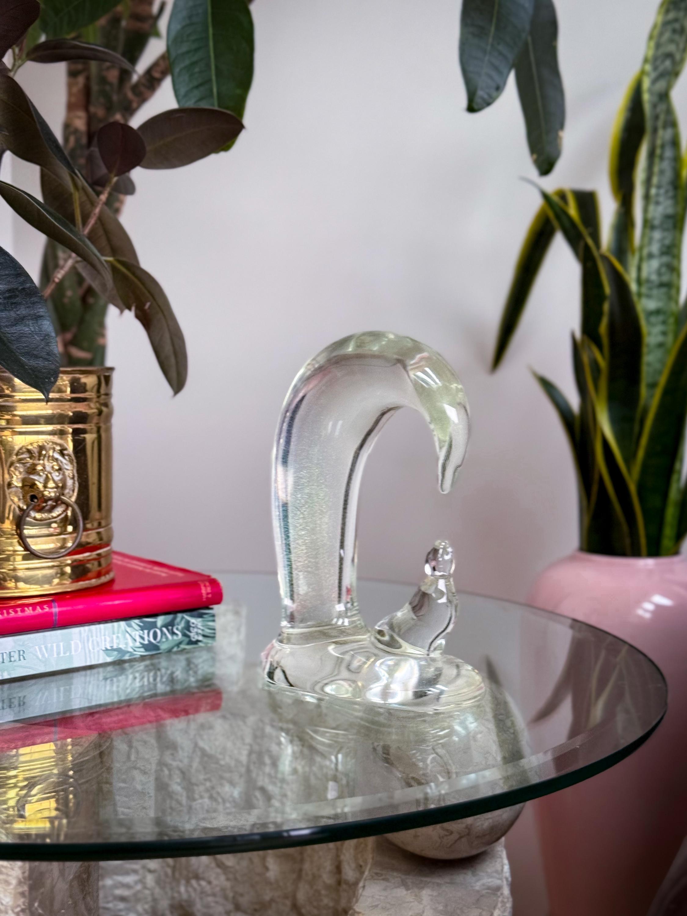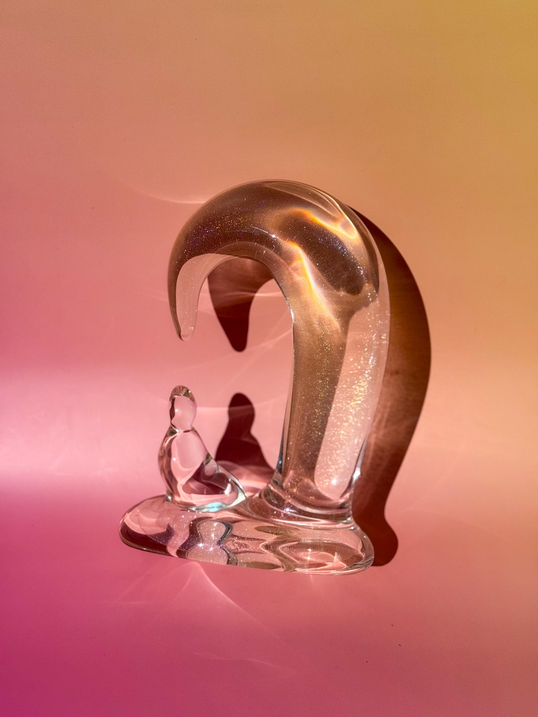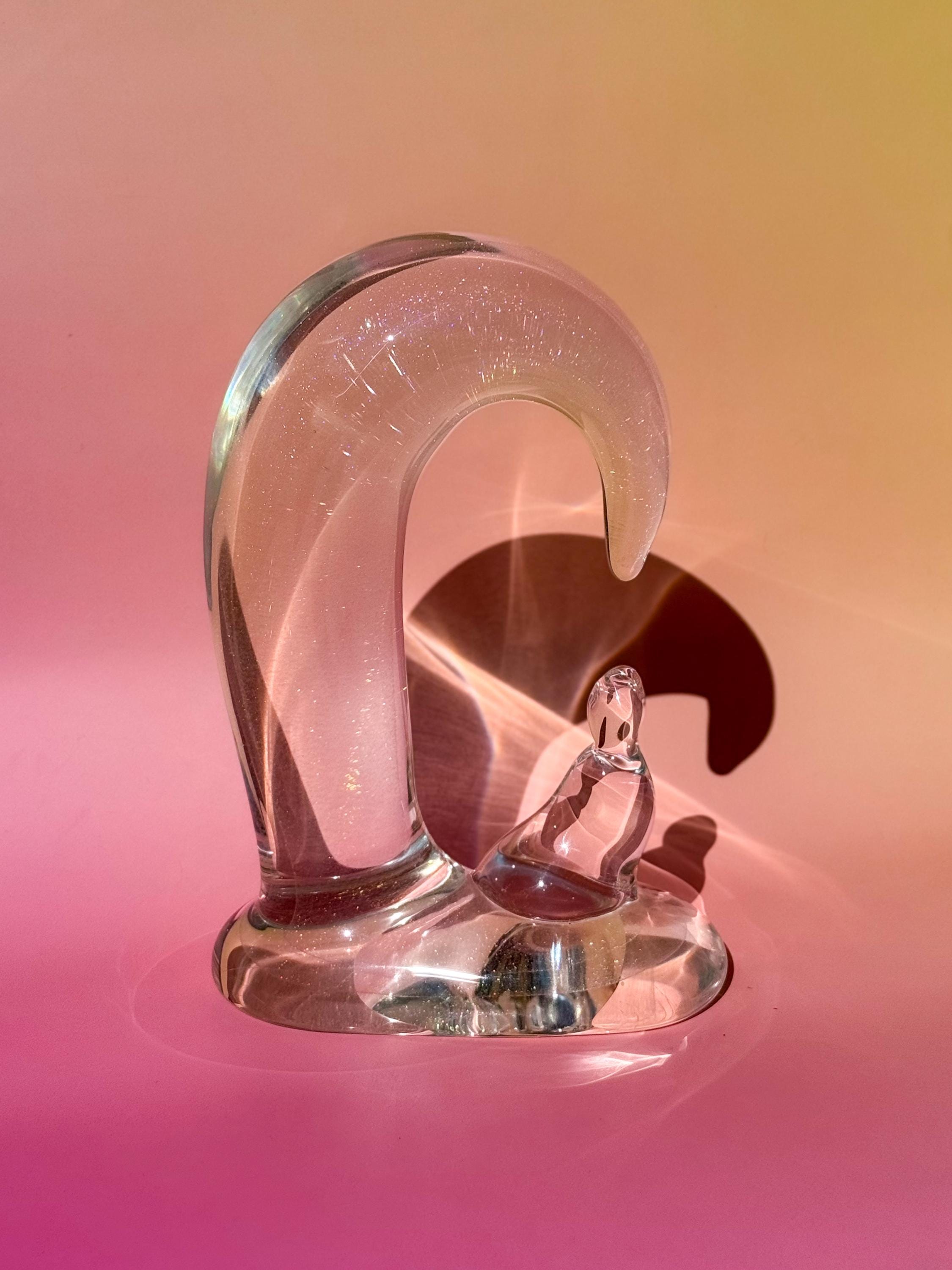 Large & VERY heavy vintage glass penguin mama & baby sculpture. This abstract figural glass is full of fabulous rainbow flecks! Etched signature on the rear base. No chips or cracks.
