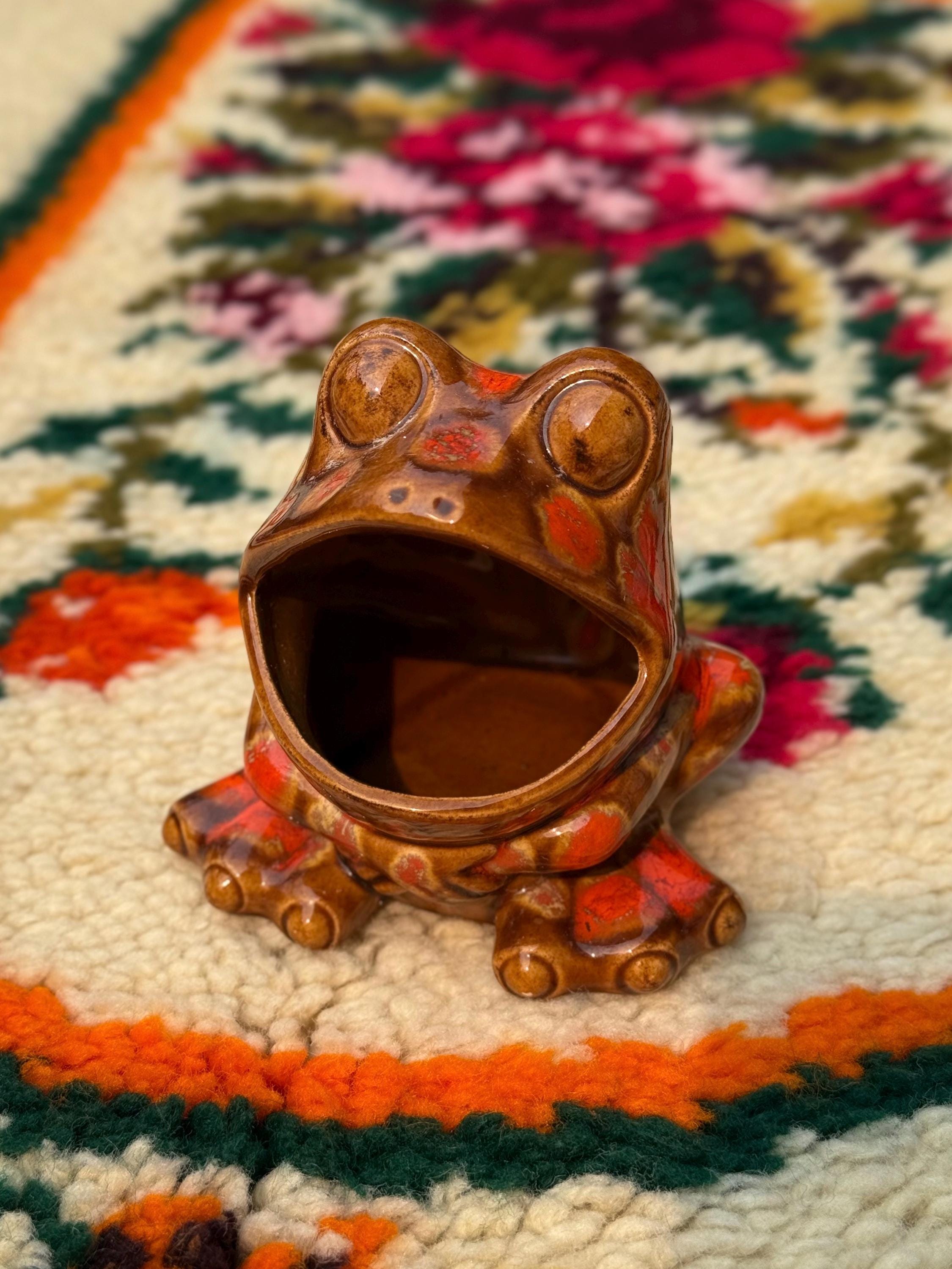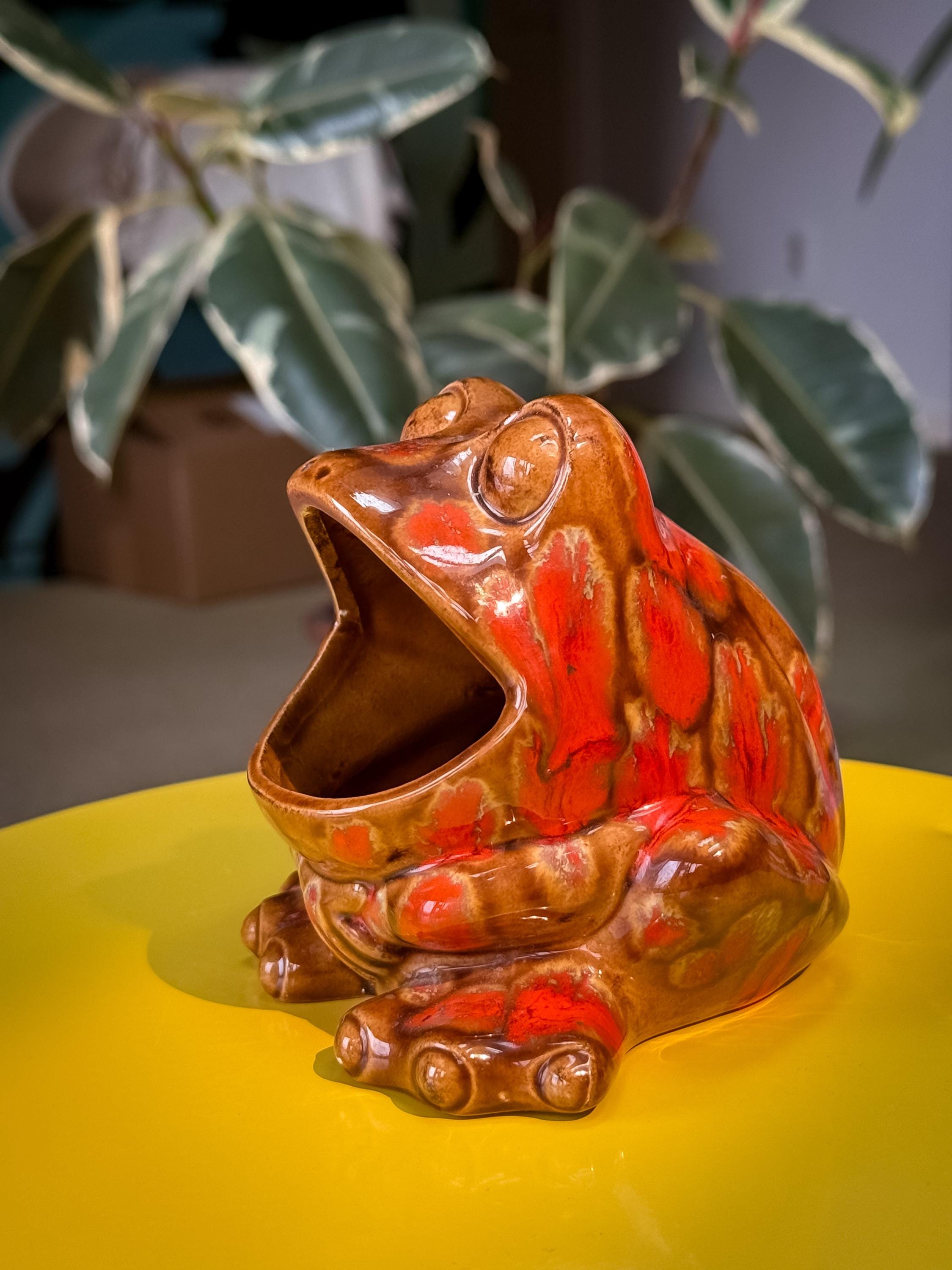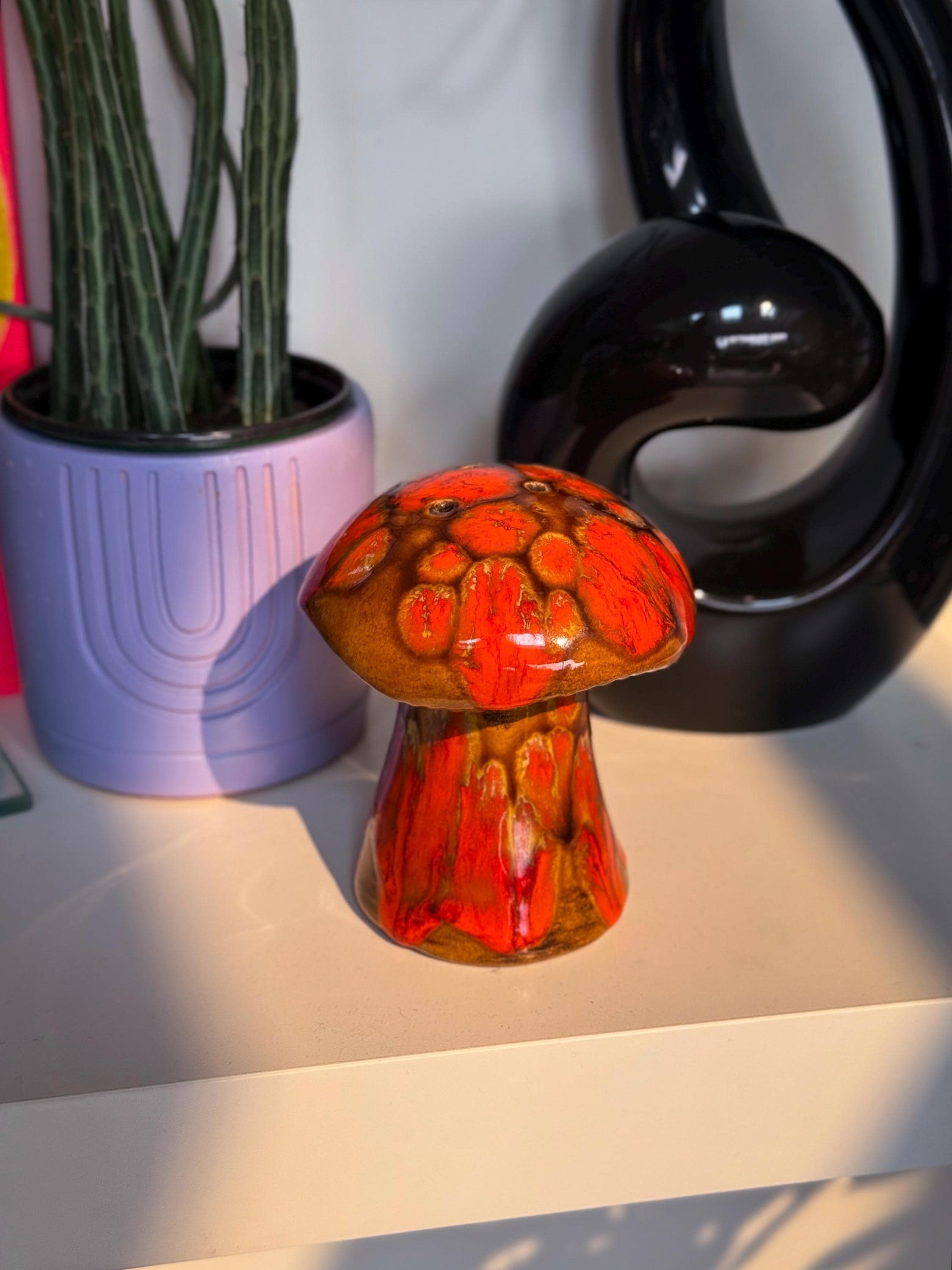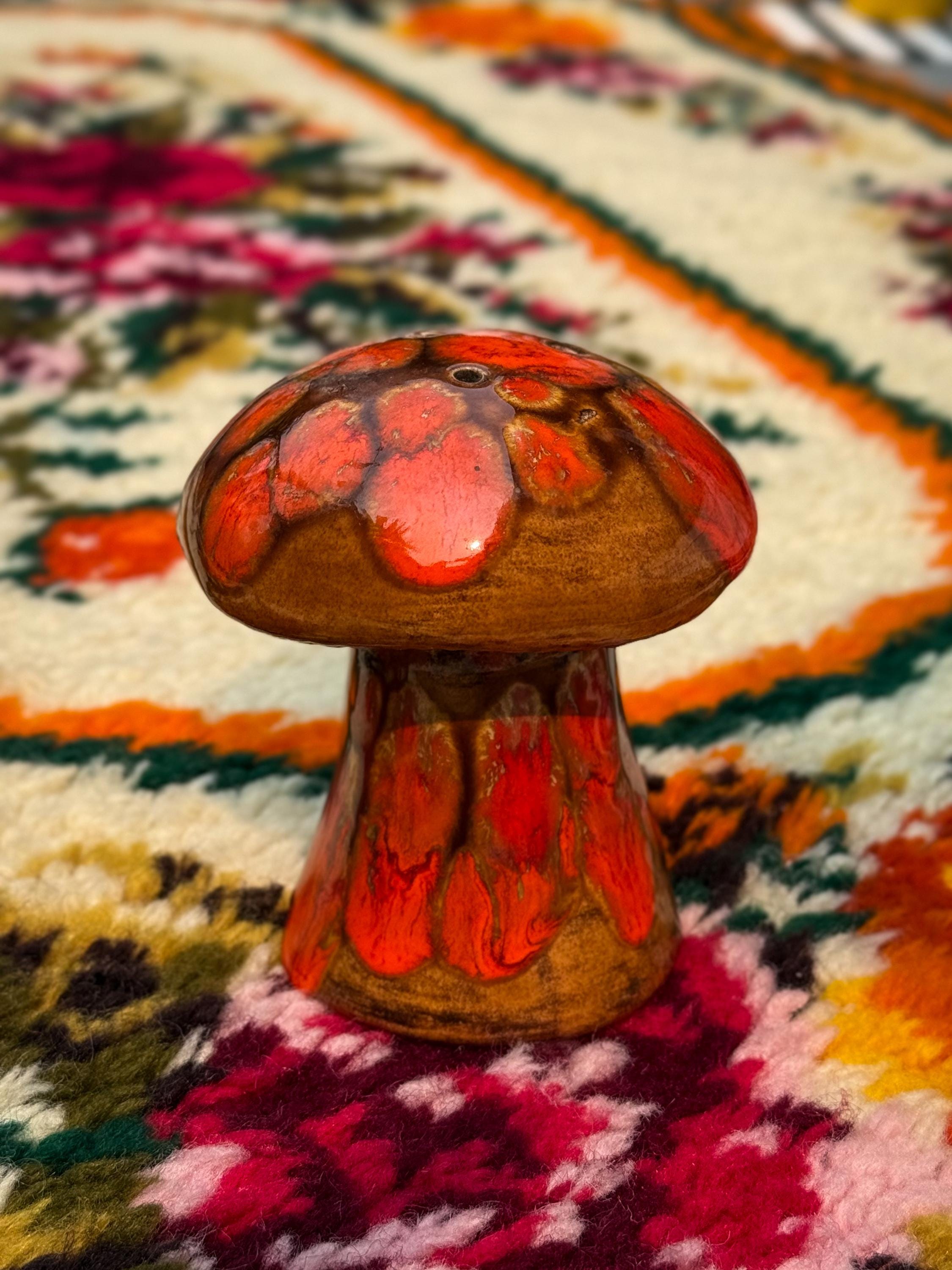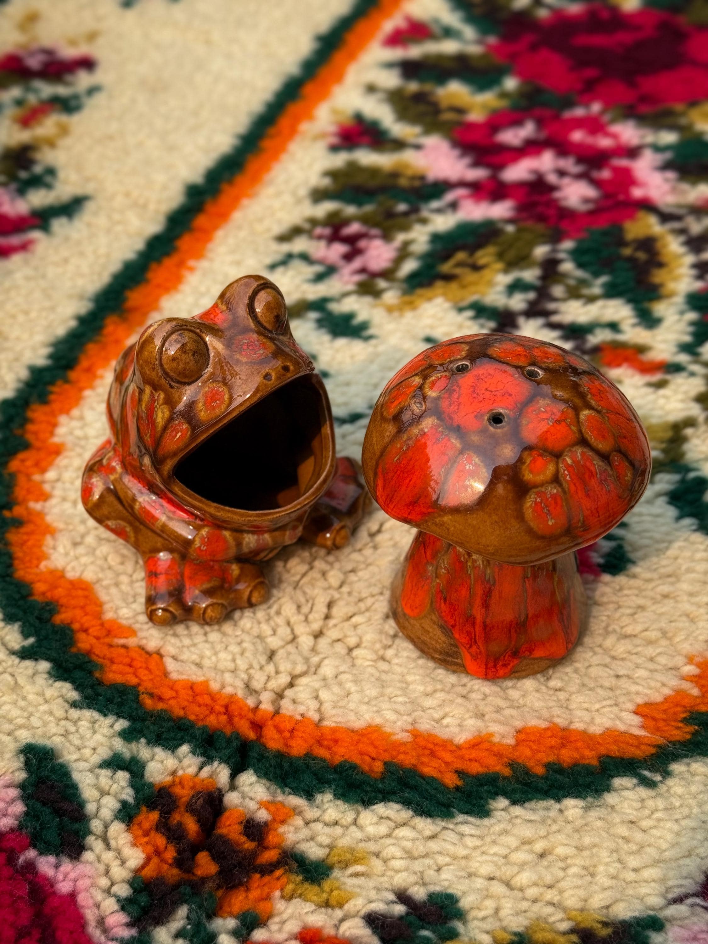 Mid century classics in those ohhhh-so-70’s colours. Ceramic Arnel’s scrubby frog, no chips or cracks, 4.5 x 4.5 x 4.5 inches / Ceramic Arnel’s mushroom shaker with a silicon stopper, no chips or cracks, 4 inches in diameter x 4.5 inches tall
