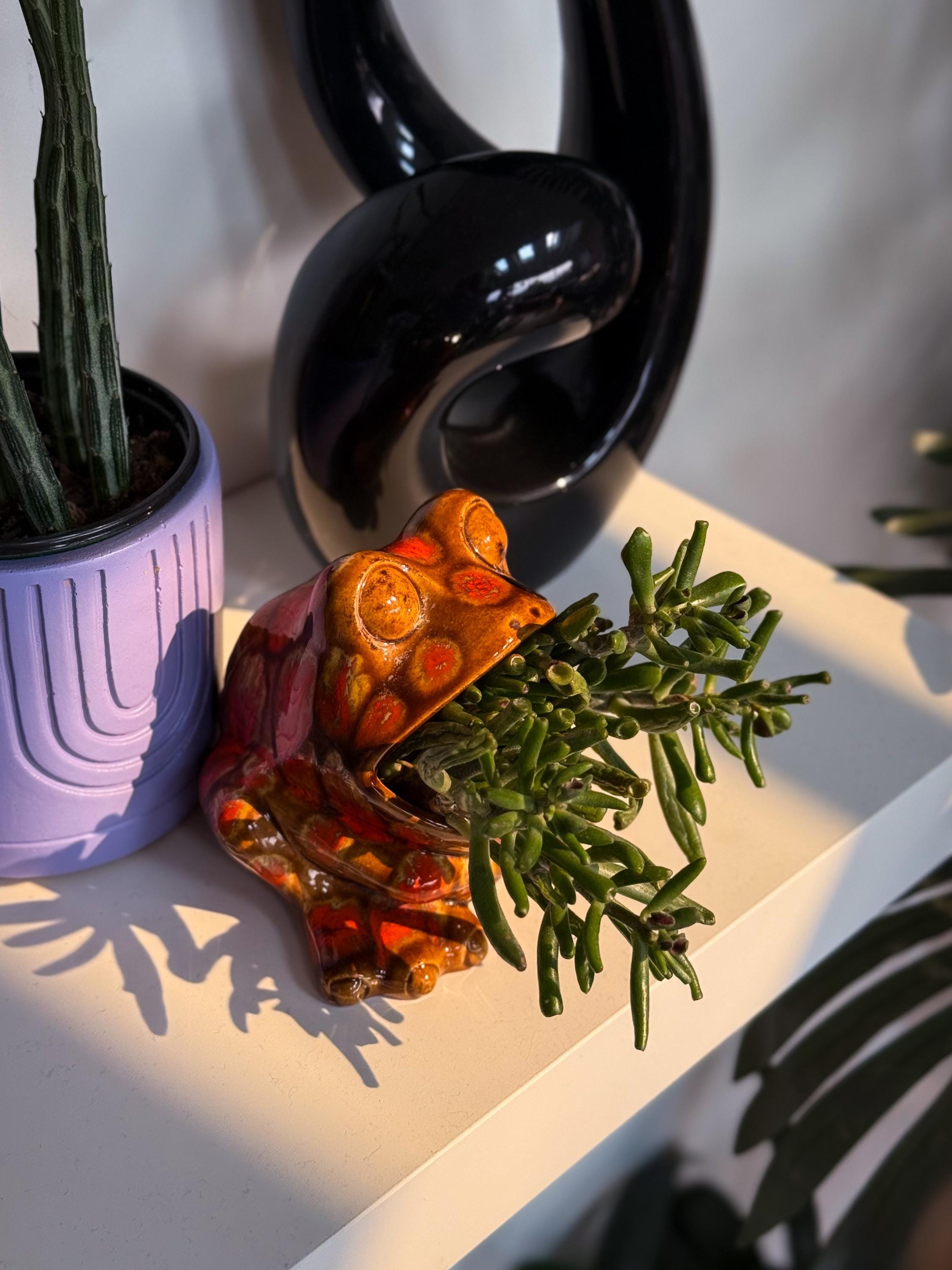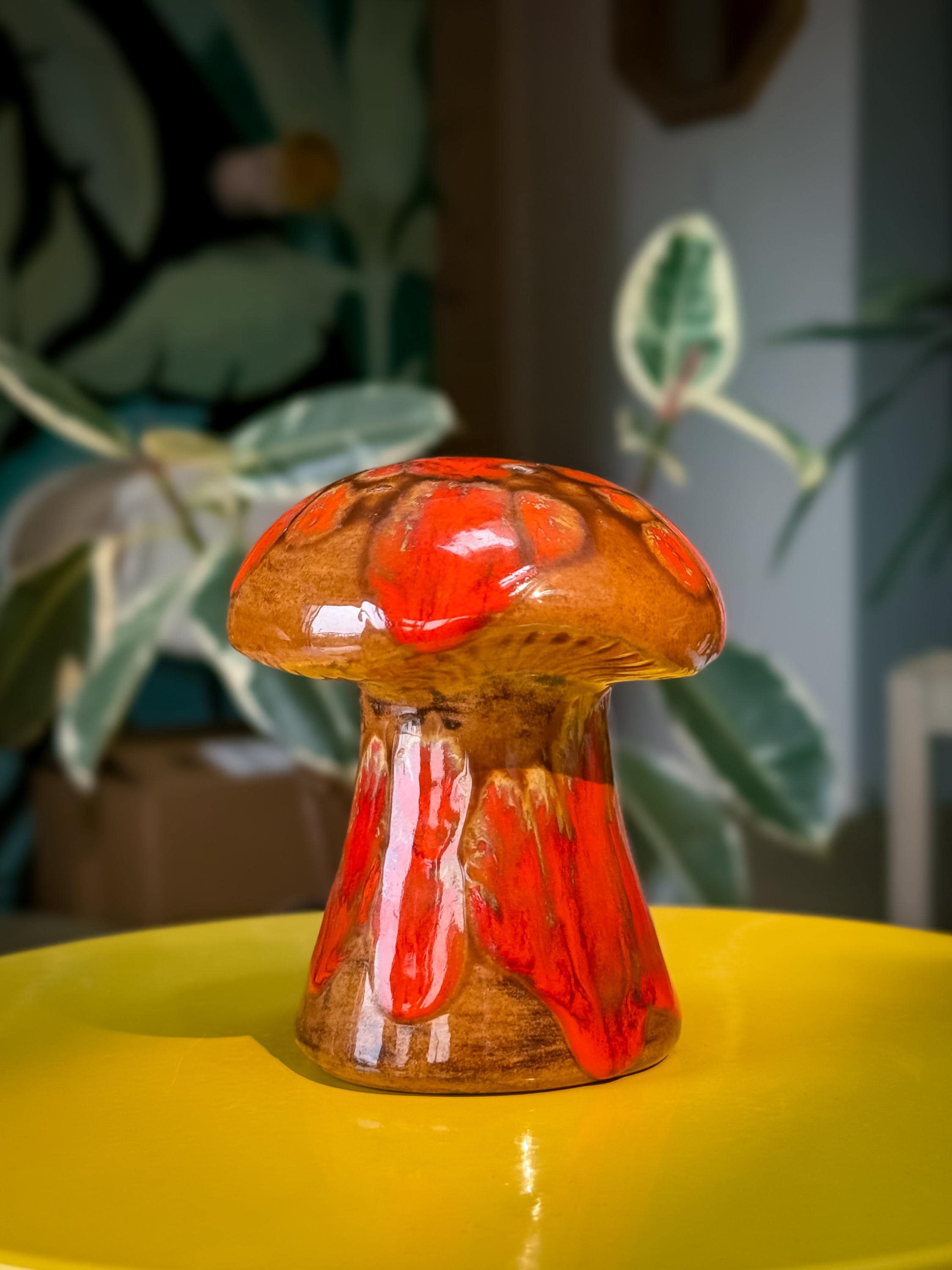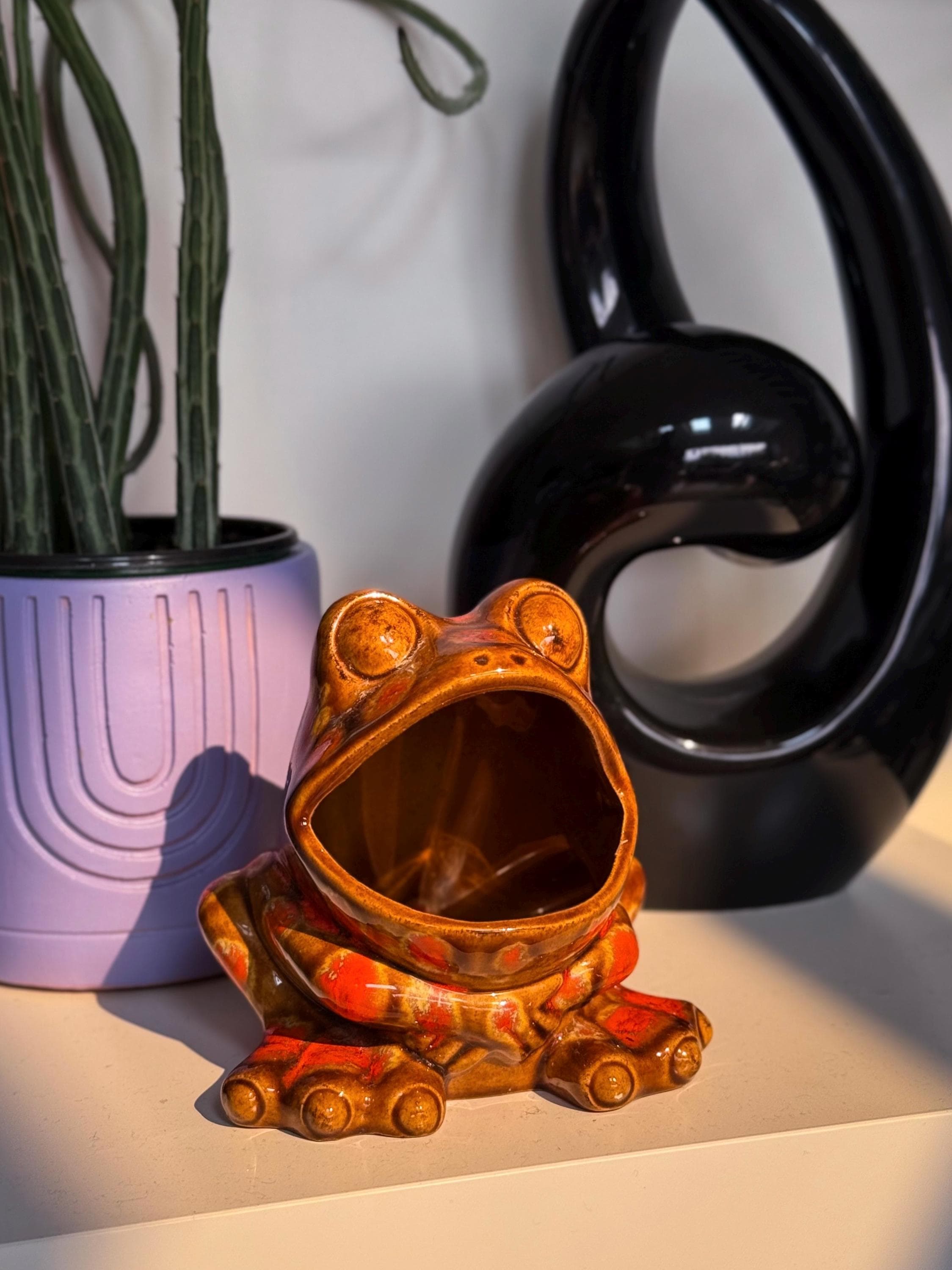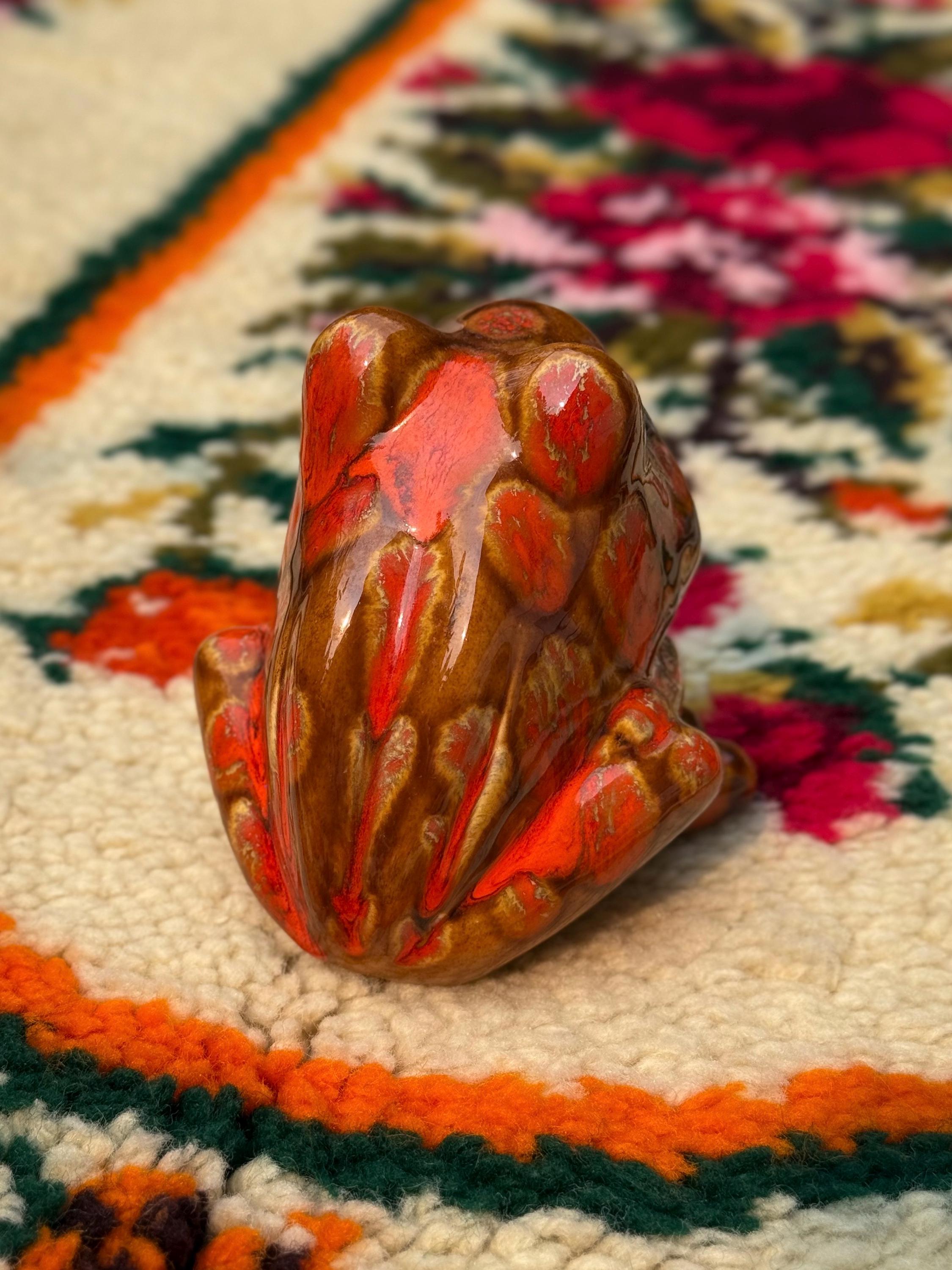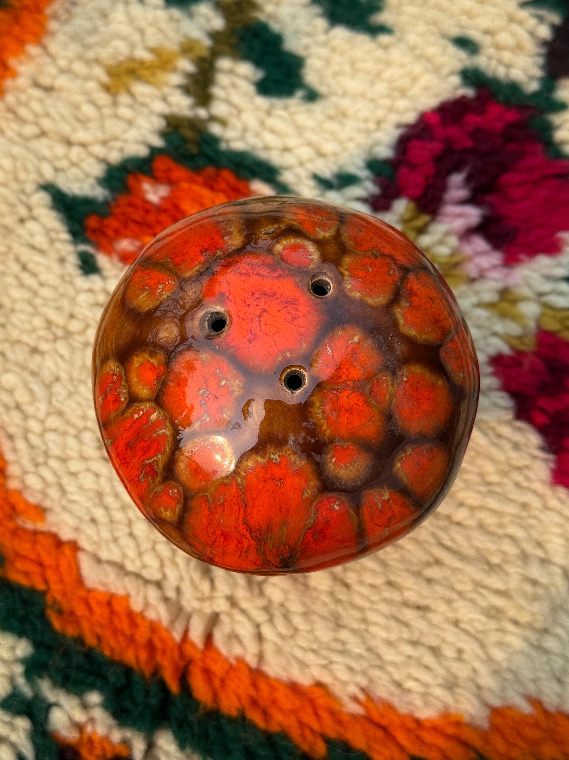Mid century classics in those ohhhh-so-70’s colours. Ceramic Arnel’s scrubby frog, no chips or cracks, 4.5 x 4.5 x 4.5 inches / Ceramic Arnel’s mushroom shaker with a silicon stopper, no chips or cracks, 4 inches in diameter x 4.5 inches tall