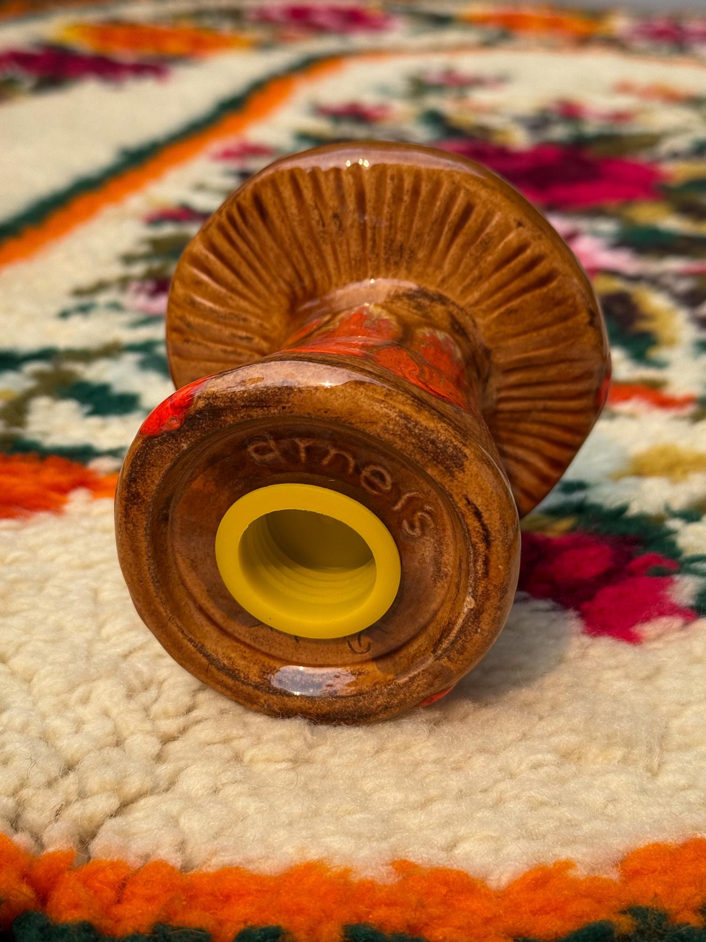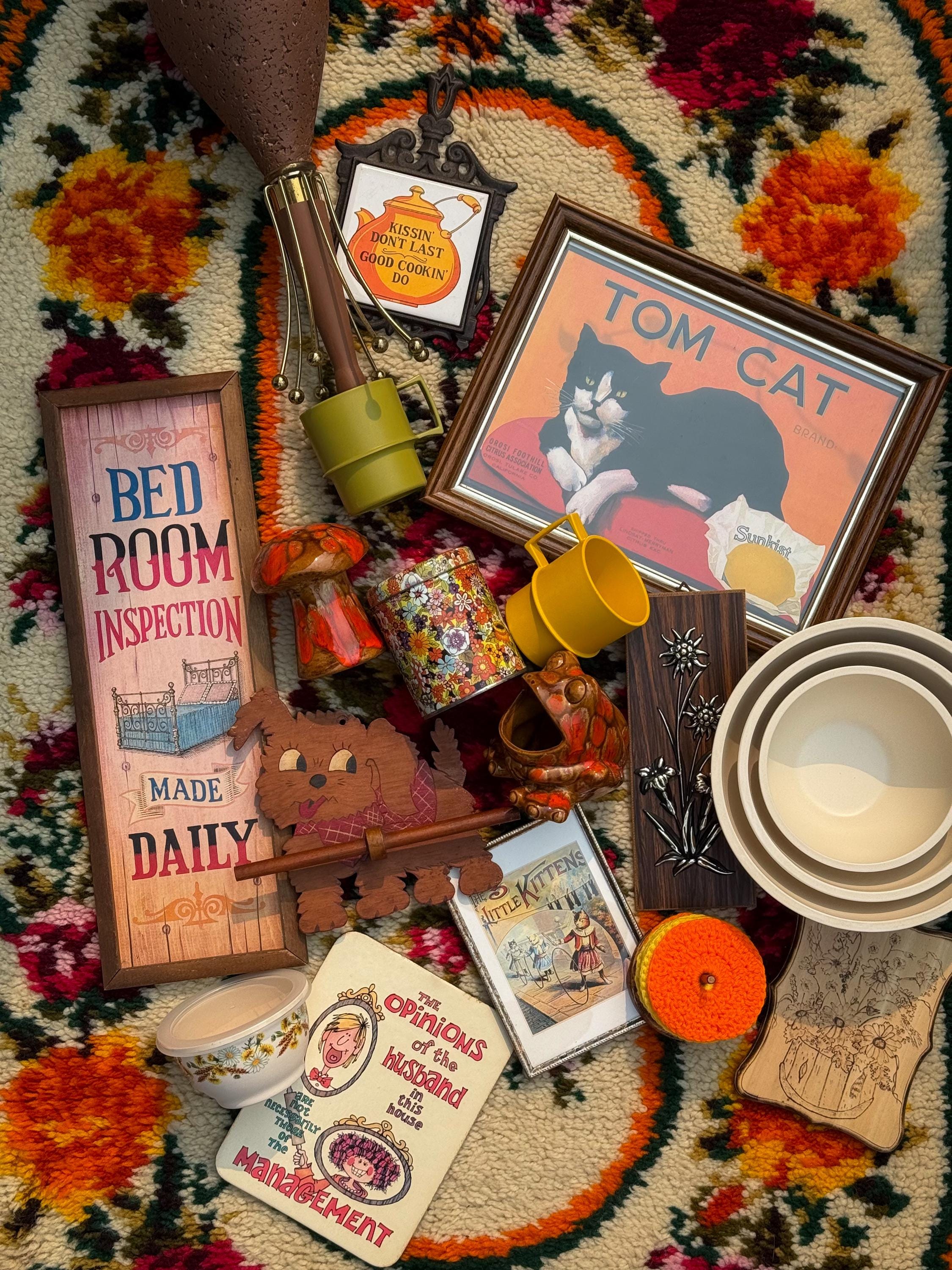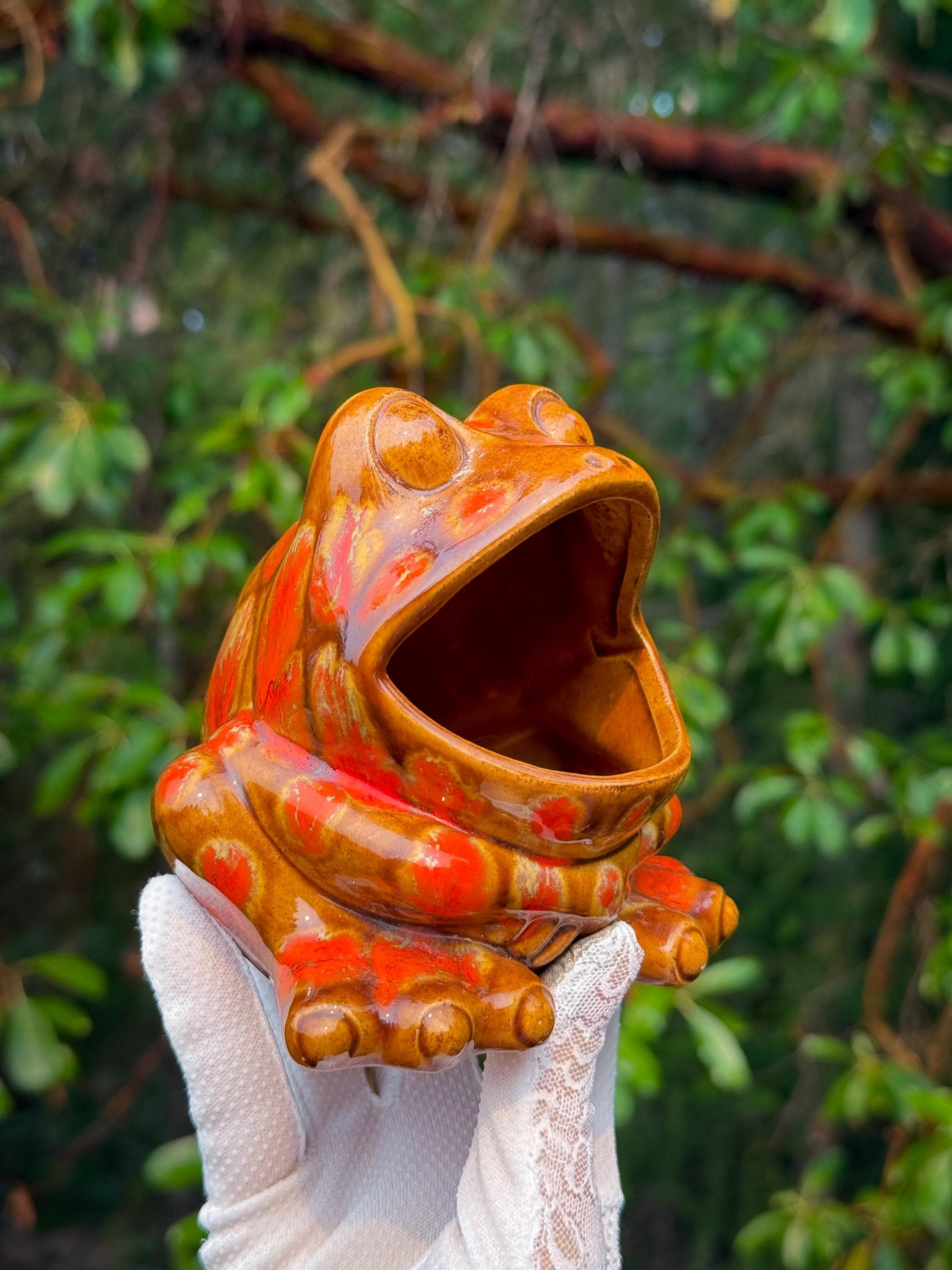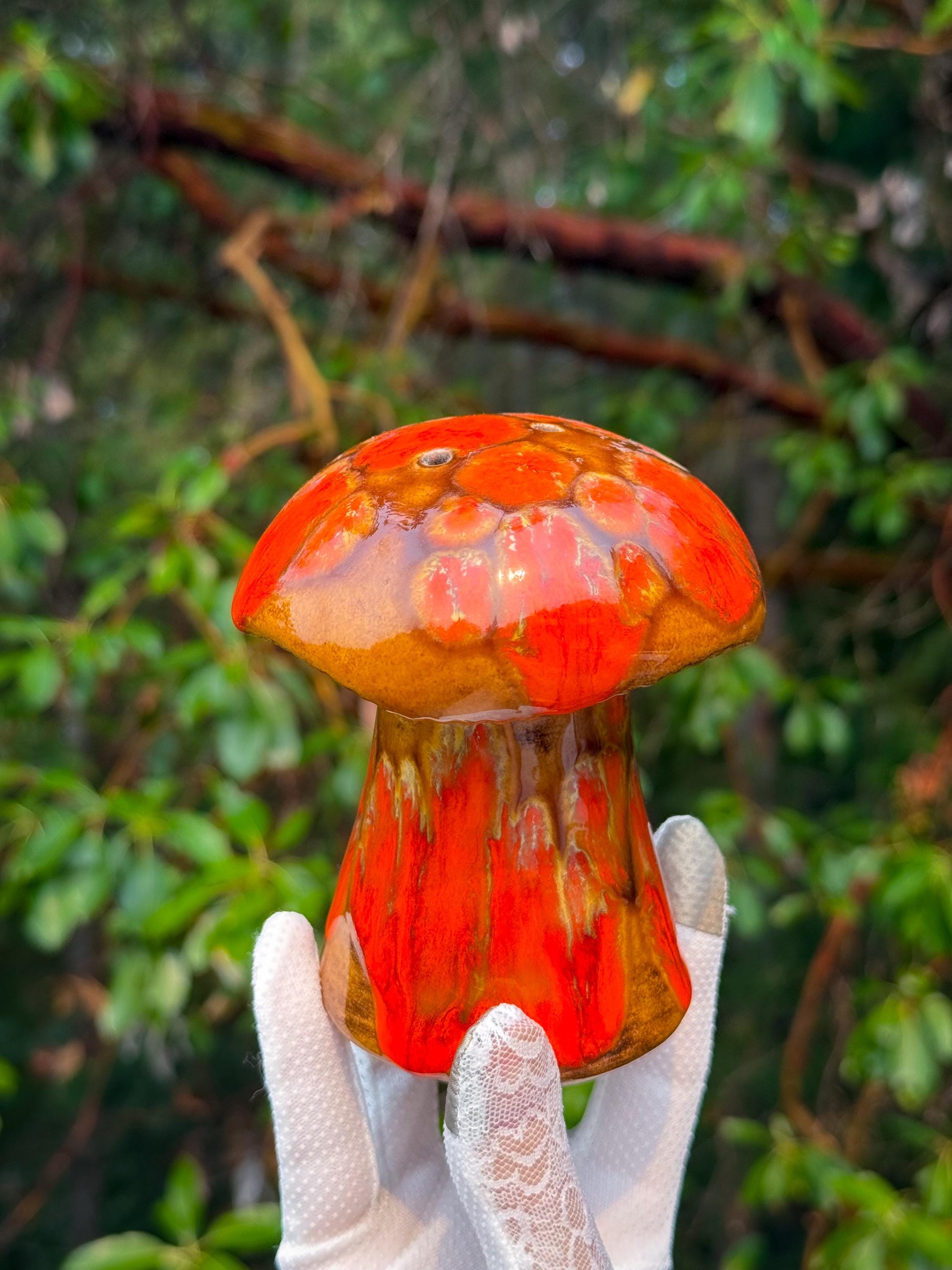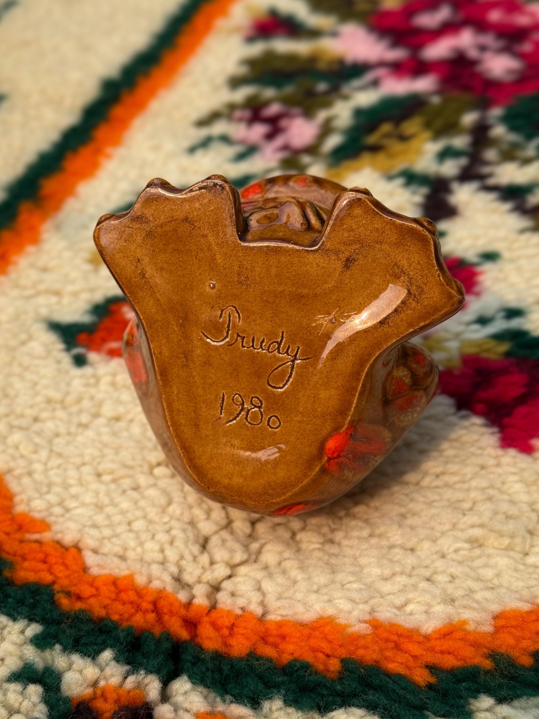 Mid century classics in those ohhhh-so-70’s colours. Ceramic Arnel’s scrubby frog, no chips or cracks, 4.5 x 4.5 x 4.5 inches / Ceramic Arnel’s mushroom shaker with a silicon stopper, no chips or cracks, 4 inches in diameter x 4.5 inches tall