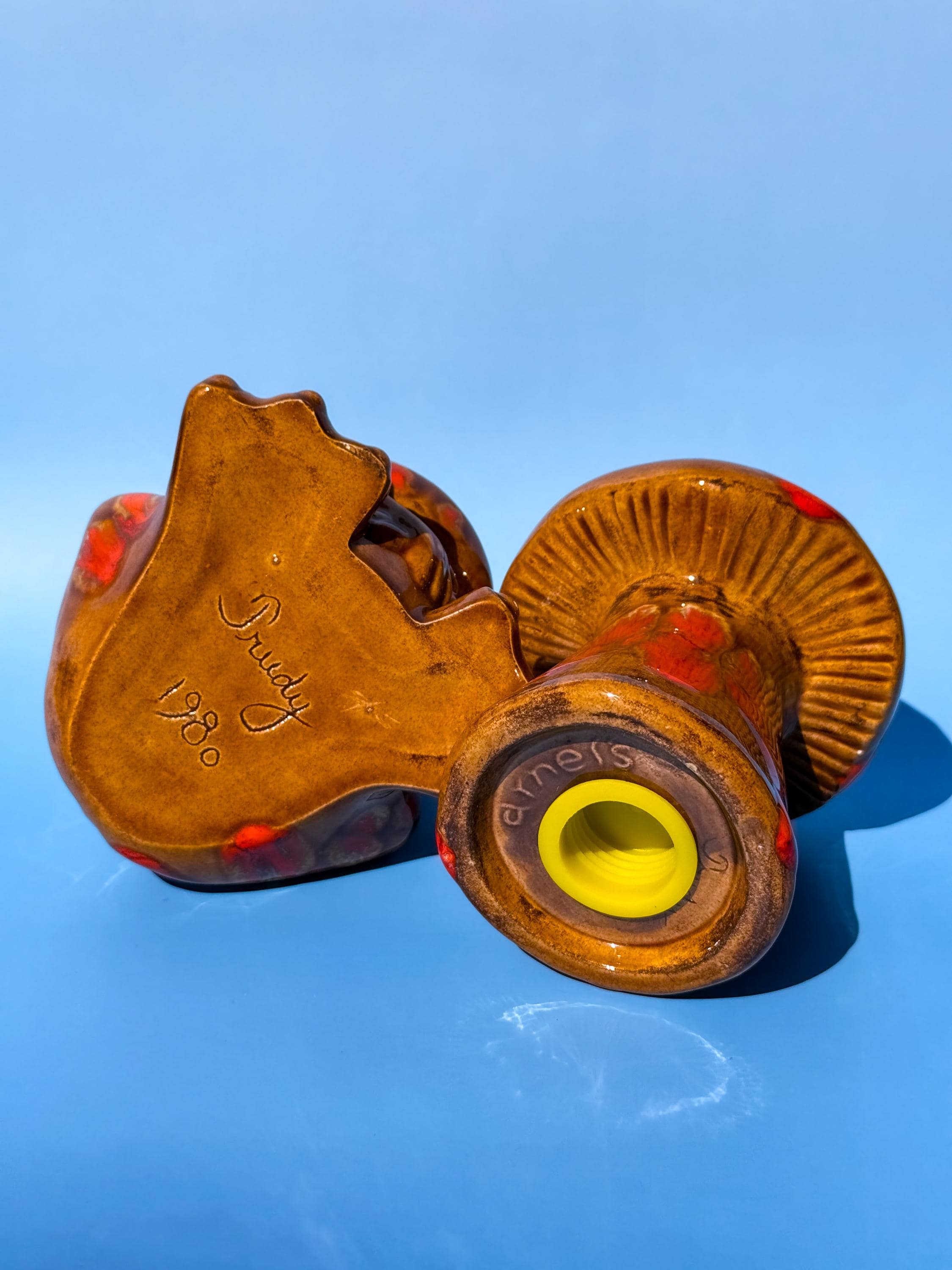 Mid century classic Arnel’s mushroom shaker in those ohhhh-so-70’s colours. Ceramic with a silicon stopper, with no chips or cracks.