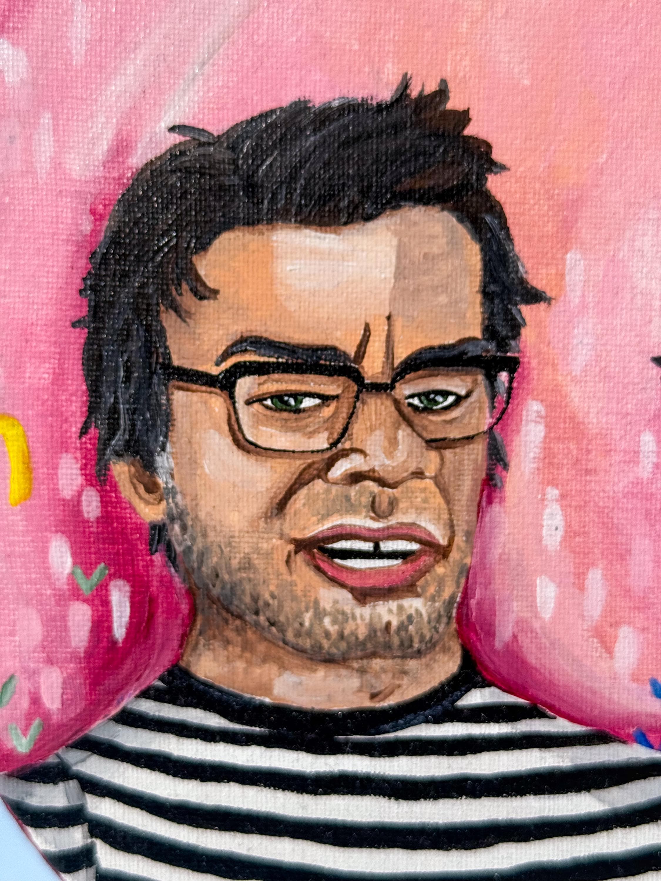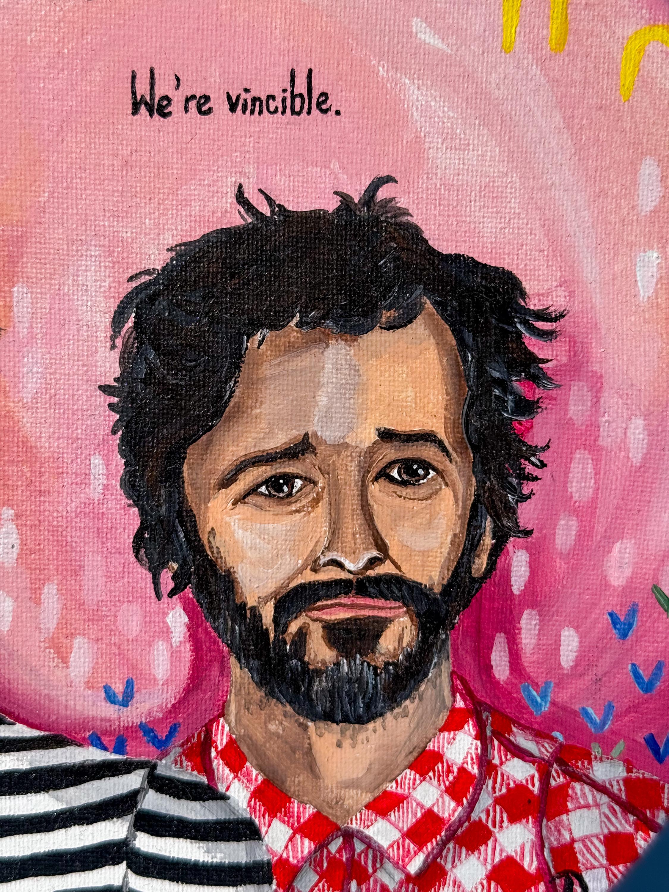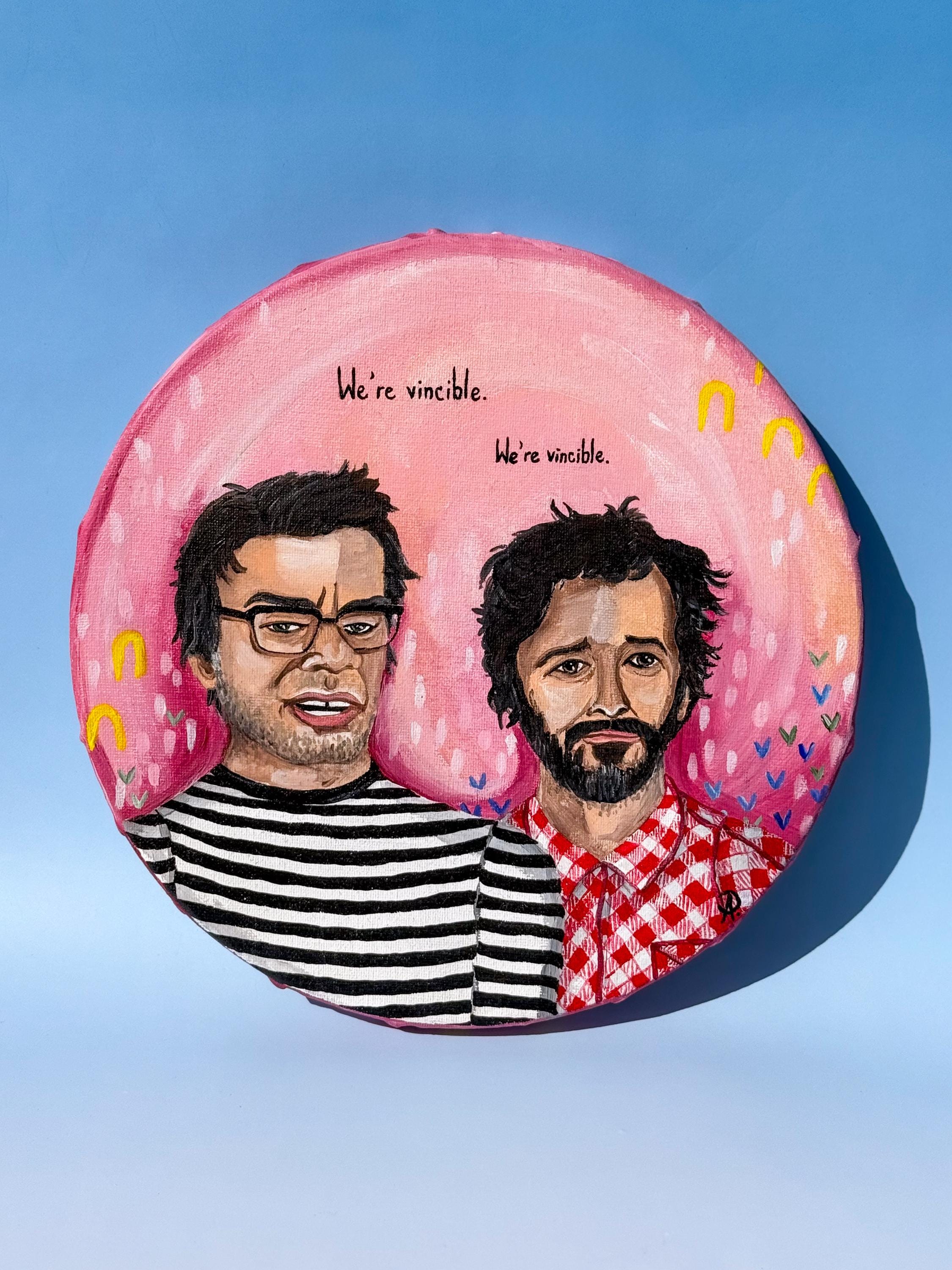 Jemaine Clement and Bret McKenzie as the amazing Flight of the Concords, with lyrics from their song Hurt Feelings. Hand painted in acrylic on canvas.